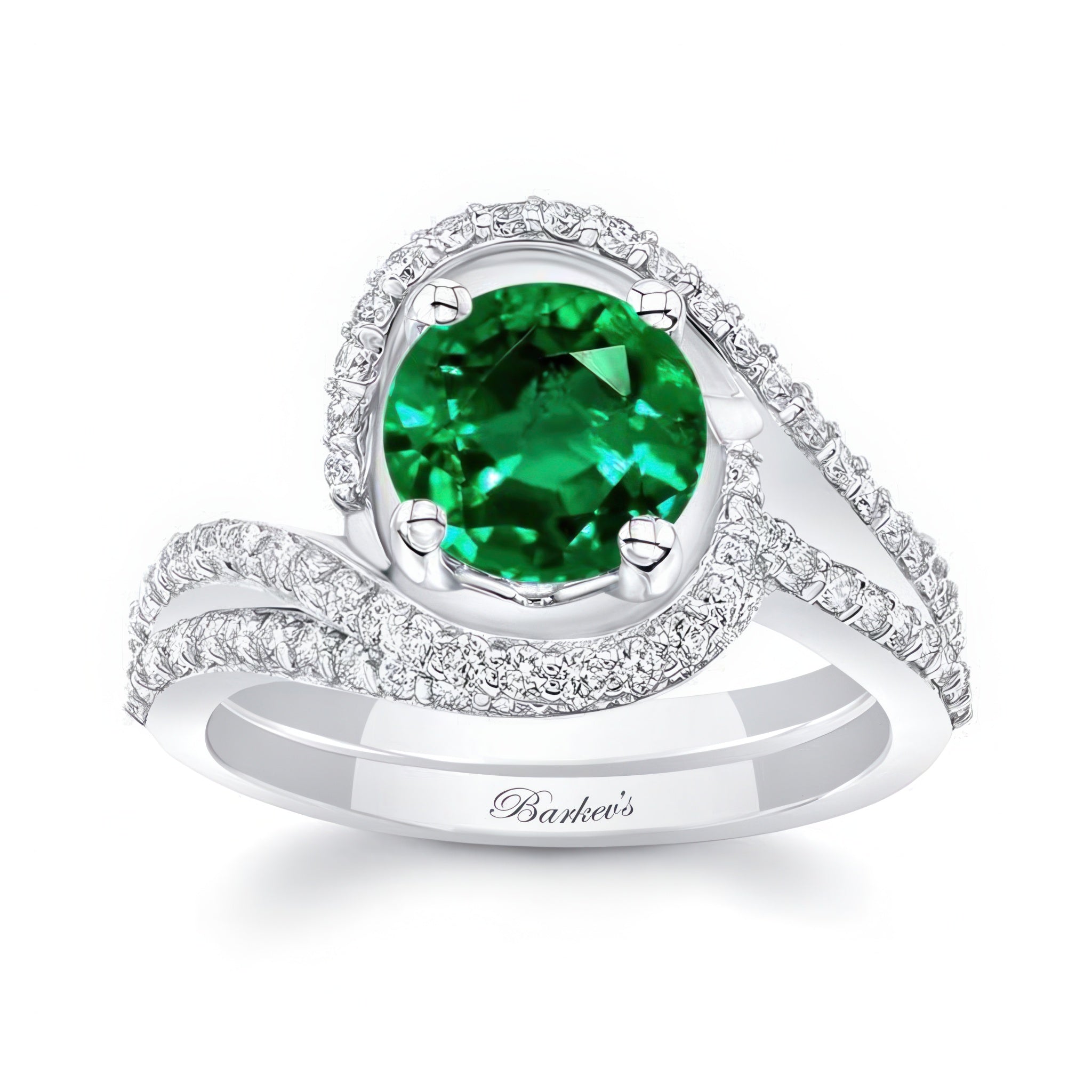 An elegant floating halo emerald and diamond bridal set with a round center and a split shank that wraps around the center adorned with micro pave diamonds for added sparkle. Comes with a matching wedding band.