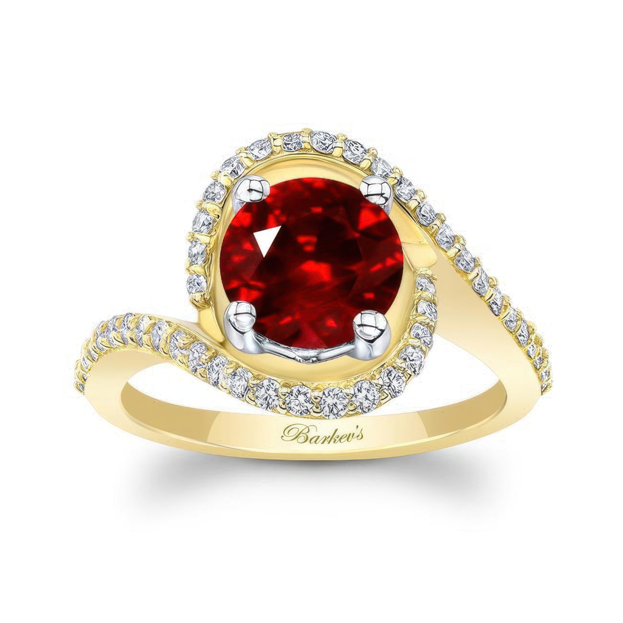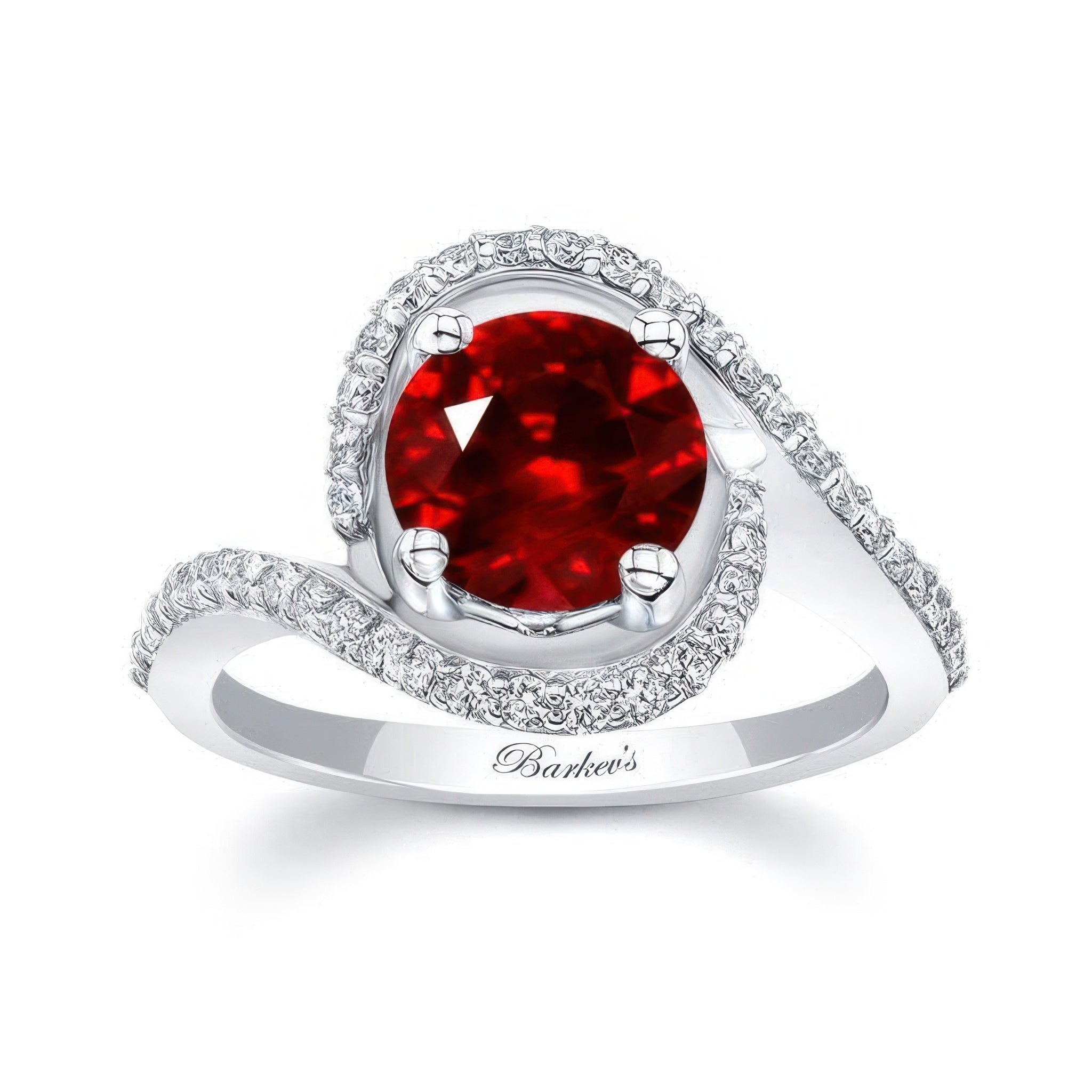 An elegant floating halo ruby and diamond engagement ring with a round center and a split shank that wraps around the center adorned with micro pave diamonds for added sparkle.