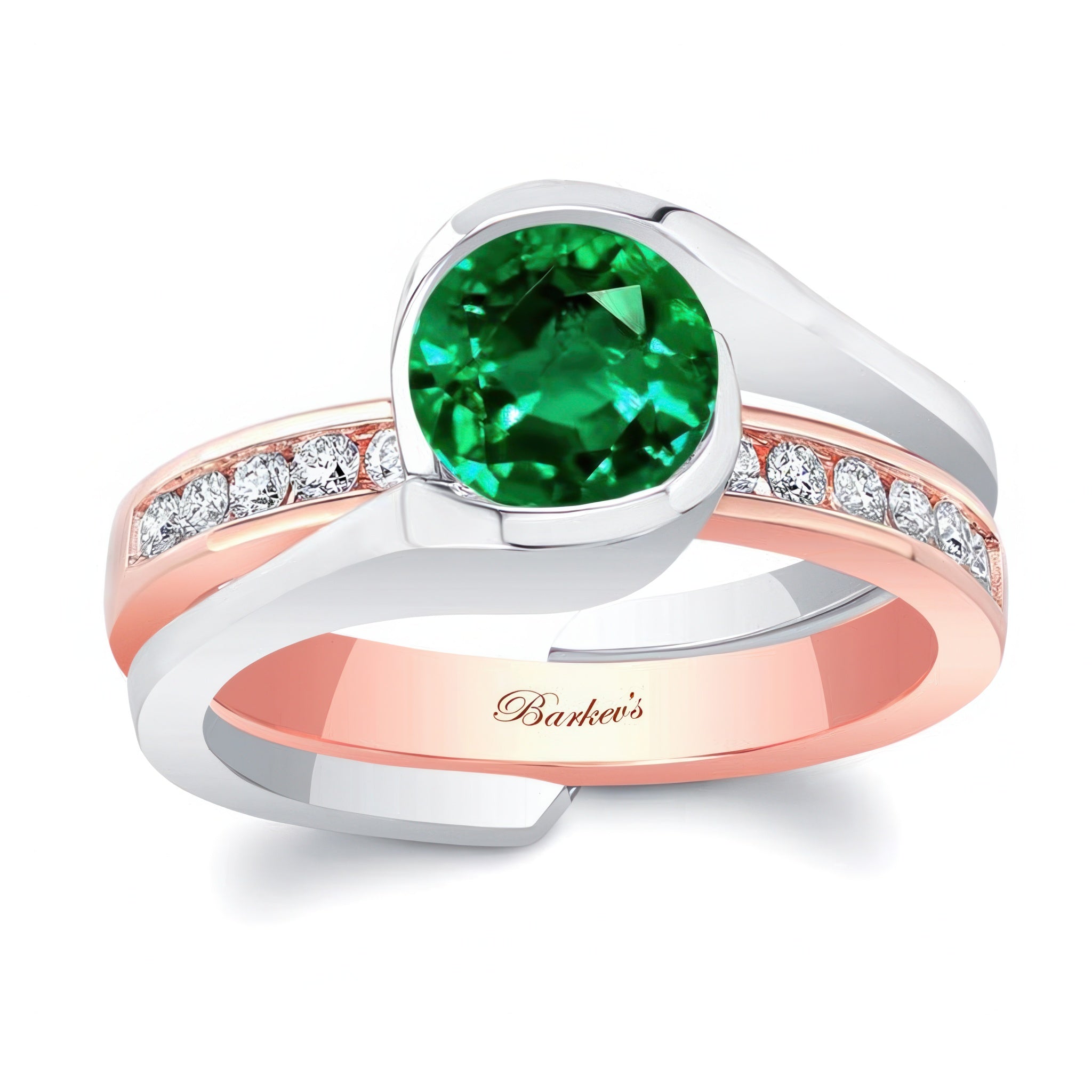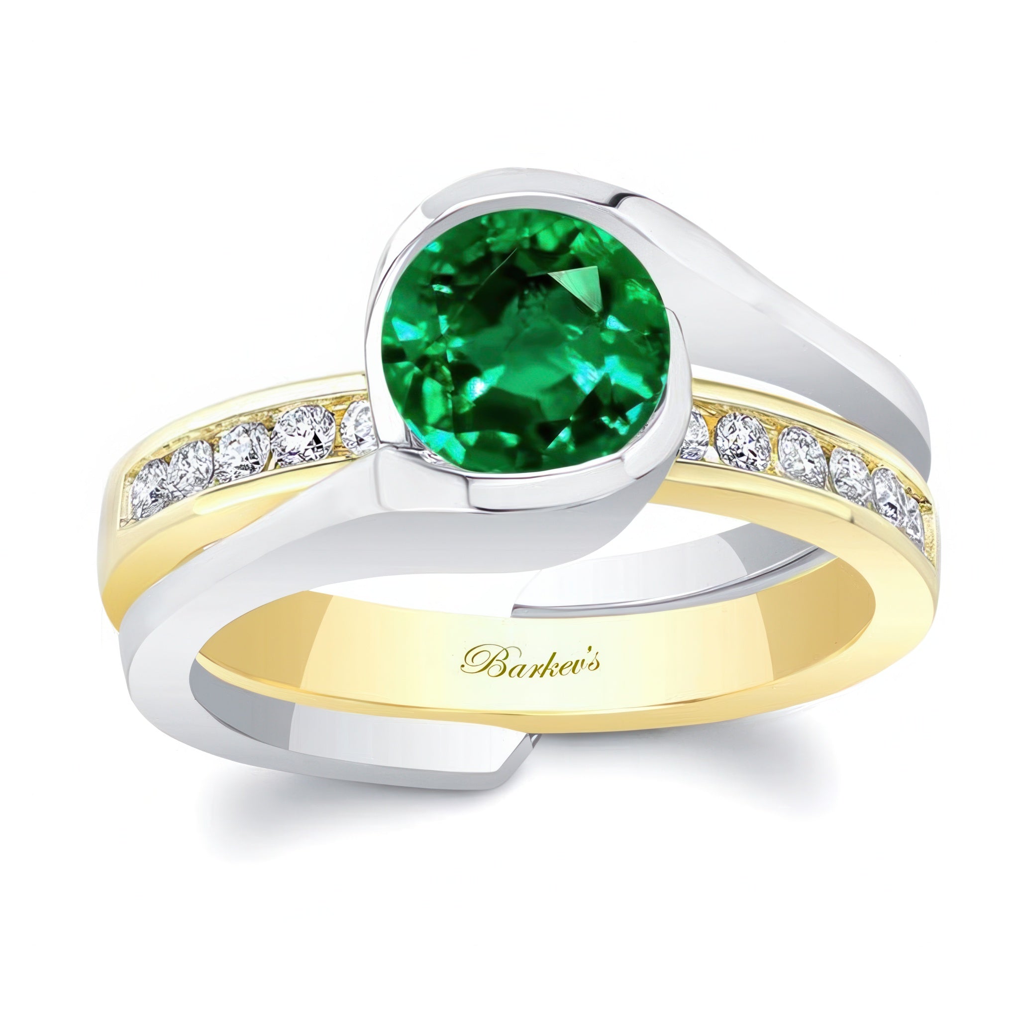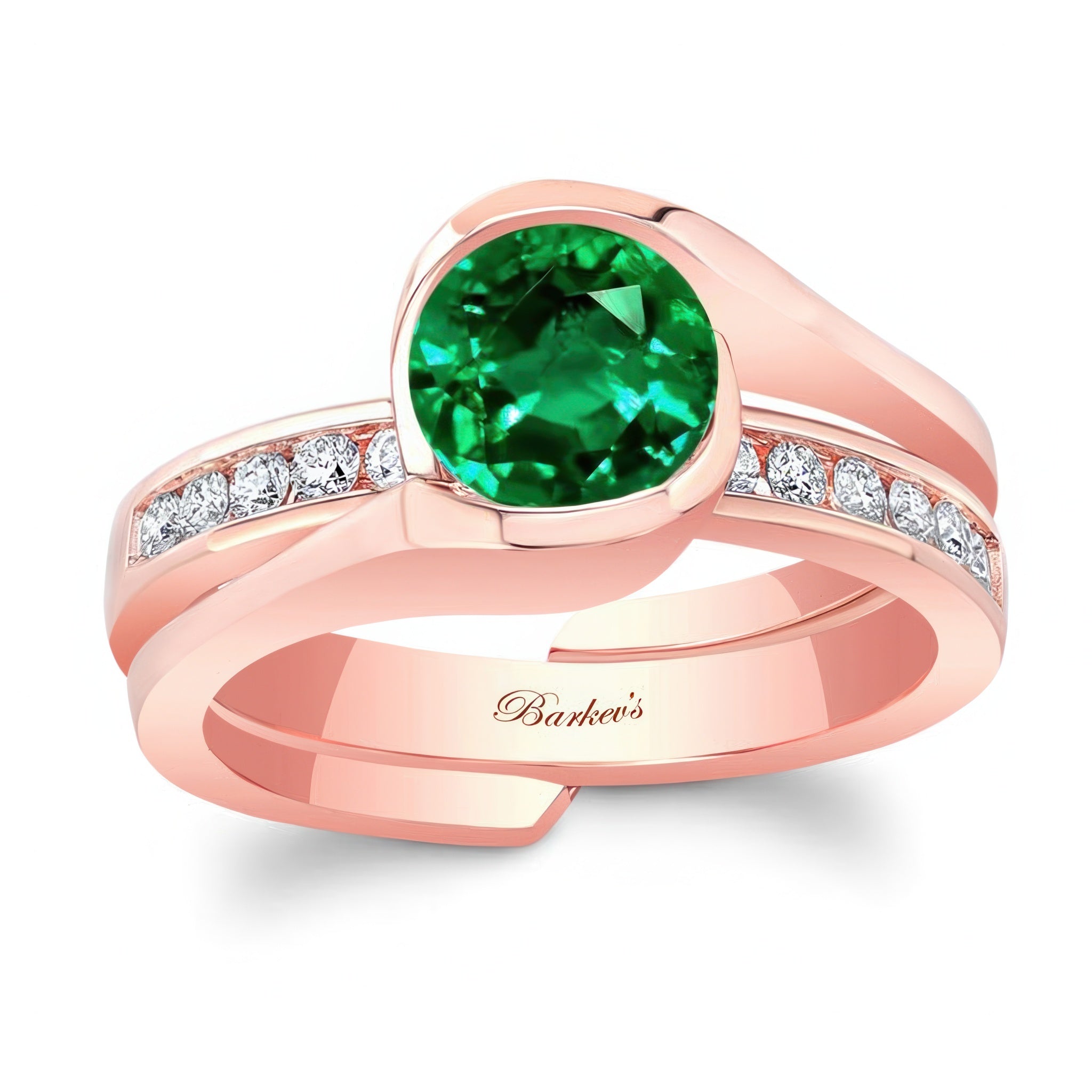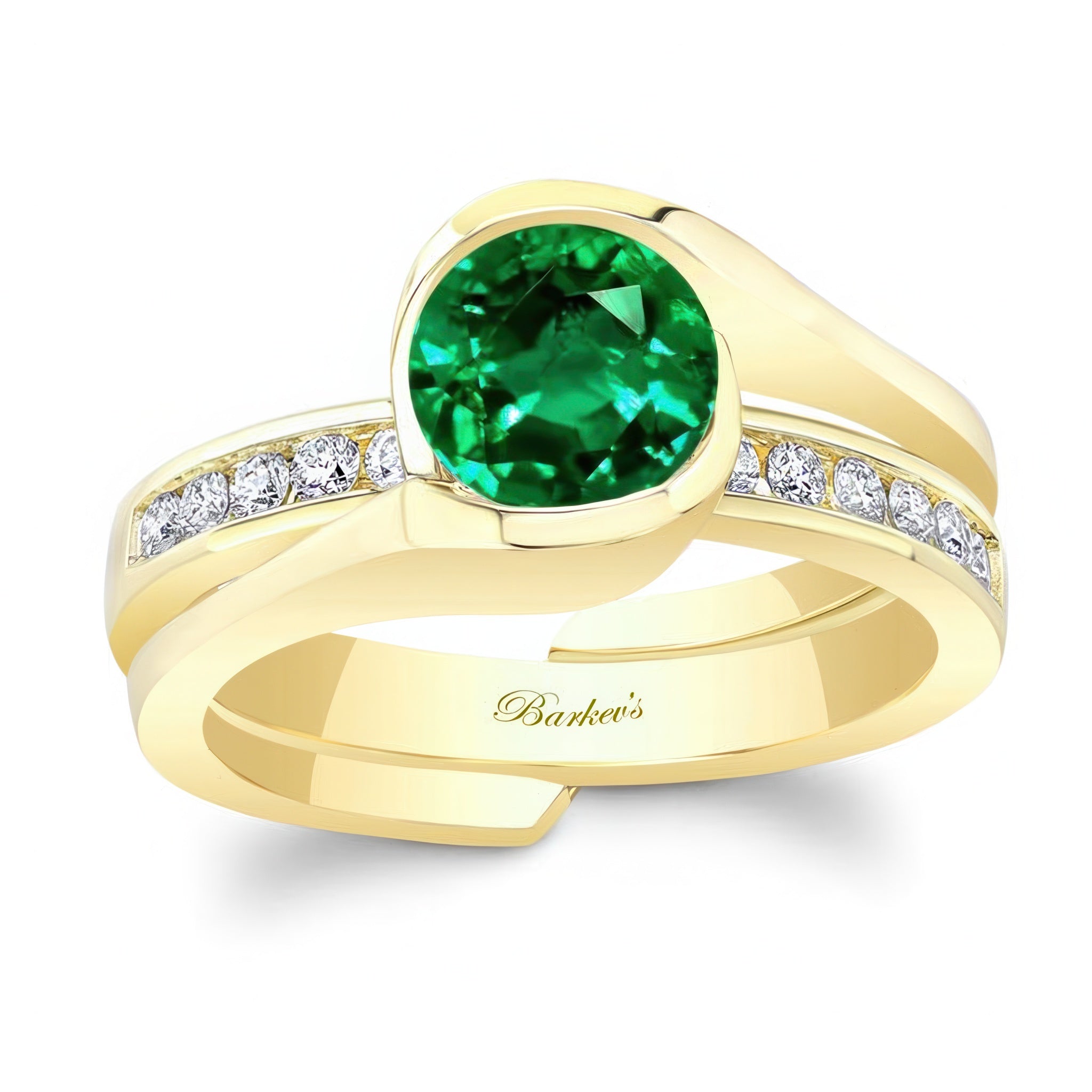 This half bezel emerald and diamond interlocking bridal set features a classic round center and a channel set diamond wedding band that slips into the ring for a display of true elegance.