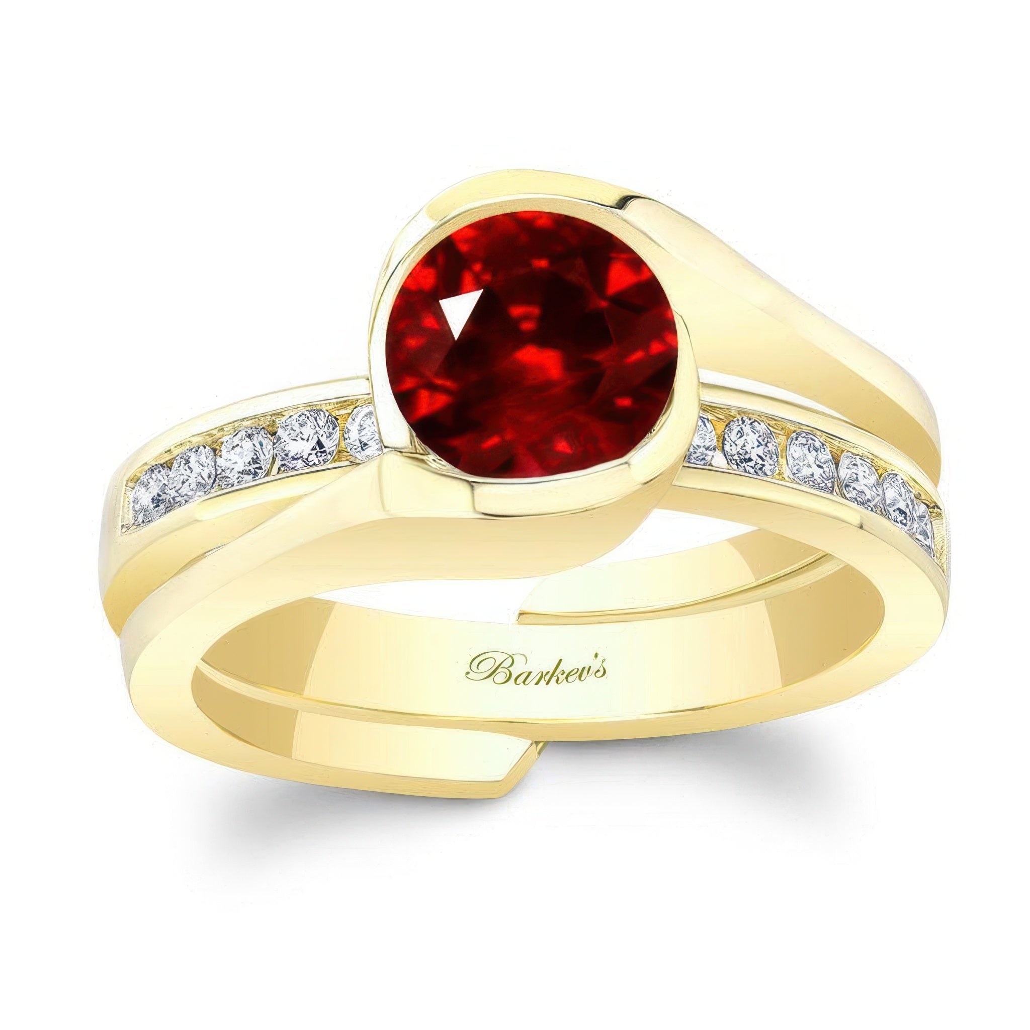 This half bezel ruby and diamond interlocking bridal set features a classic round center and a channel set diamond wedding band that slips into the ring for a display of true elegance.