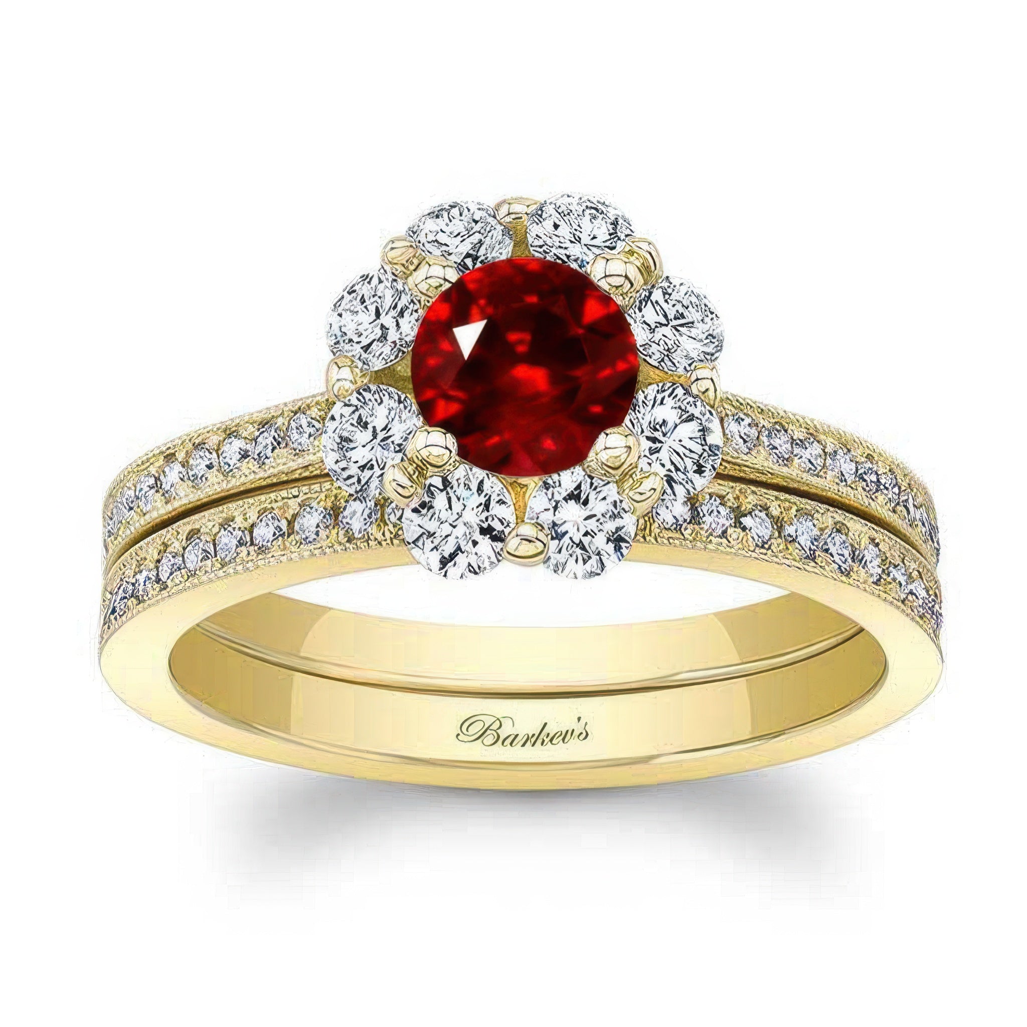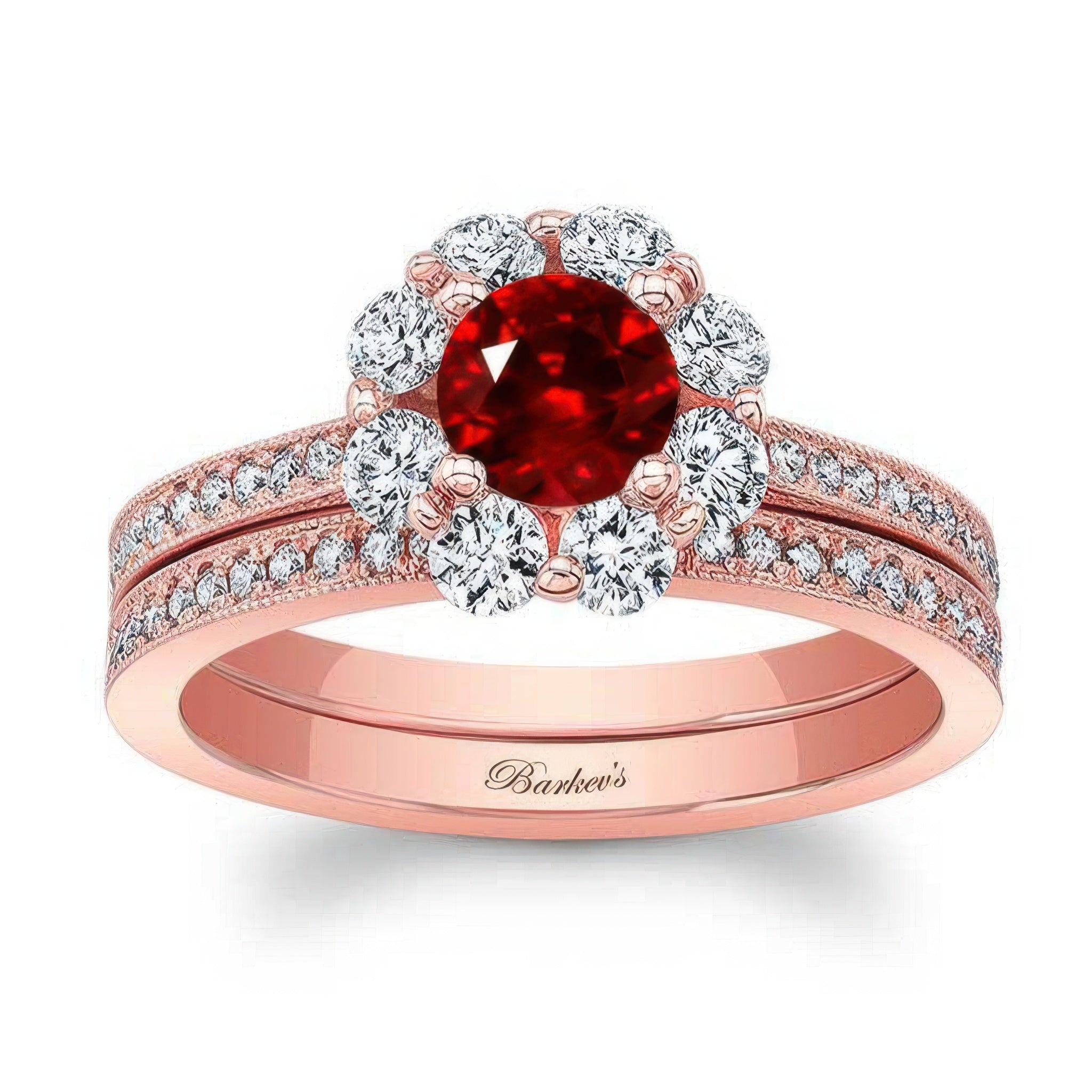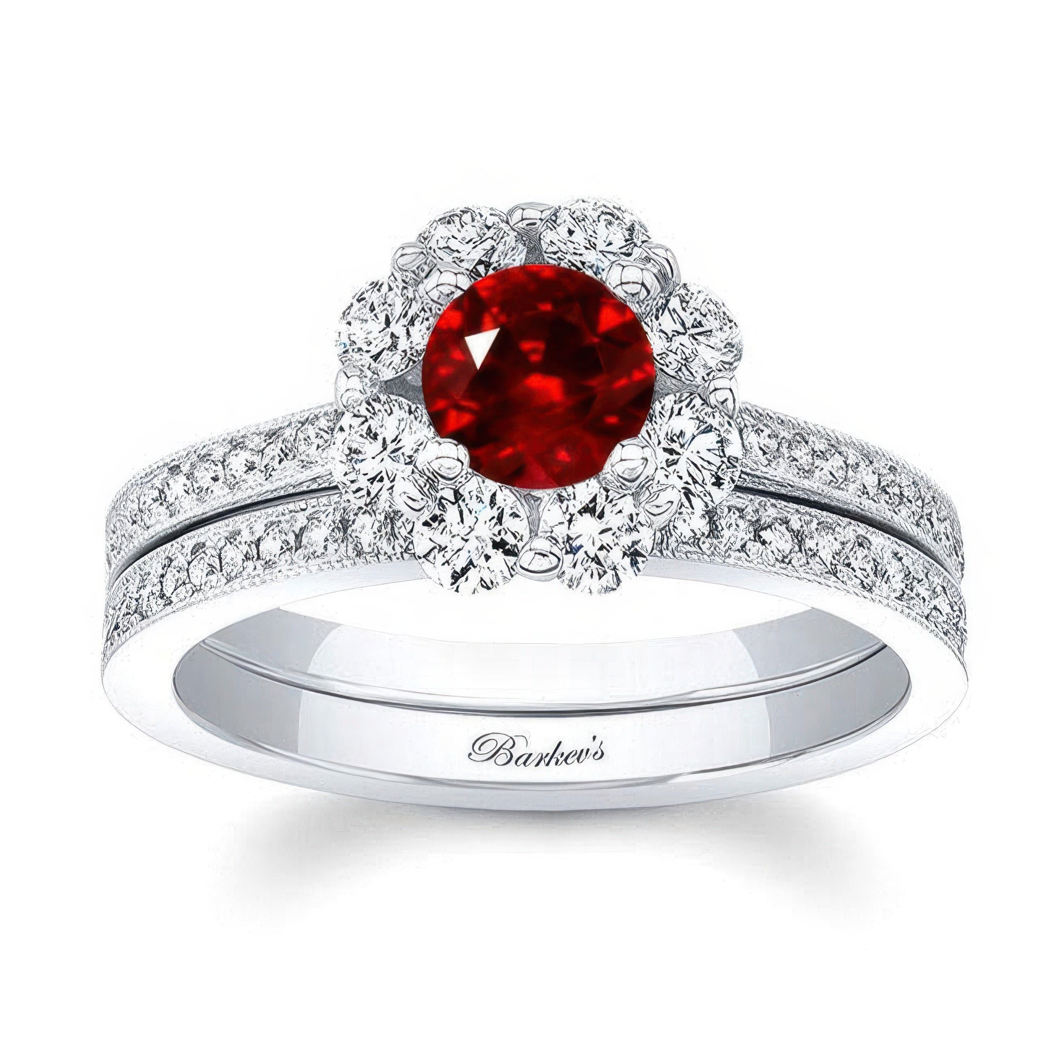 This halo ruby and diamond ring set features a prong set round center encircled with a diamond halo and a narrow shank adorned with pave set diamonds and accented with a milgrain finish. Comes with a matching diamond wedding band.