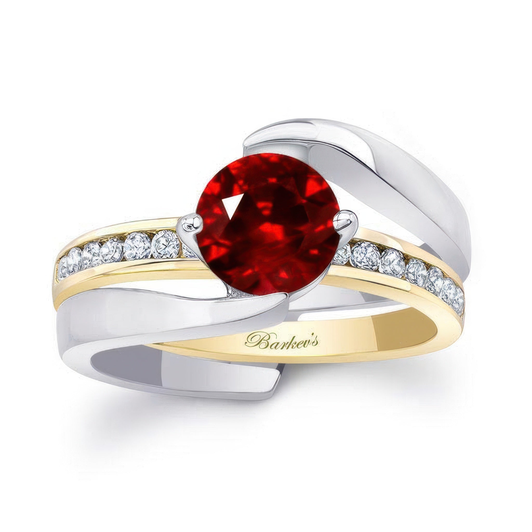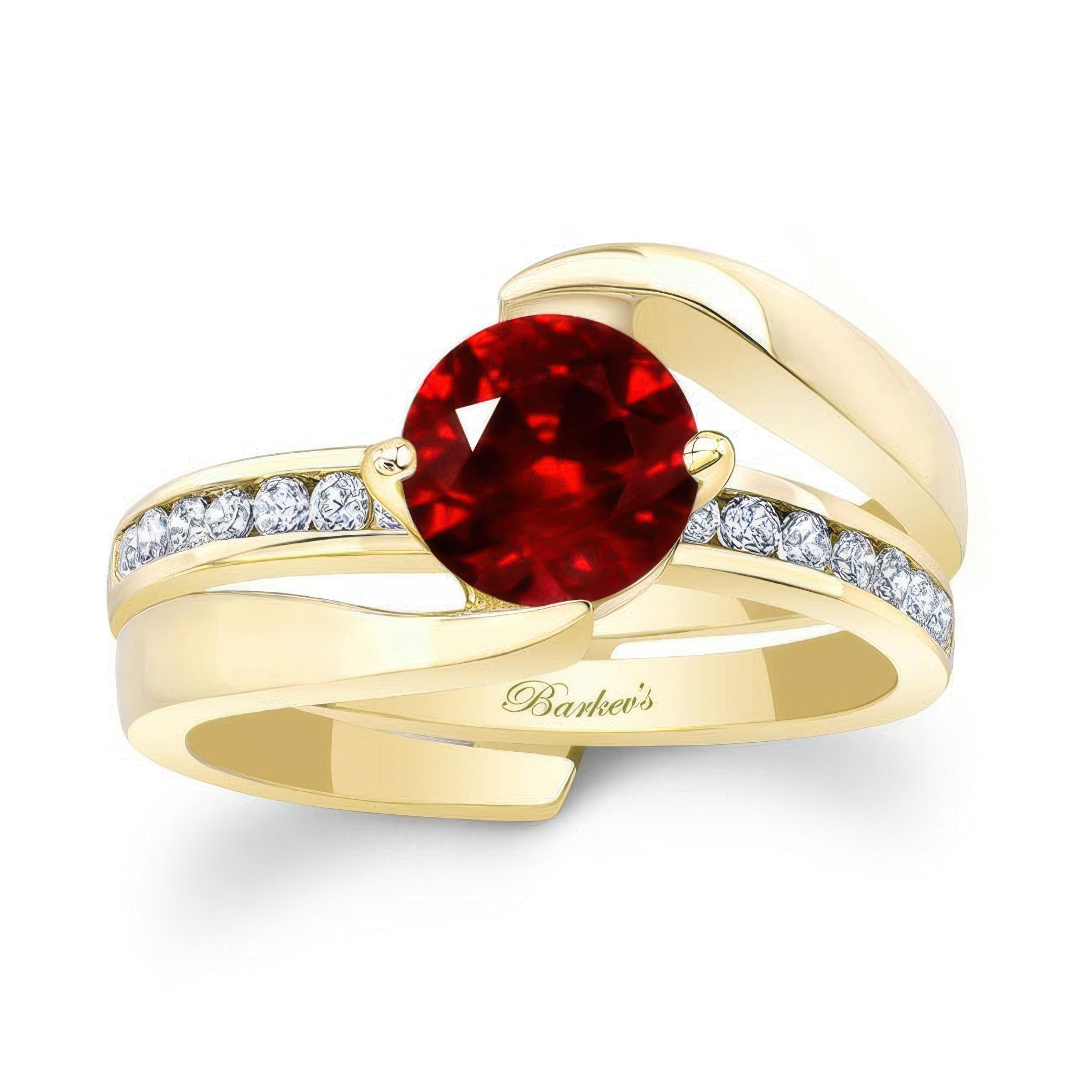 This interlocking ruby and diamond wedding ring set features a round center cradled in a bypass setting and a channel set diamond wedding band that can be slipped into the interlocking shank for an added touch of luxury.