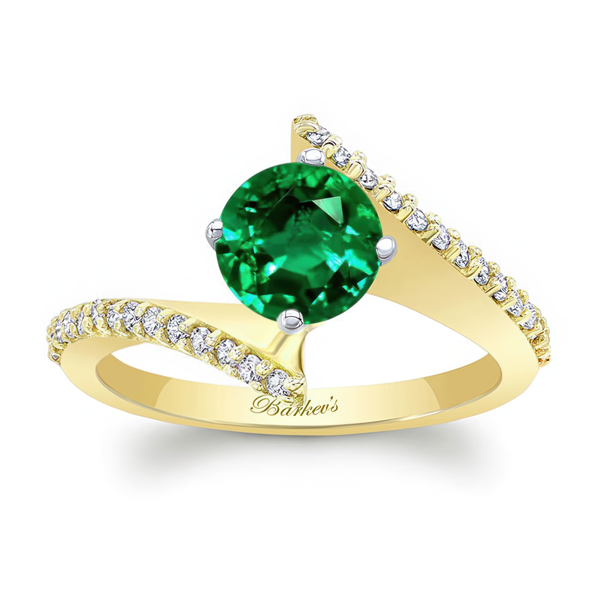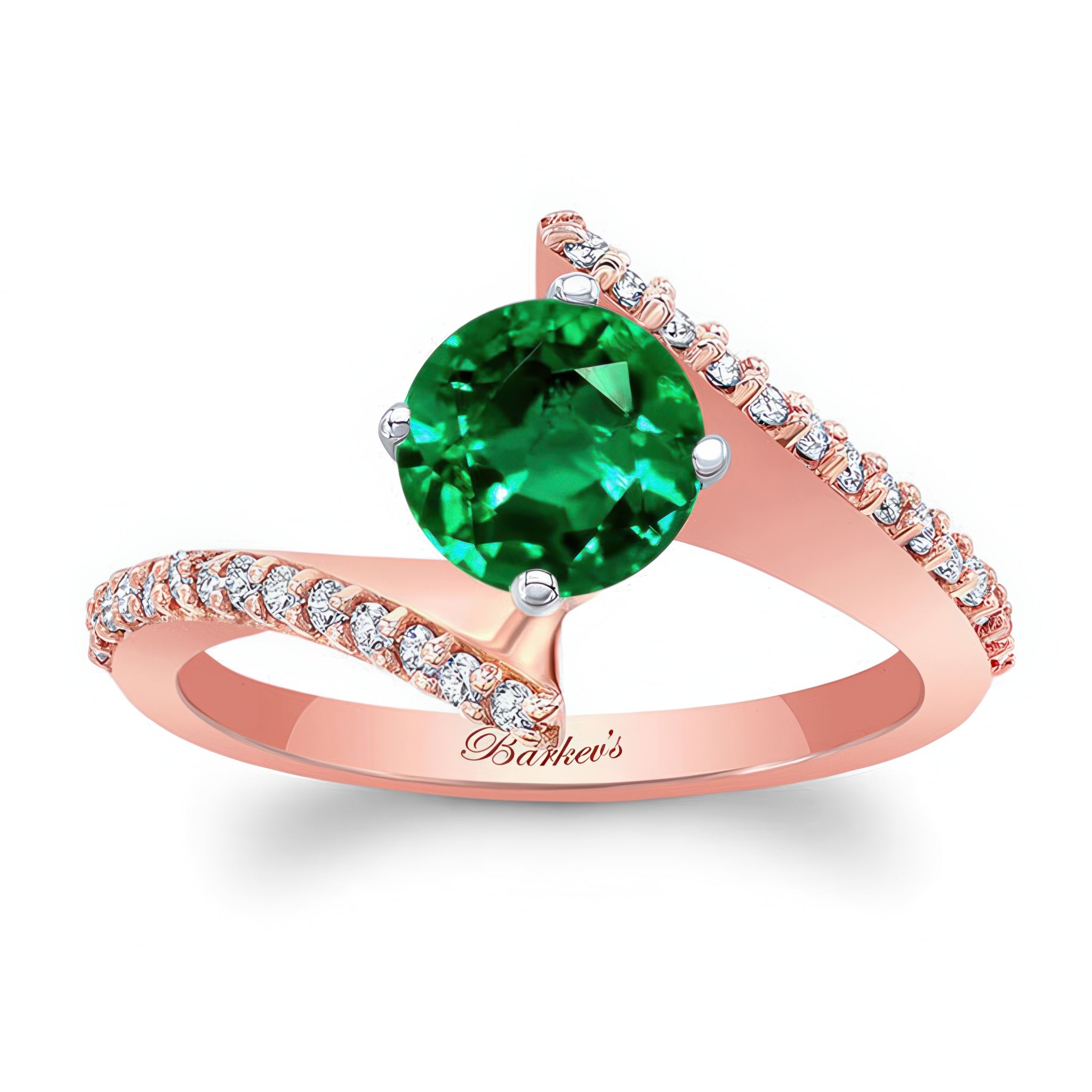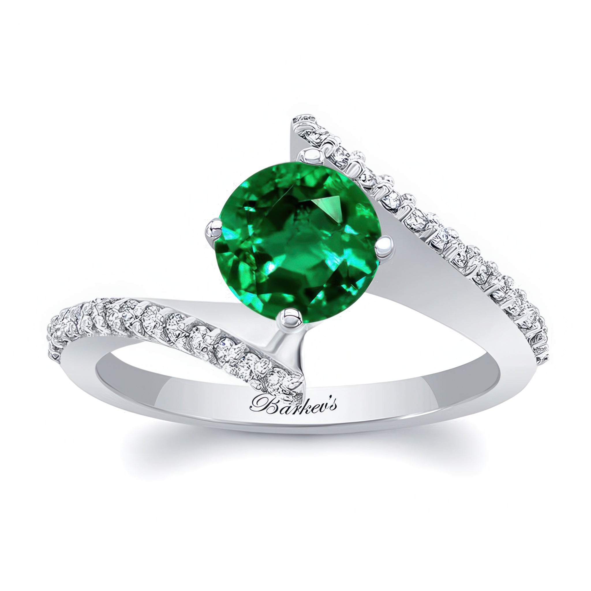 A stunning modern bypass emerald and diamond engagement ring featuring a prong set round center with sharing prong set diamonds gracing the ridges for a dramatic look sure to catch the eye of many admirers.