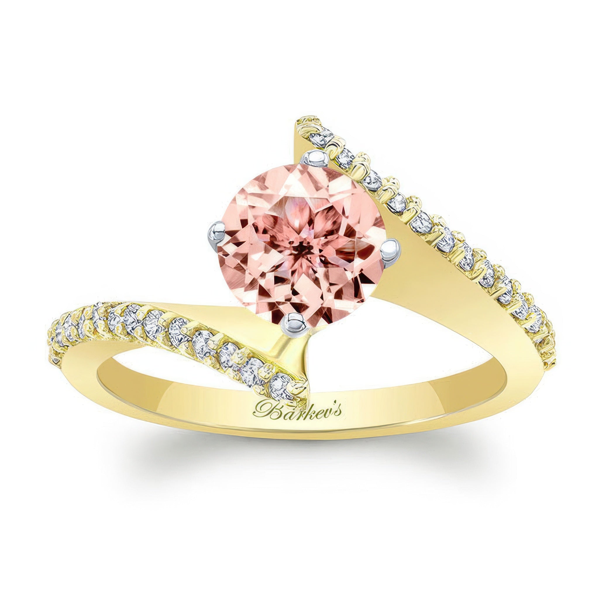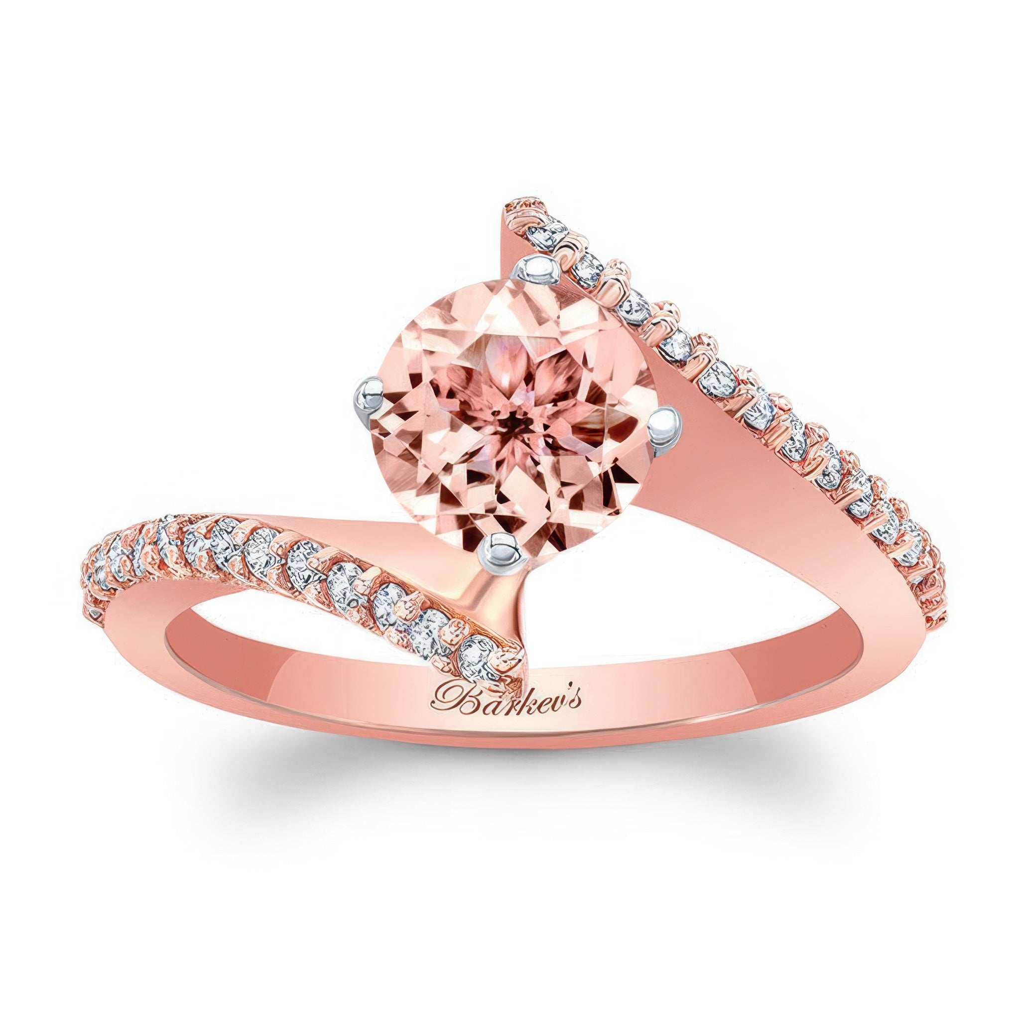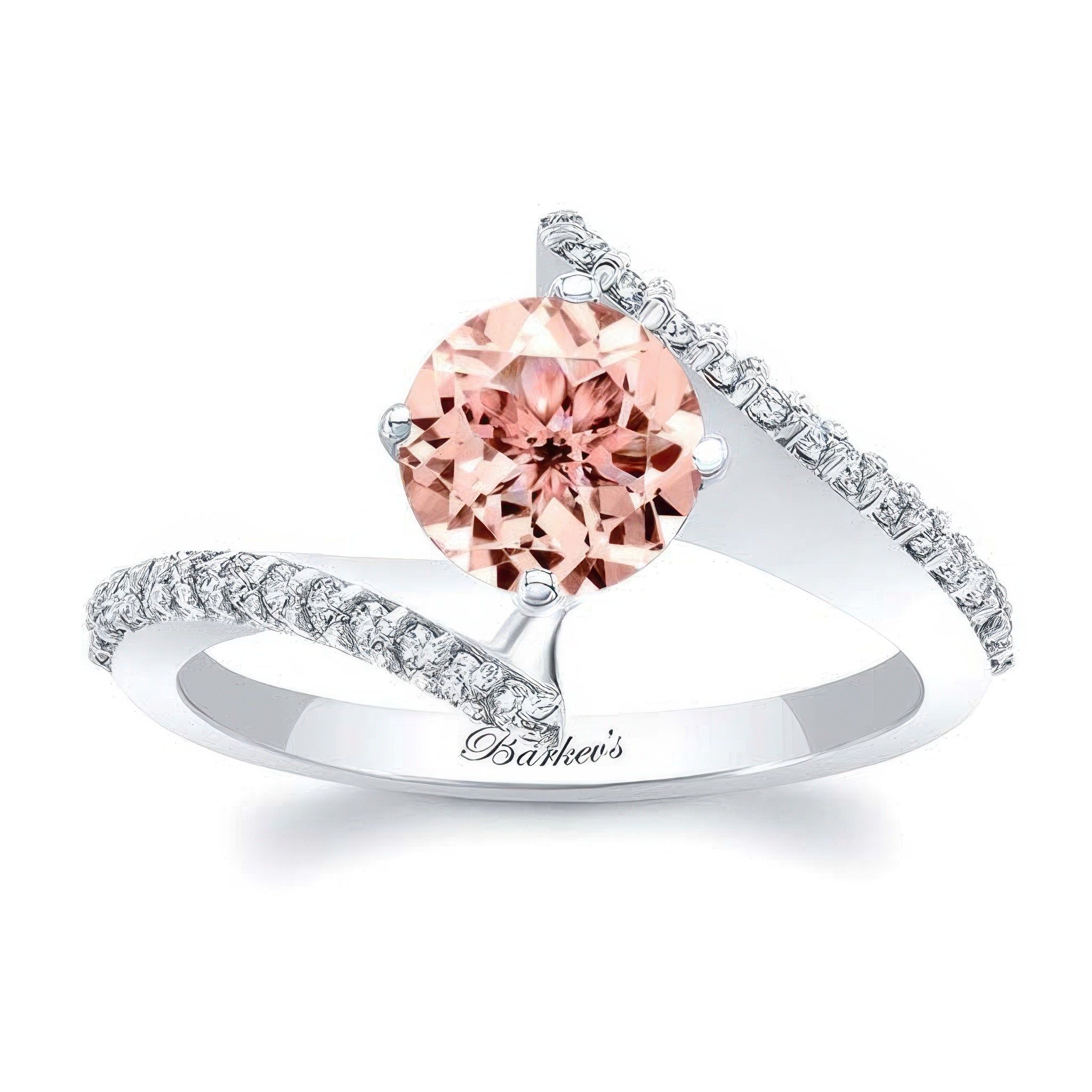 A stunning modern bypass morganite and diamond engagement ring featuring a prong set round center with sharing prong set diamonds gracing the ridges for a dramatic look sure to catch the eye of many admirers.