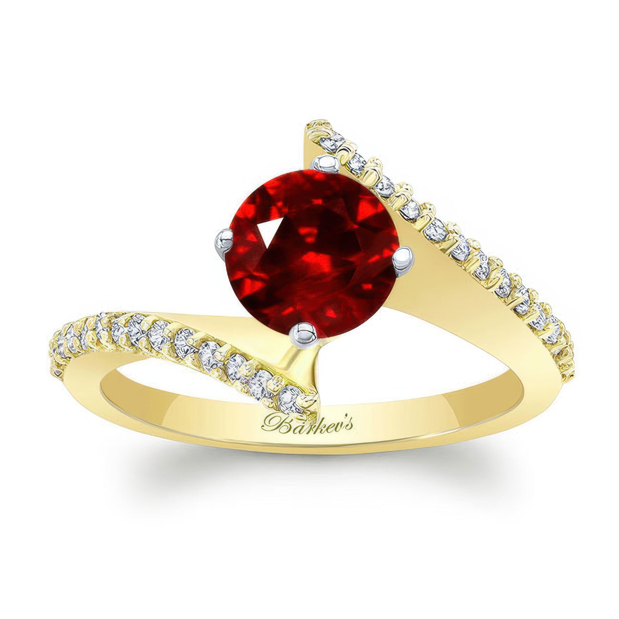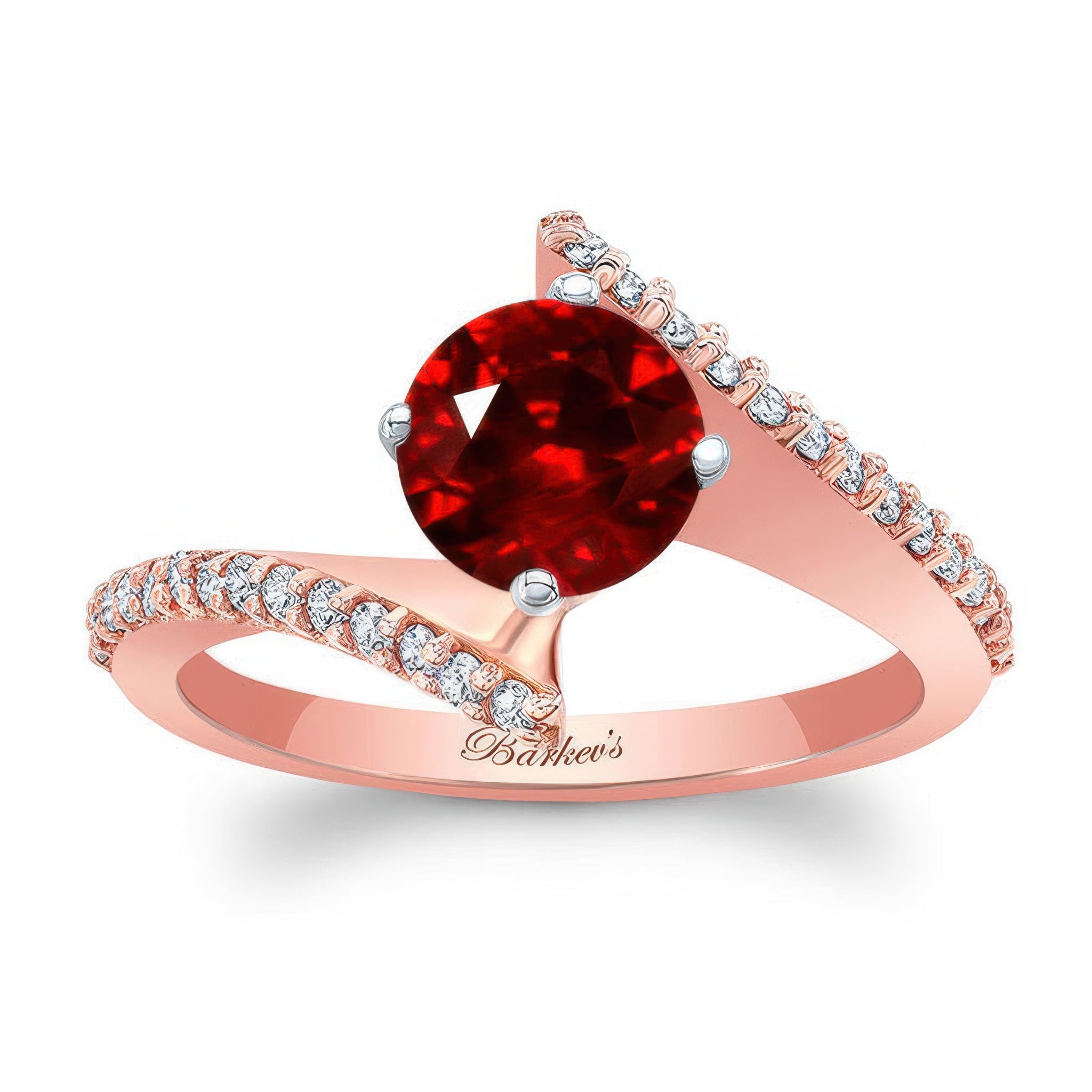 A stunning modern bypass ruby and diamond engagement ring featuring a prong set round center with sharing prong set diamonds gracing the ridges for a dramatic look sure to catch the eye of many admirers.