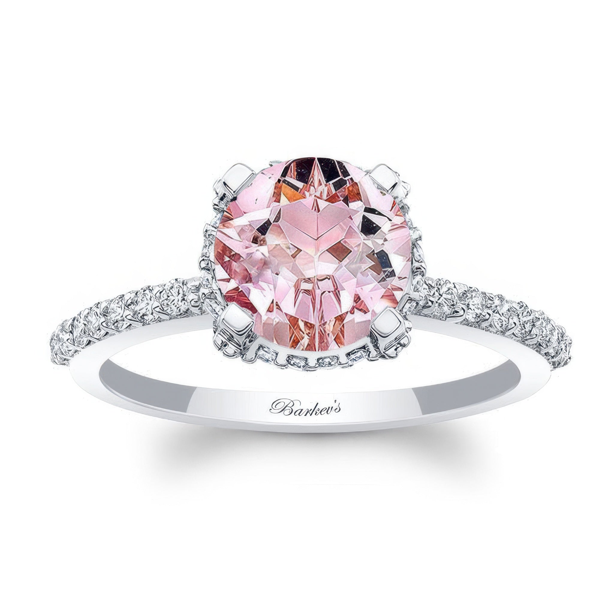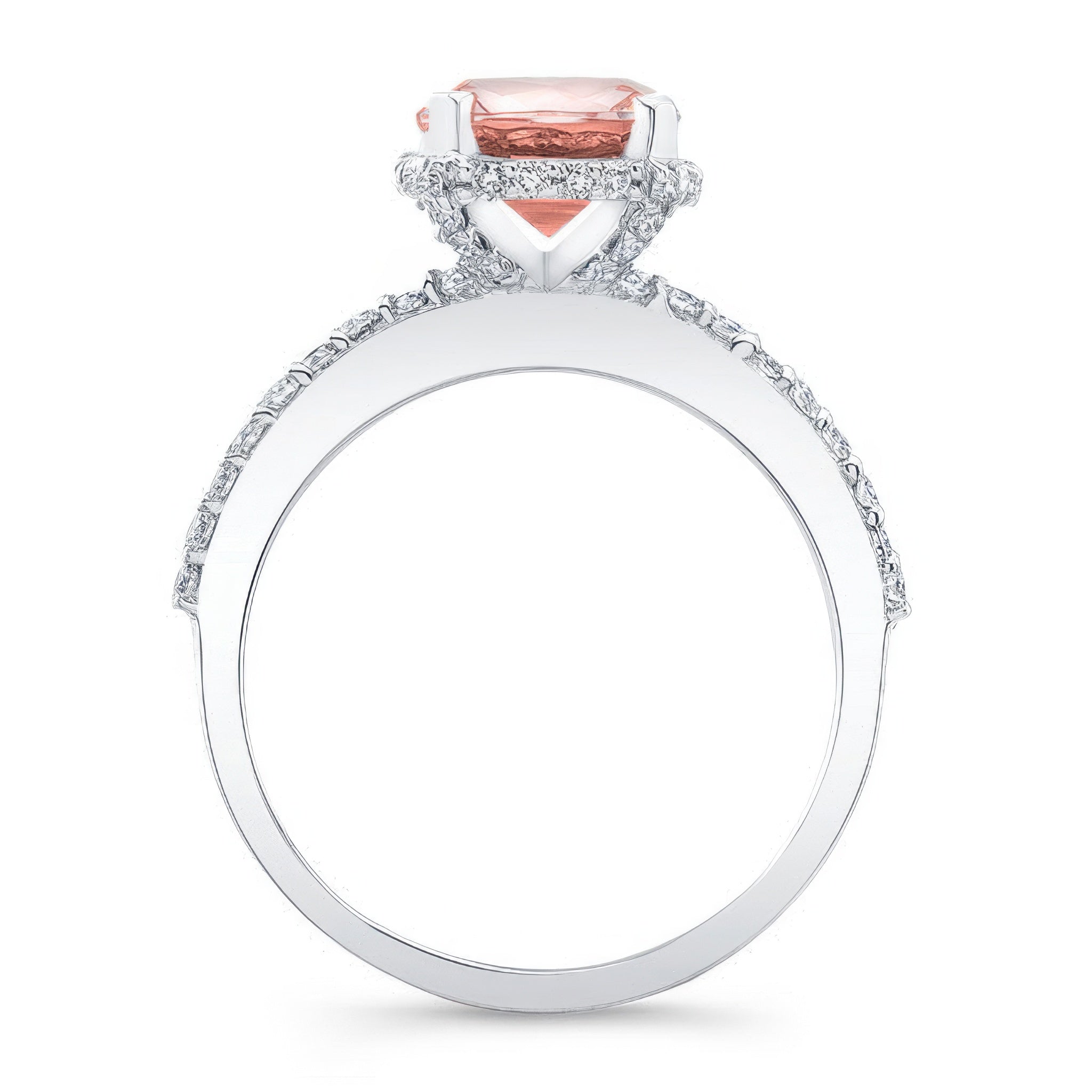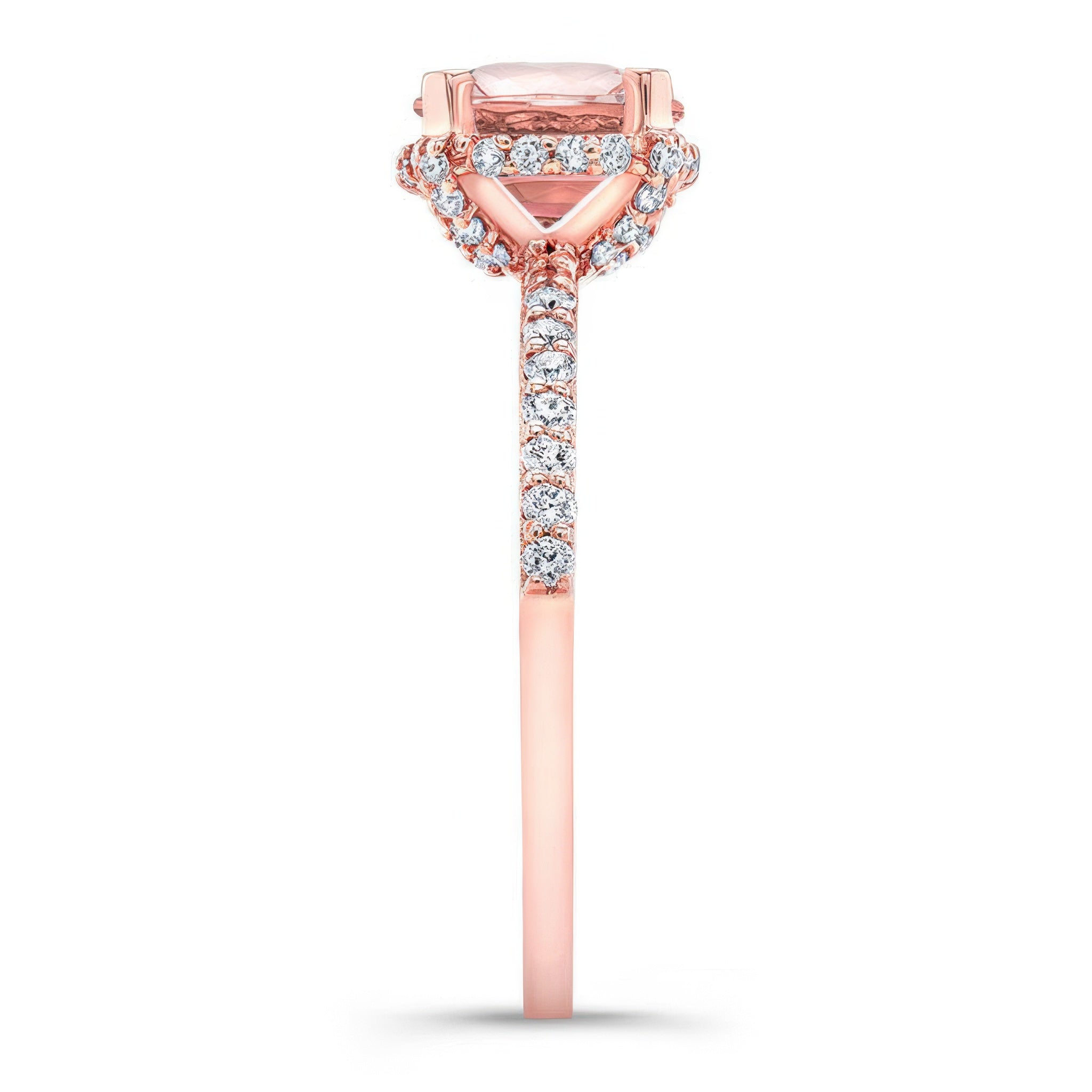 This morganite and diamond hidden halo ring features a prong set round center surrounded by shared prong set diamonds just underneath as they cascade and flow down the shank for a look that shimmers from every angle.