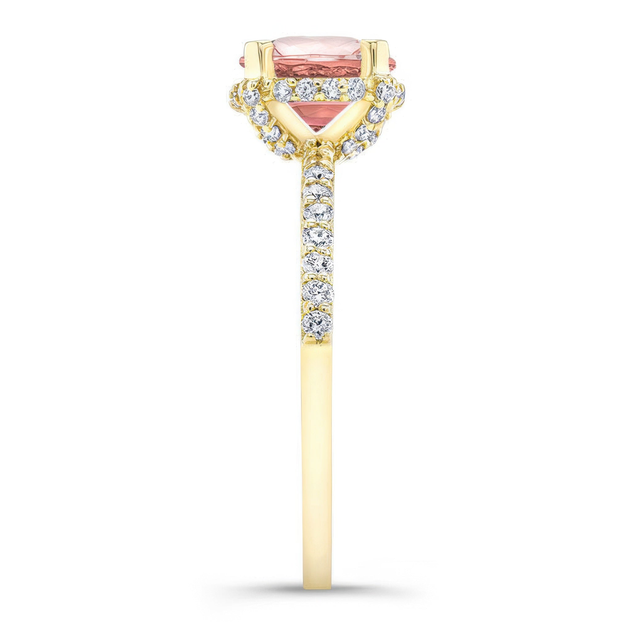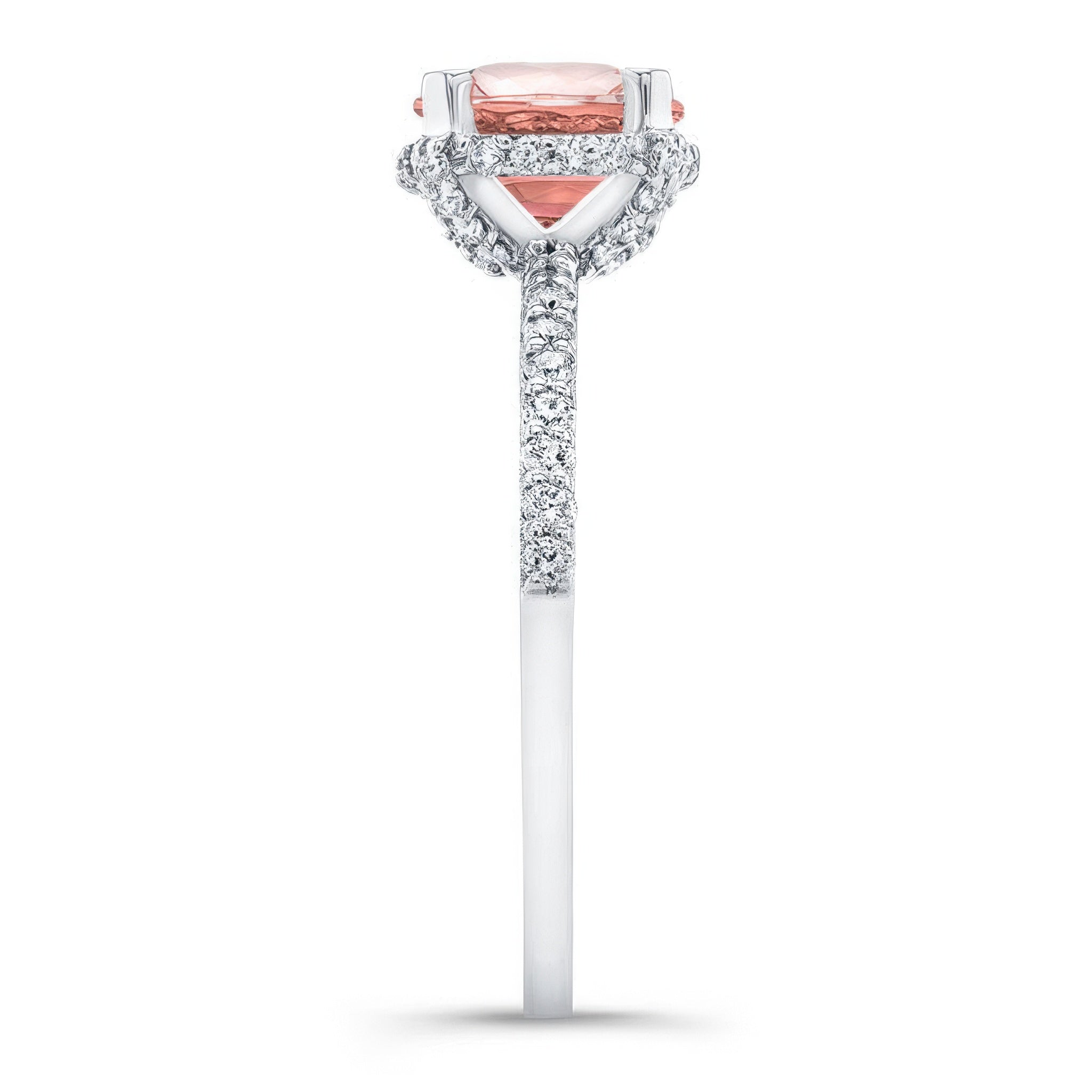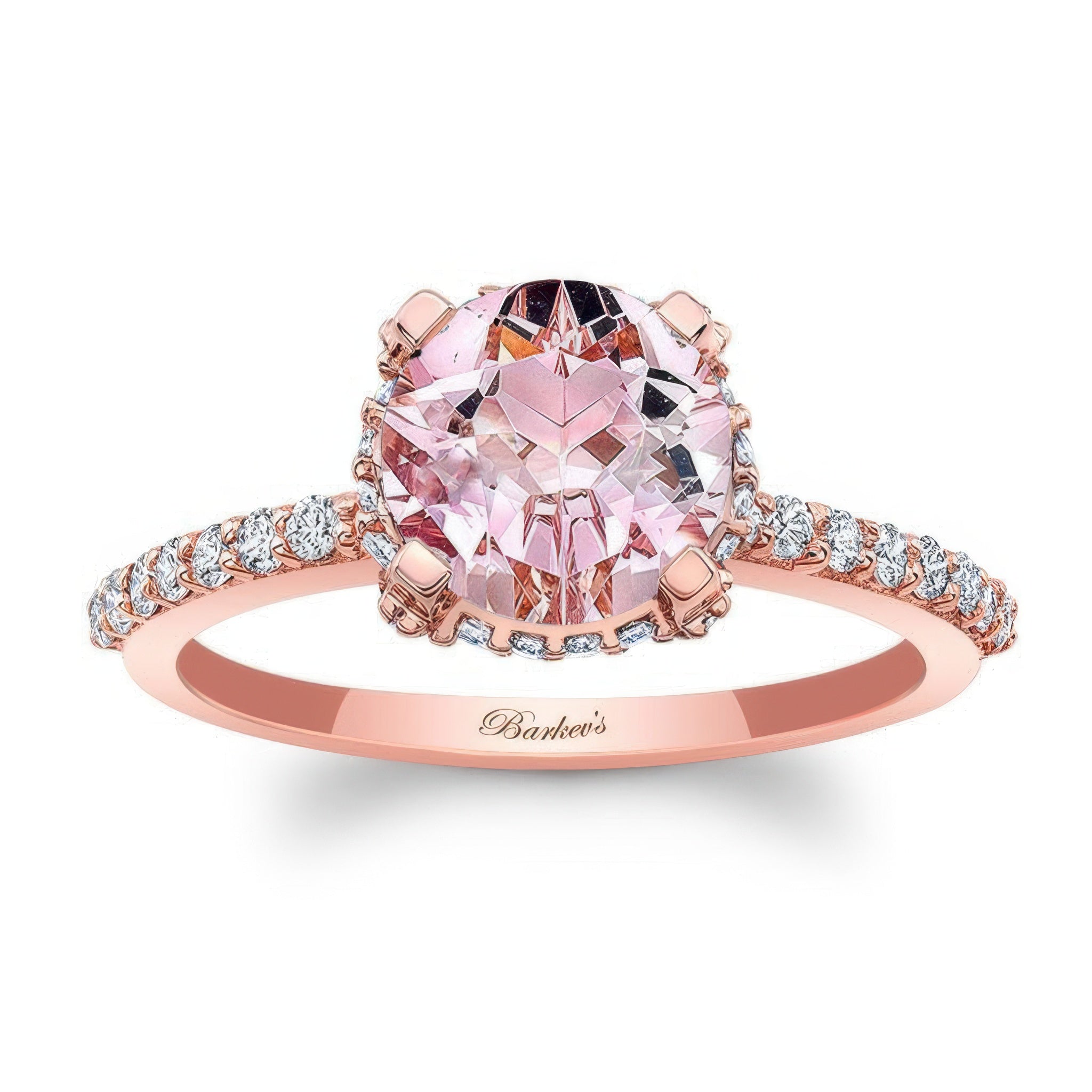 This morganite and diamond hidden halo ring features a prong set round center surrounded by shared prong set diamonds just underneath as they cascade and flow down the shank for a look that shimmers from every angle.
