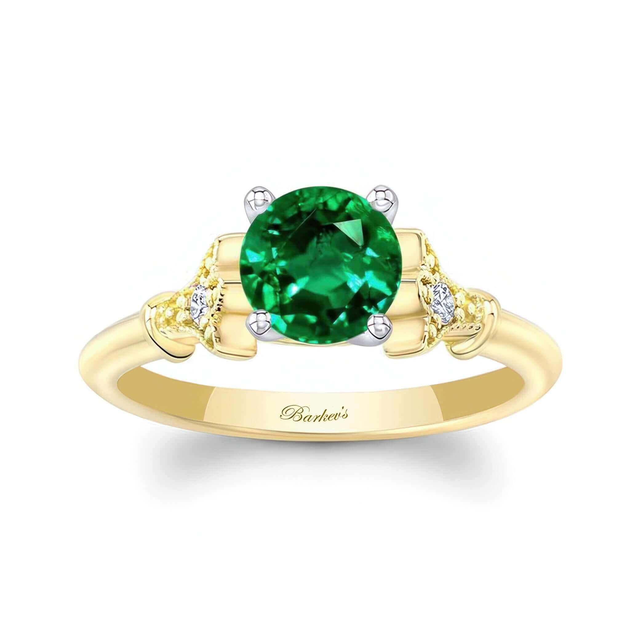 A beautiful petite leaf emerald and diamond engagement ring featuring a minimal design with a prong set round center and 2 diamonds embedded into the center of a leaf motif on each side for a stunning vintage look.
