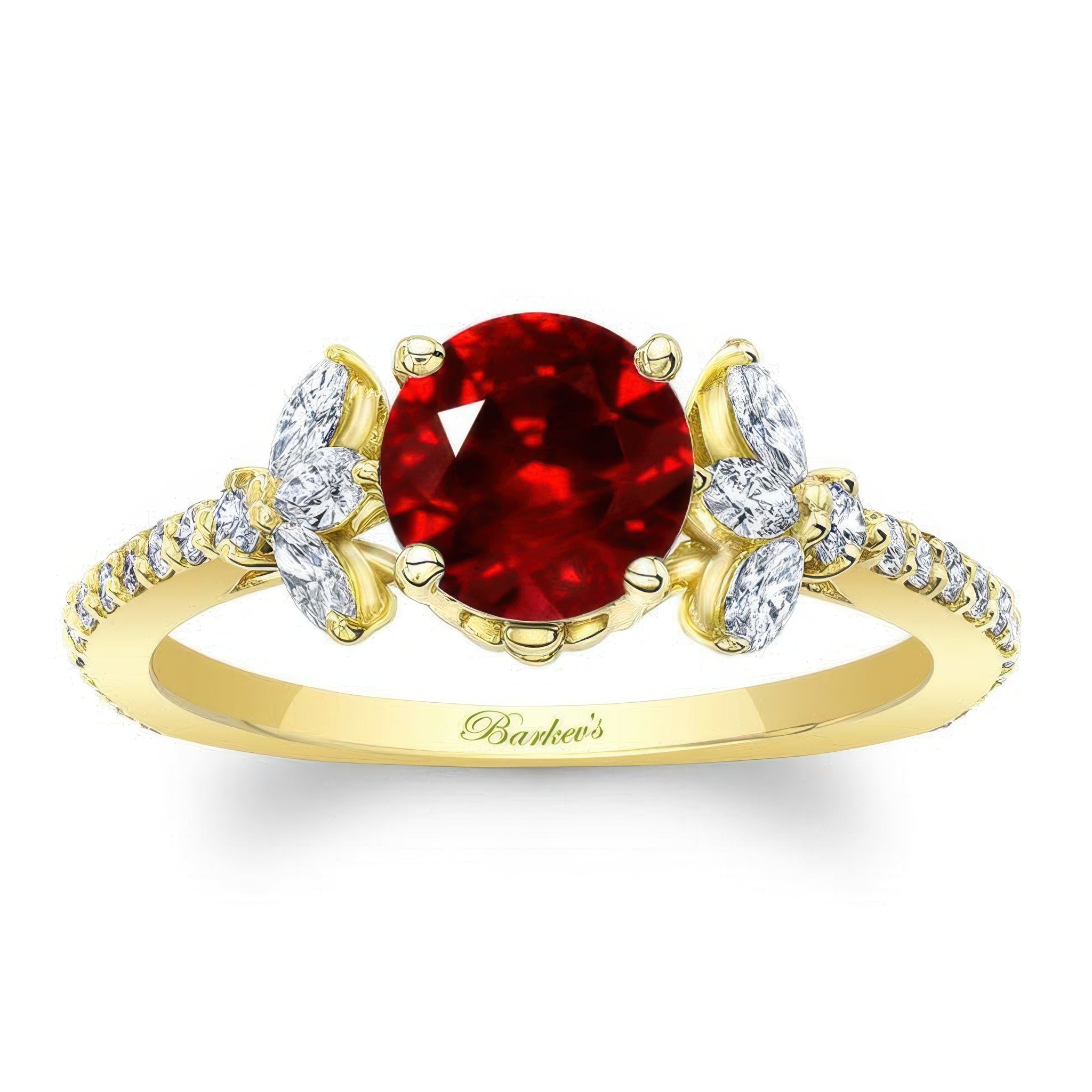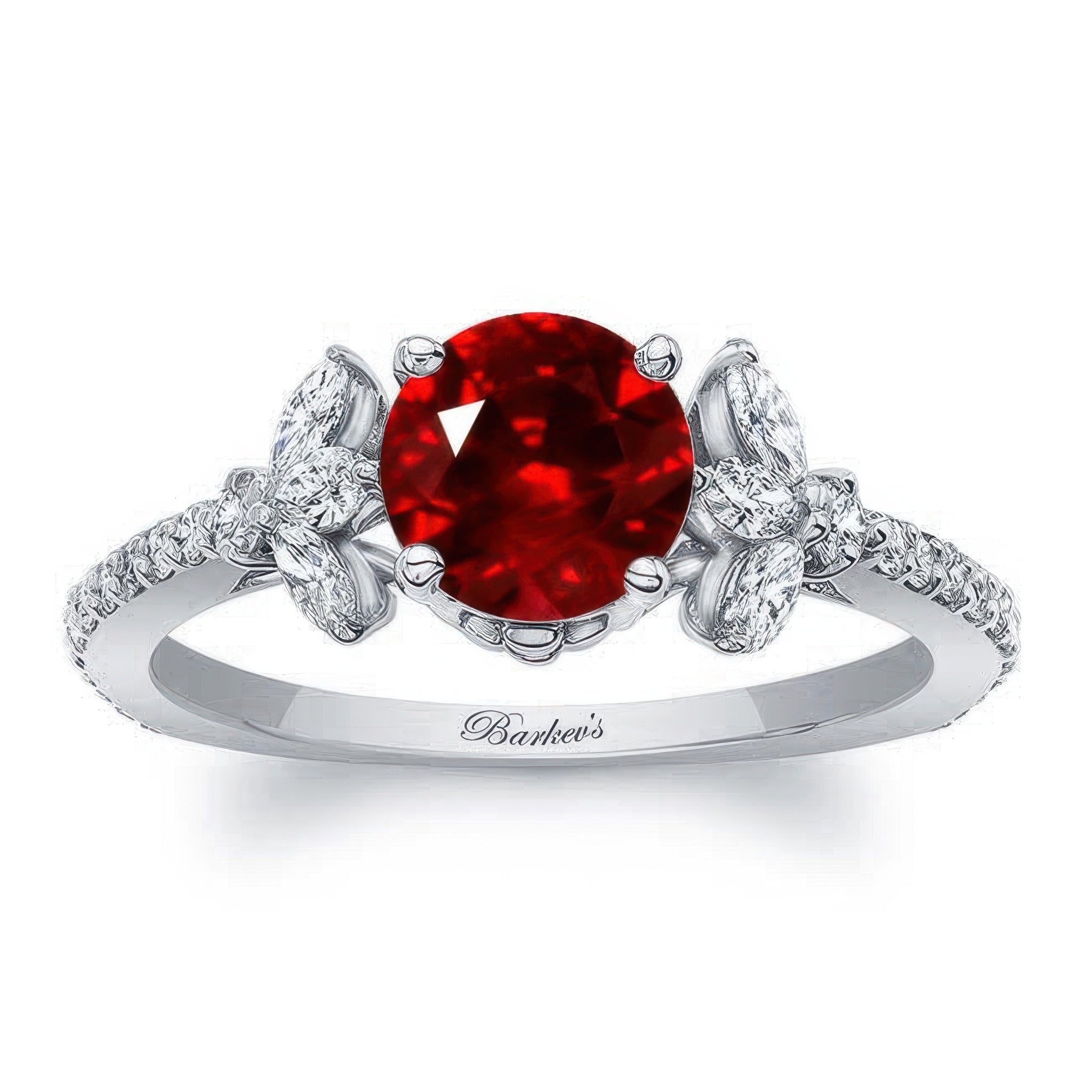 A beautiful ruby and diamond leaf engagement ring featuring a prong set center that's flanked on each side by a round diamond acting as a base while a spray of marquise cut diamonds radiate outwards forming an elegant leaf shape. The final touch is a sprinkle of diamond melees on the shank for a sparkling look.