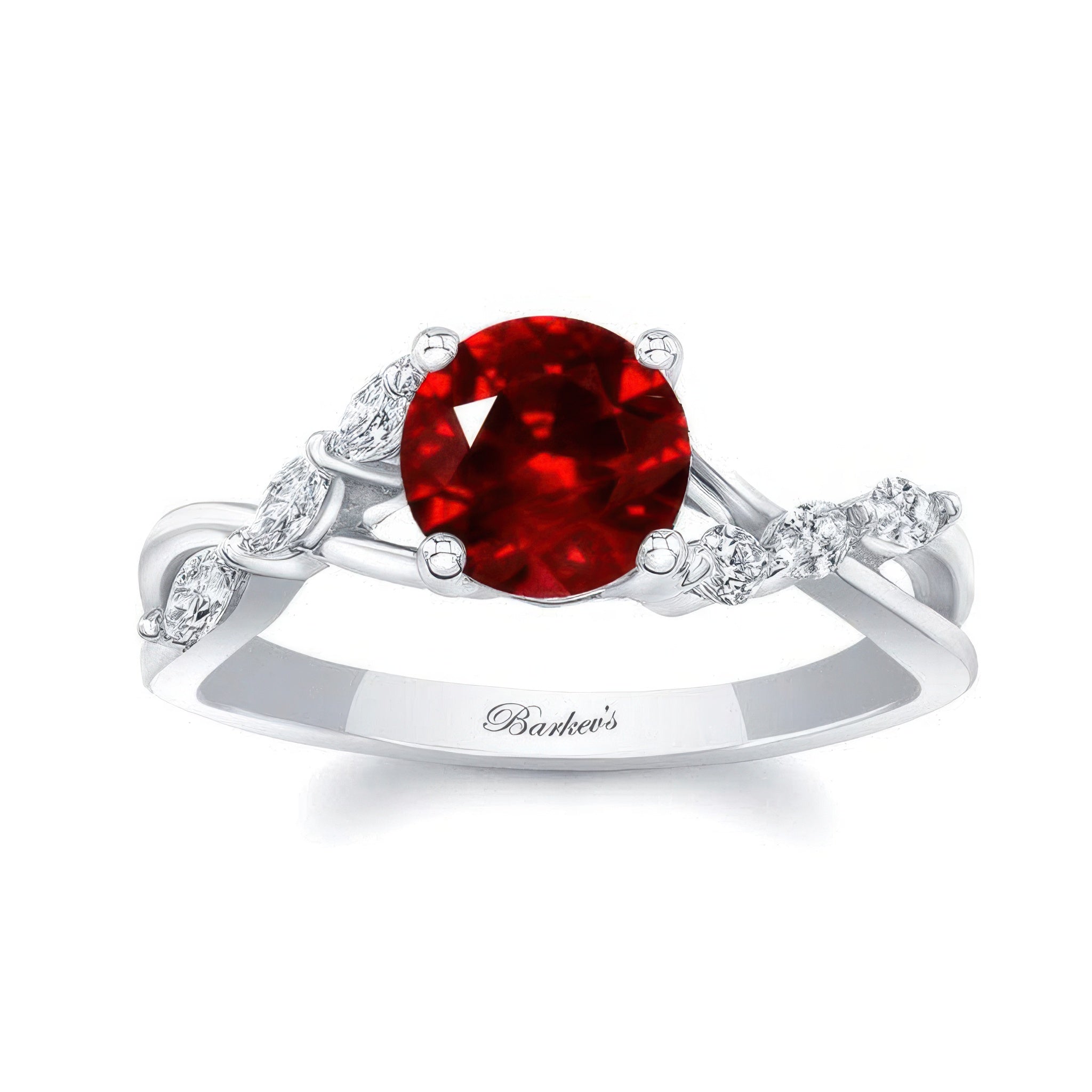 This ruby and diamond marquise accent ring gives off a classic vibe. The design is adorned by a round center snugly embraced by an elegant curve with three diamonds on each side.