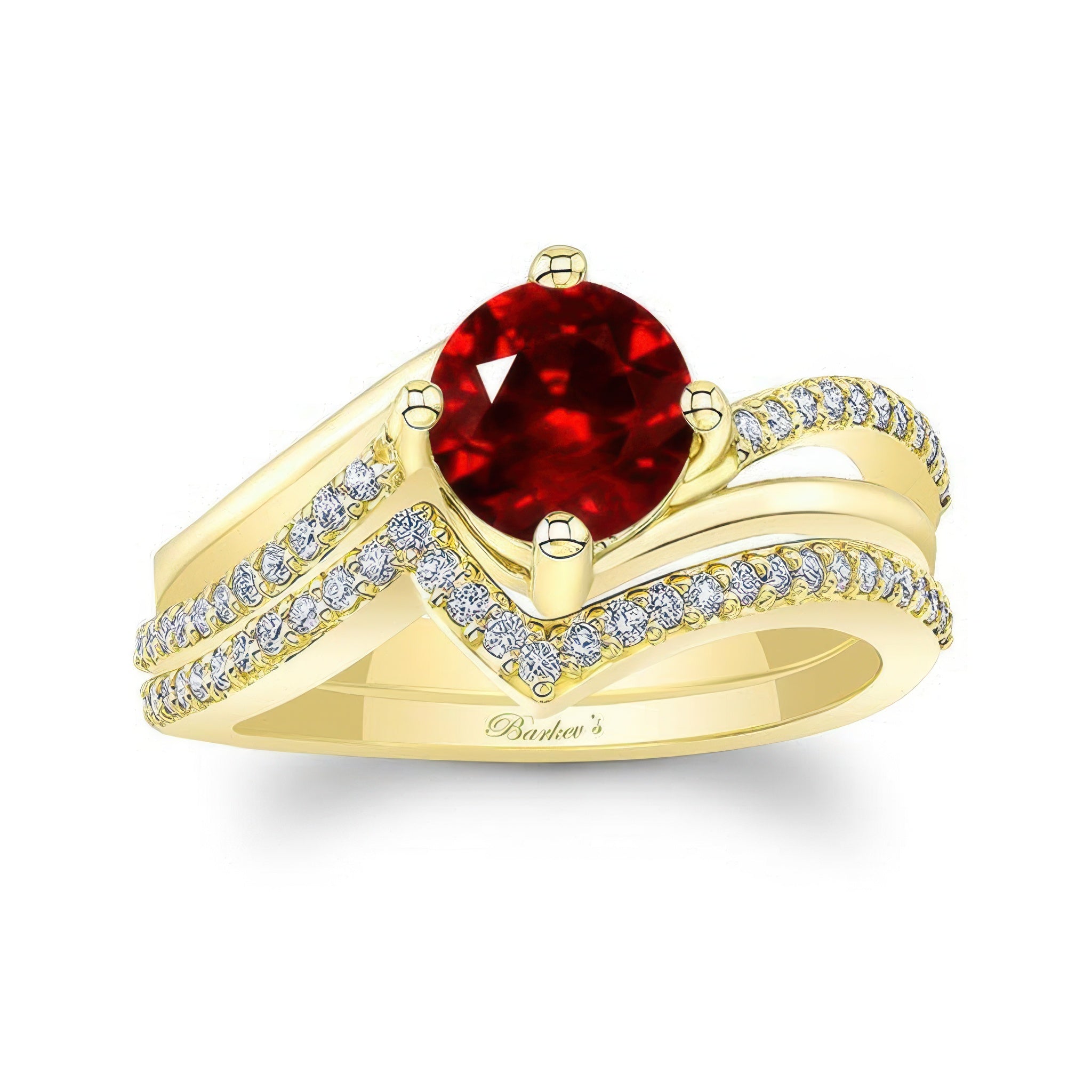 A ruby and diamond split shank wedding set featuring a round center nestled between separated swirls adorned with diamonds for an extra touch of brilliance. Comes with a matching wedding band.