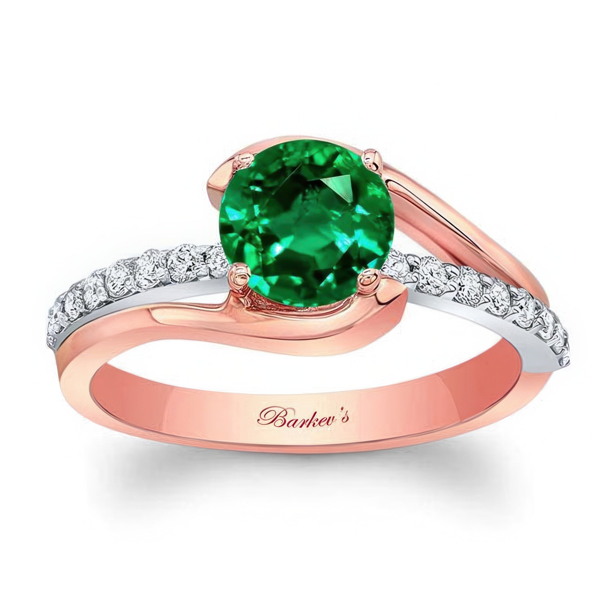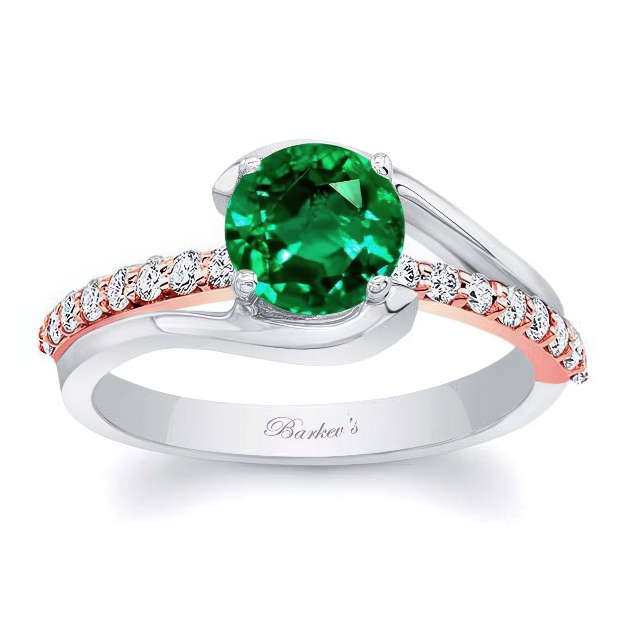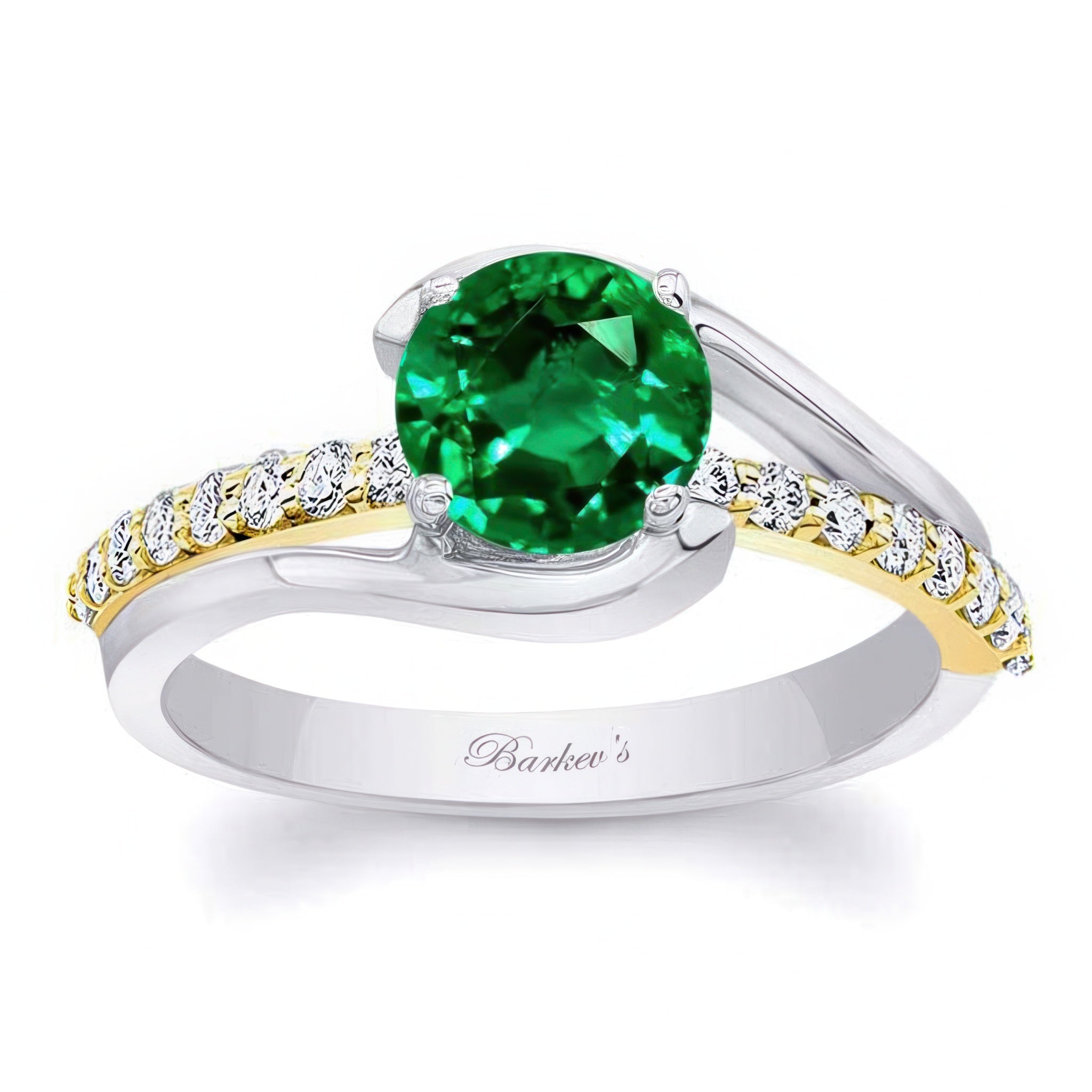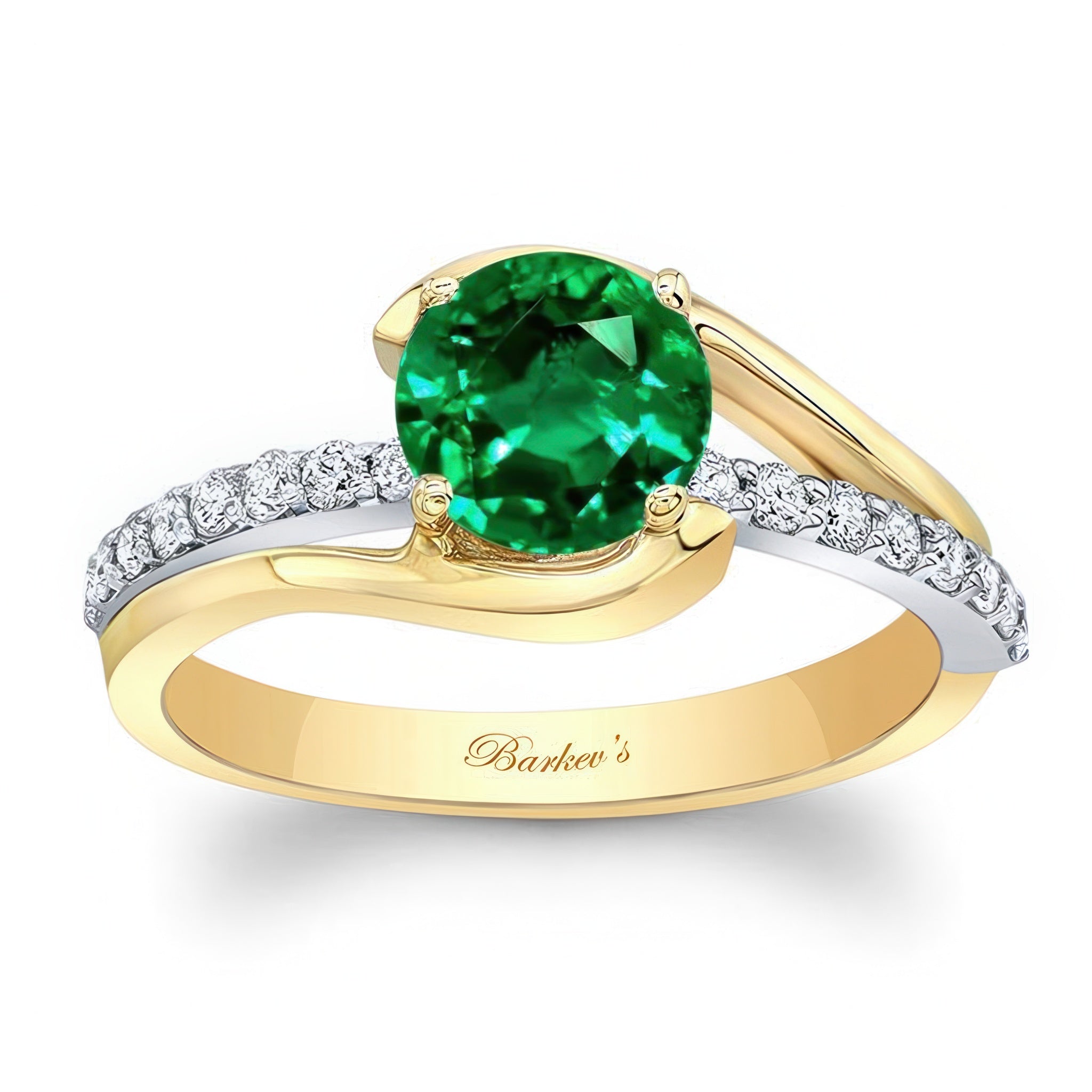 This simple 1 carat round emerald and diamond ring features a split shank that swirls to cradle the round center while a shared prong set diamond bridge crosses underneath for a dramatic fashion statement.