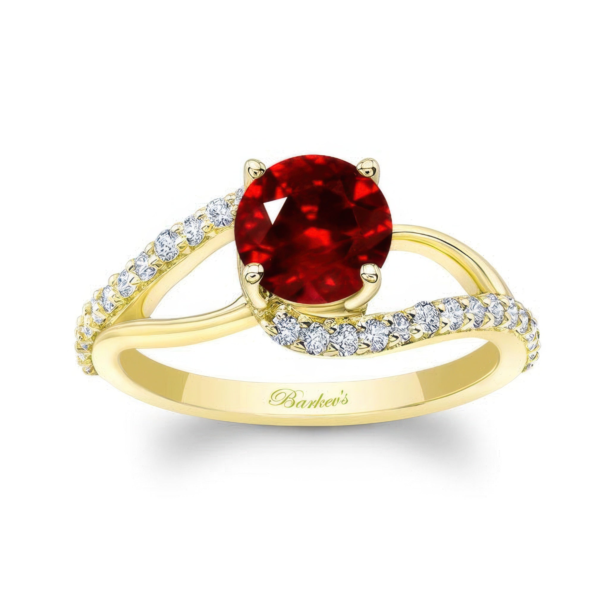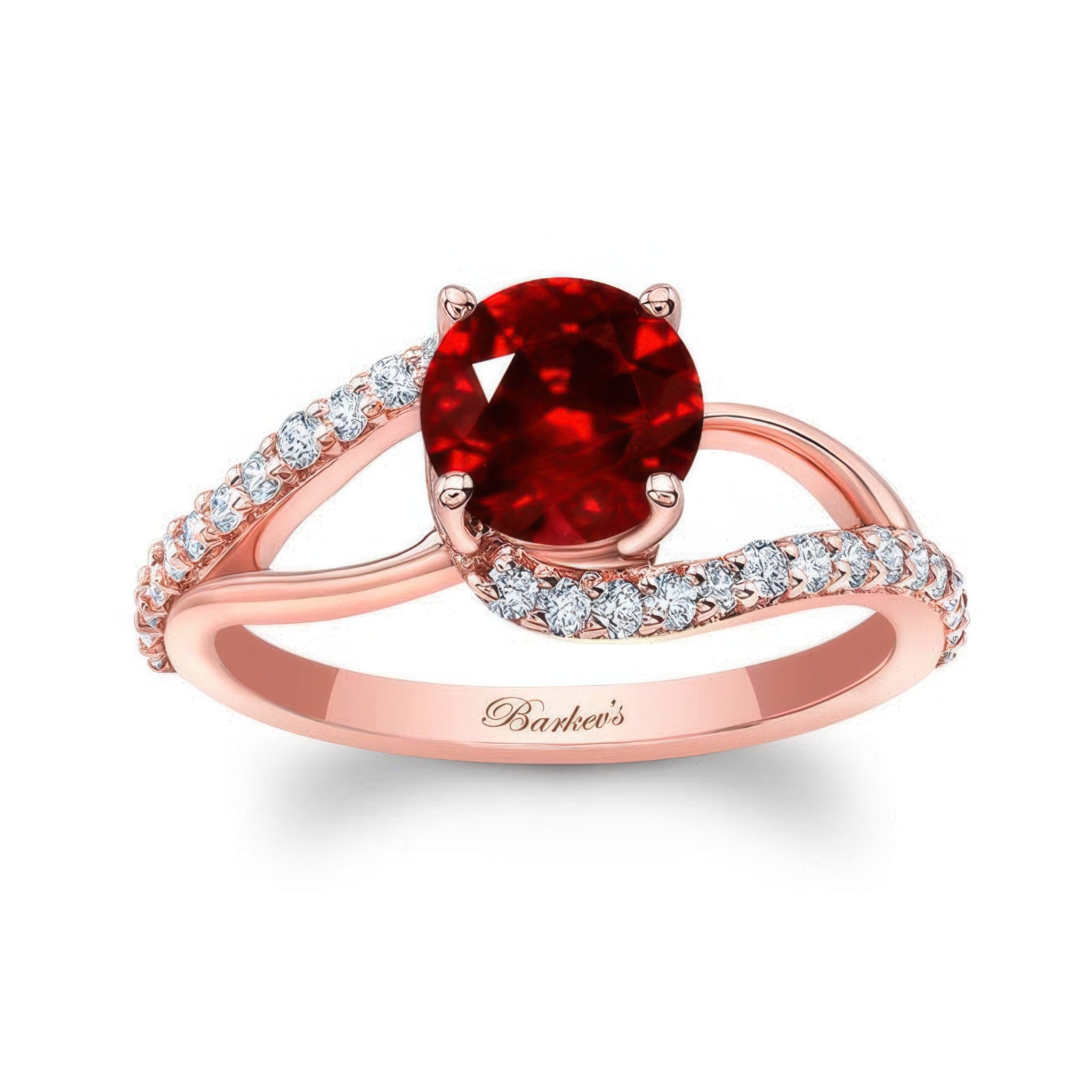 This split shank ruby and diamond ring features a round center, while it's split shoulders are adorned with diamonds for a flawless final look.