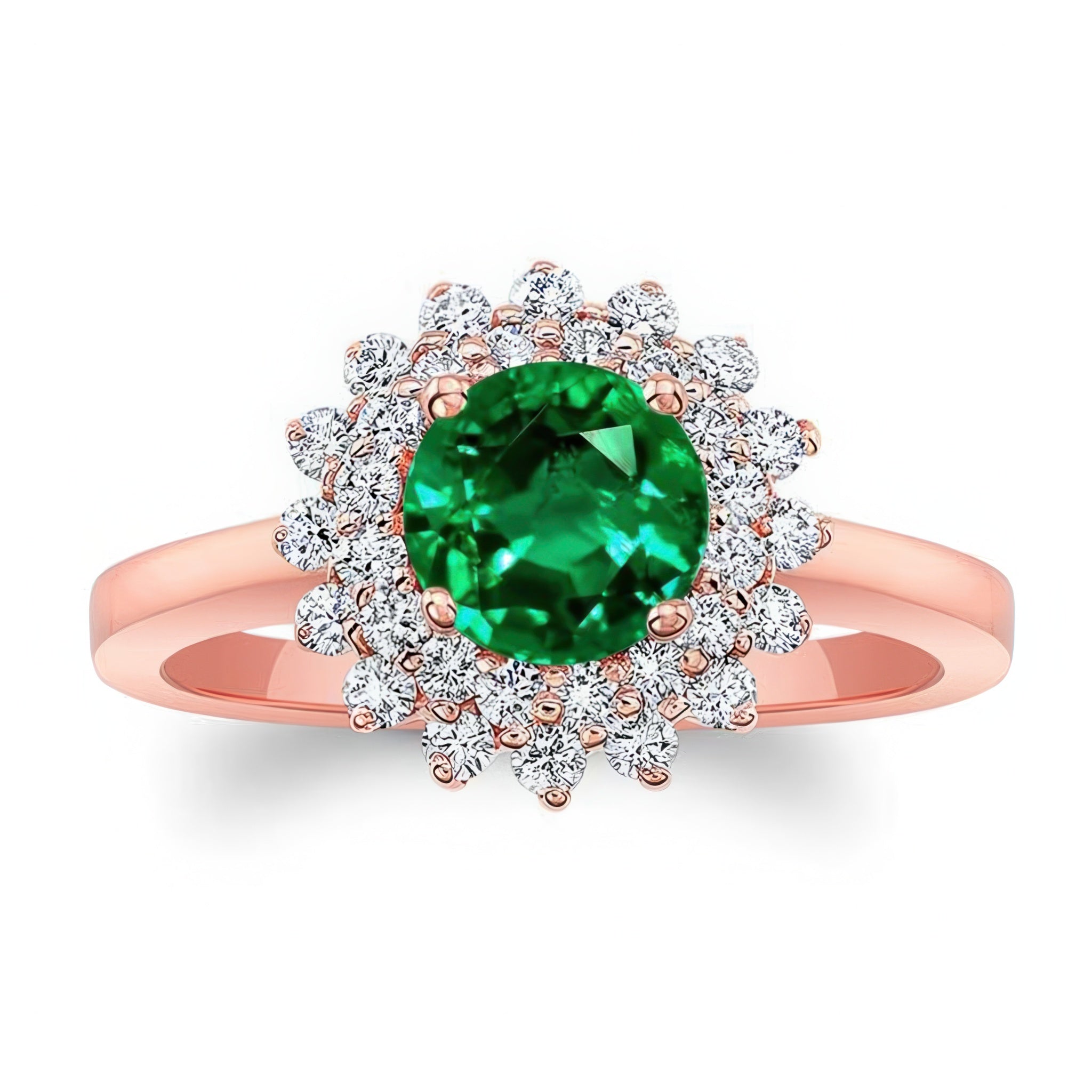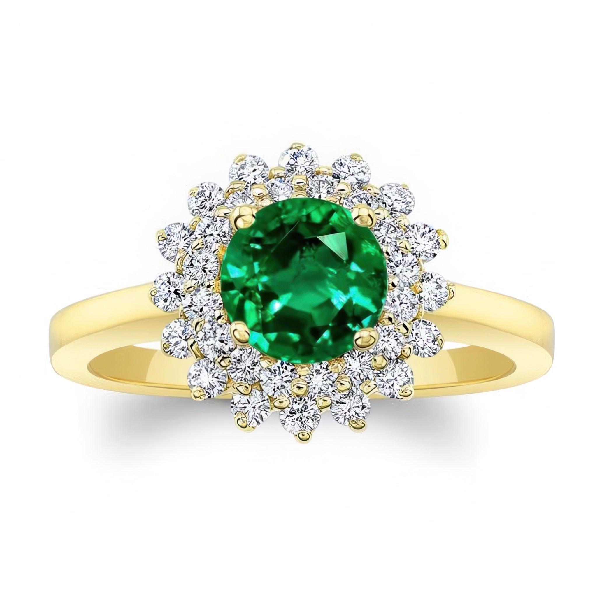 An exquisite starburst emerald and diamond ring featuring a prong set round center encircled with two diamond halos with the outer one giving the illusion of a burst pattern. The final touch is visible on the profile view with a dainty polished shank featuring a simple motif design for a stunning look.