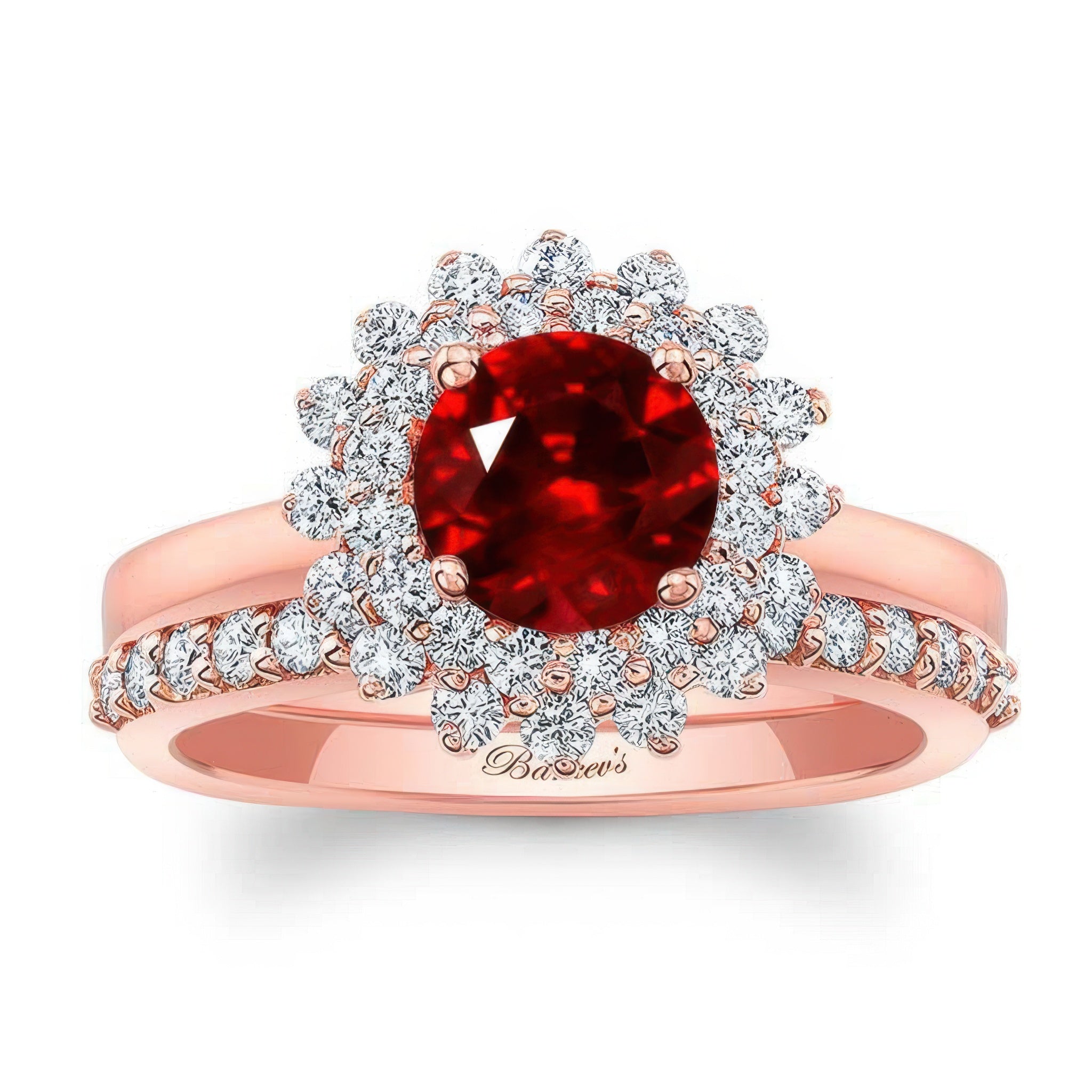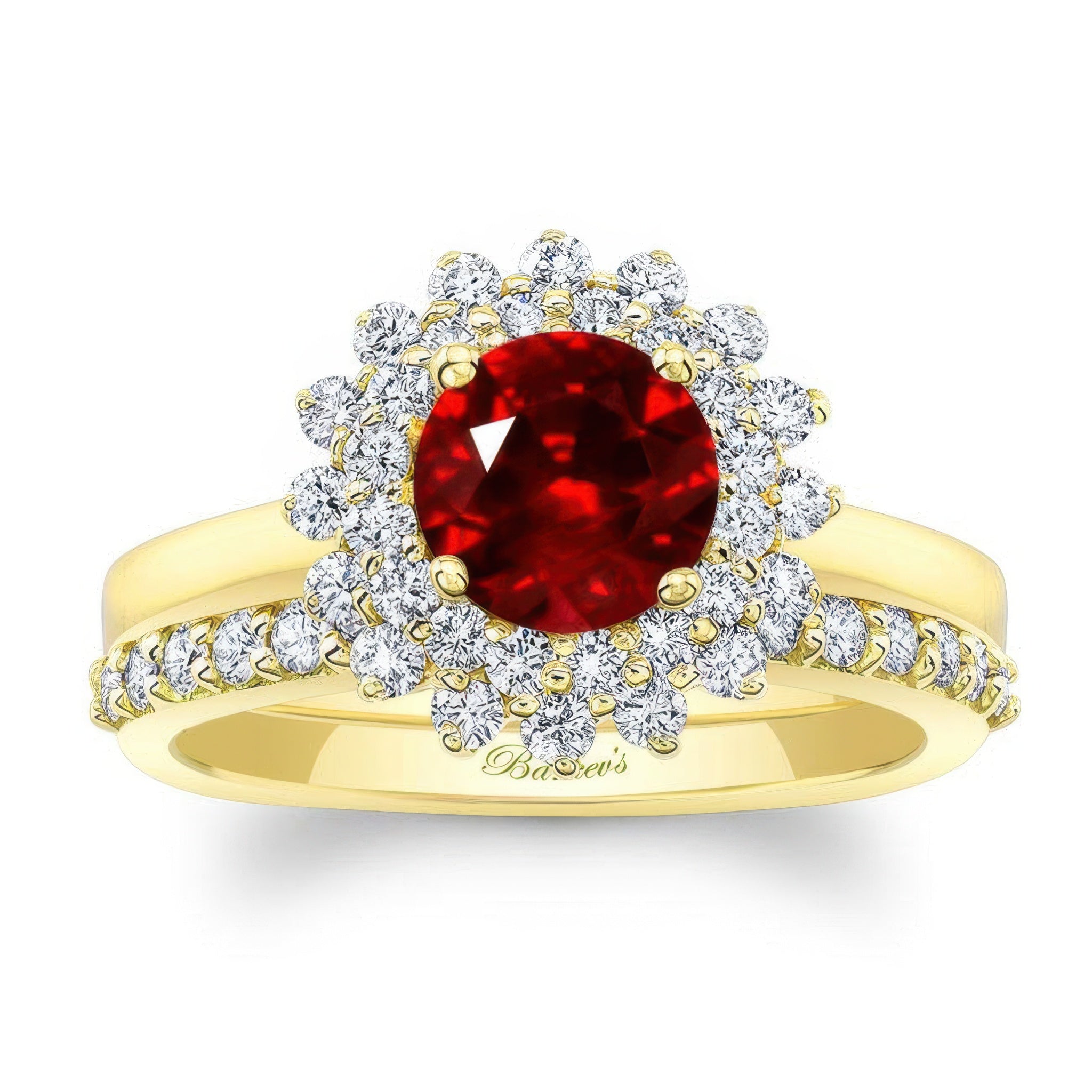 An exquisite starburst ruby and diamond bridal set featuring an engagement ring with a prong set round center encircled with two diamond halos with the outer one giving the illusion of a burst pattern. The final touch is visible on the profile view with a dainty polished shank featuring a simple motif design. A shared prong set wedding band snuggles up close on the side for a stunning look.