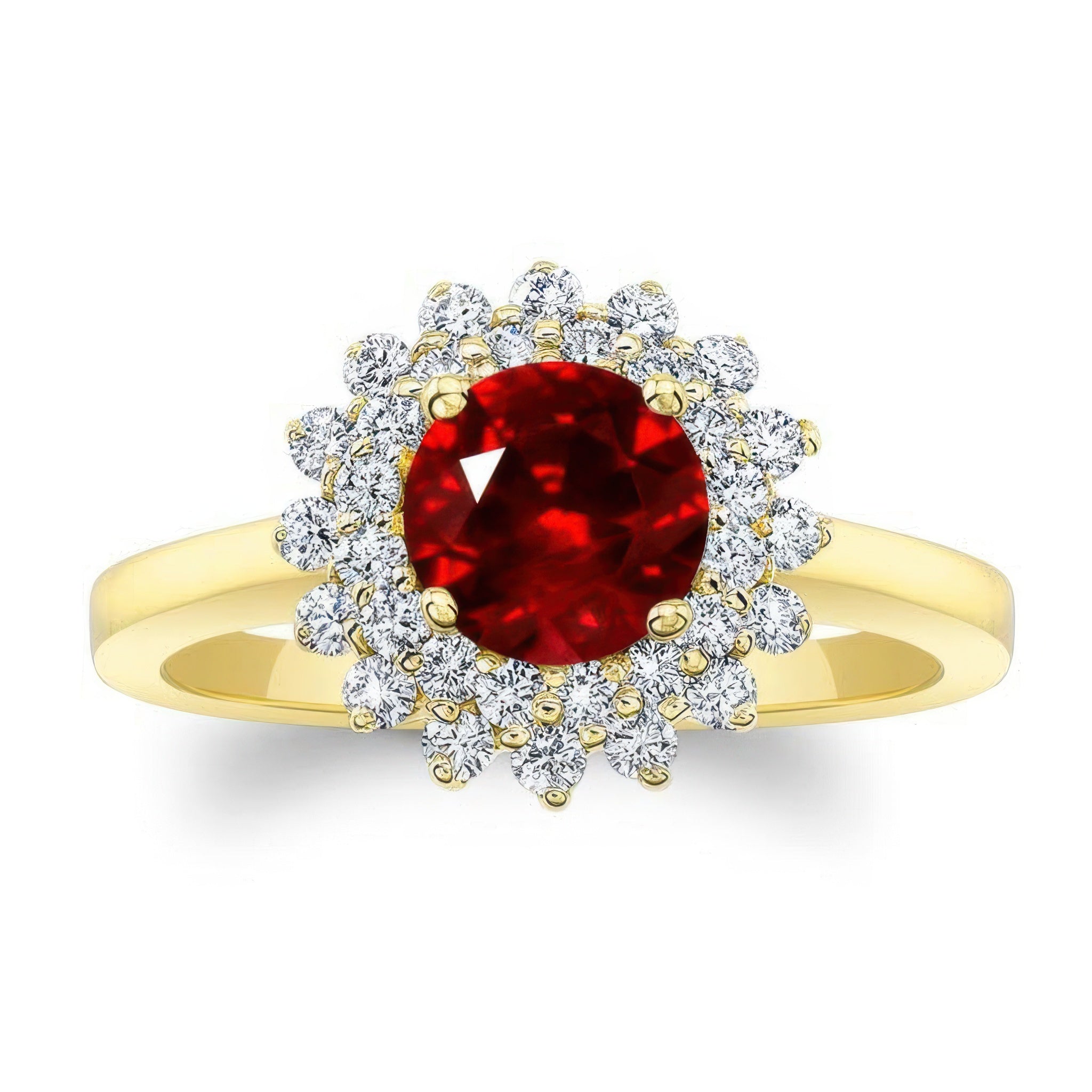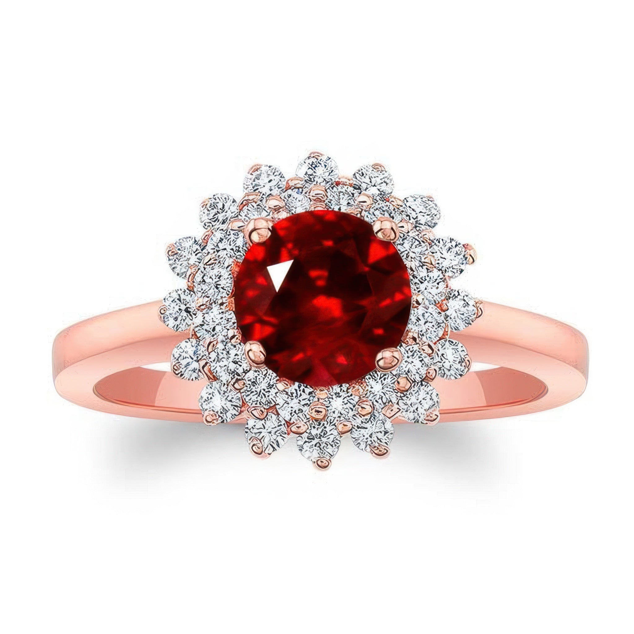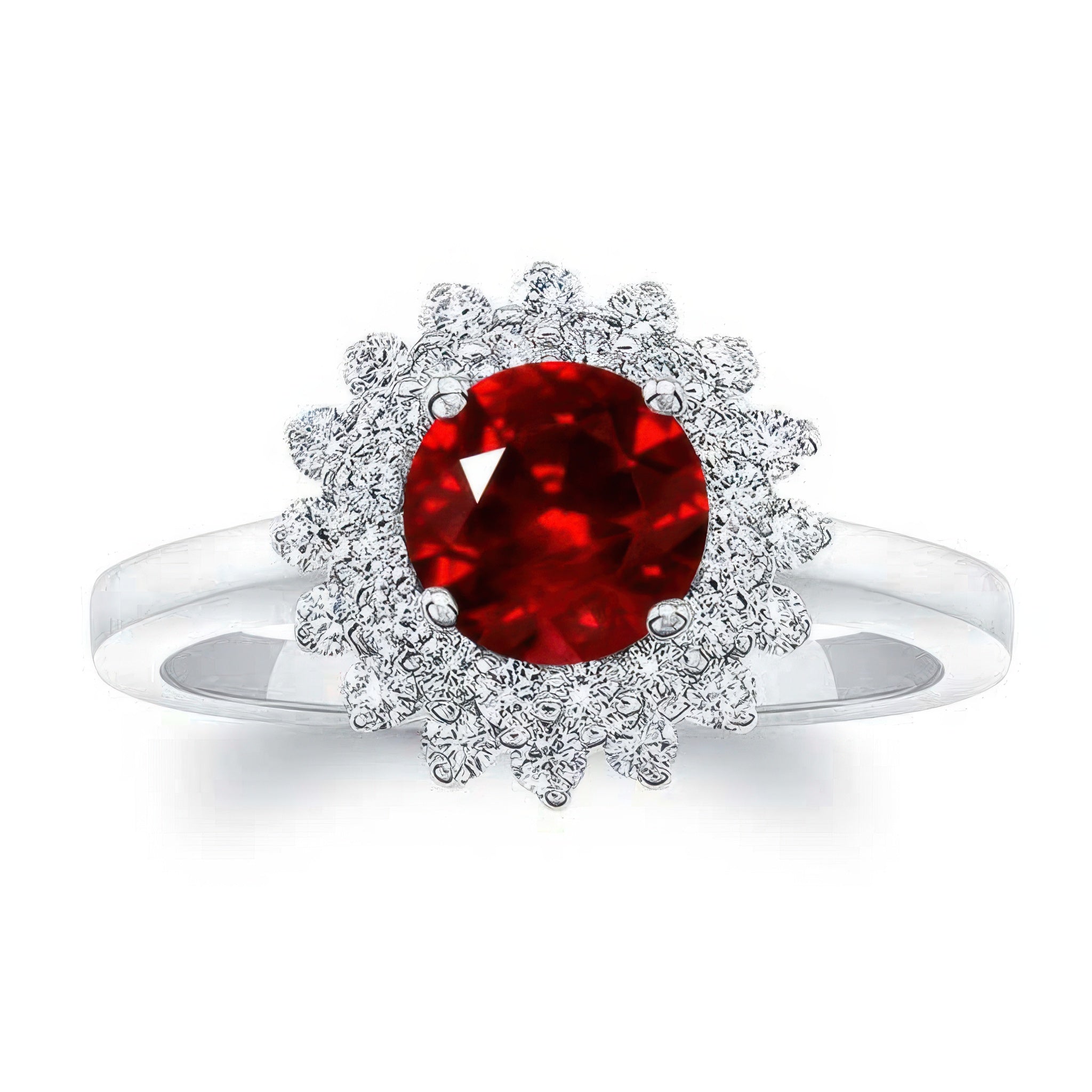 An exquisite starburst ruby and diamond ring featuring a prong set round center encircled with two diamond halos with the outer one giving the illusion of a burst pattern. The final touch is visible on the profile view with a dainty polished shank featuring a simple motif design for a stunning look.