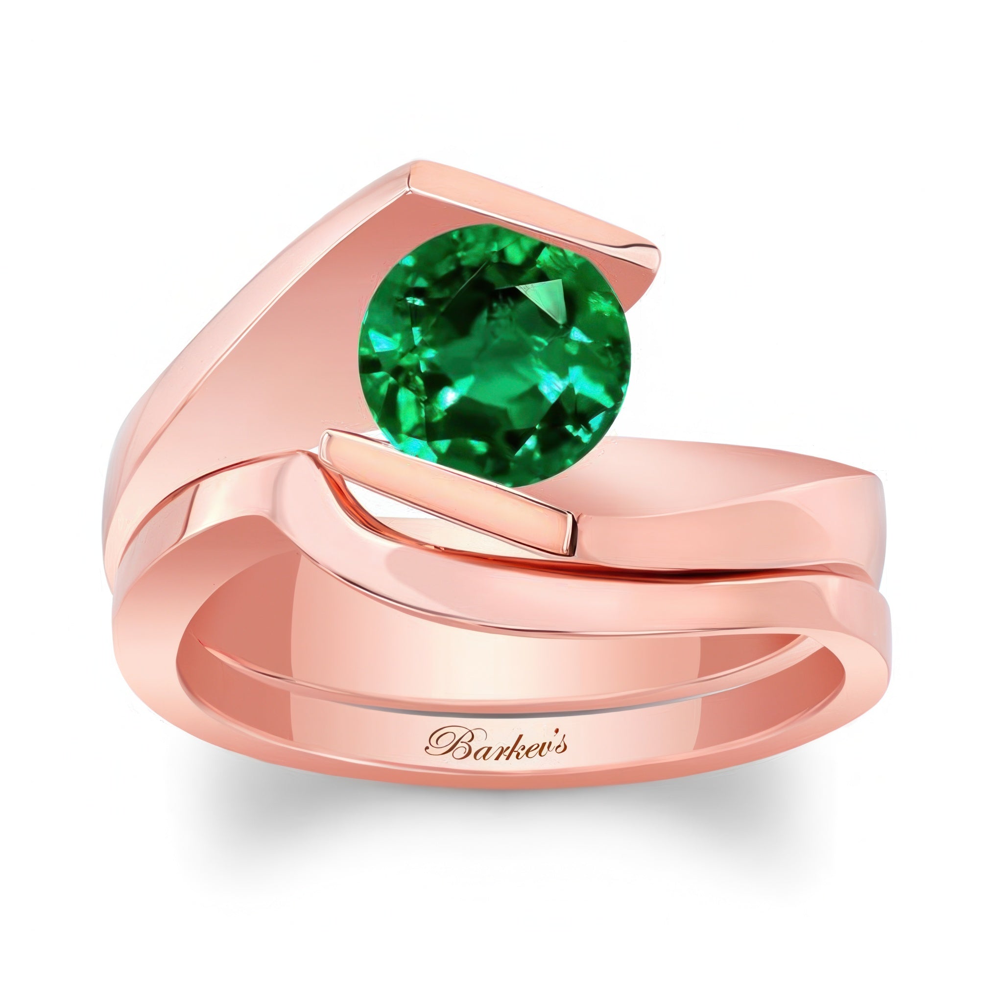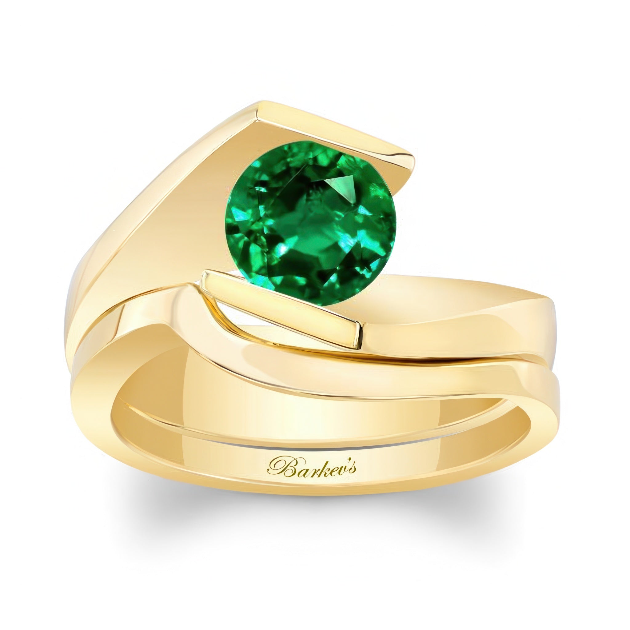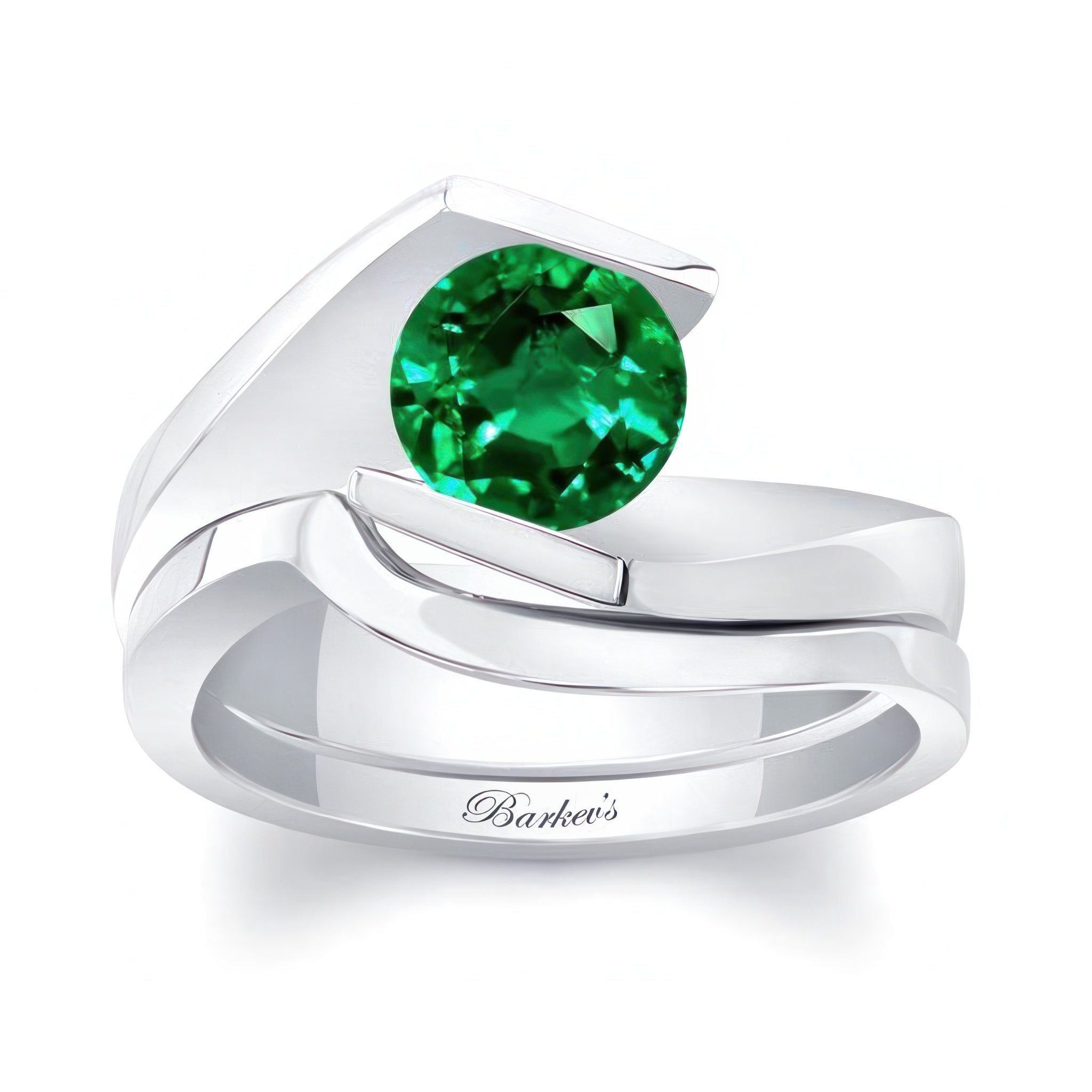 An elegant tension solitaire emerald bridal set featuring a round center with a bypass shank and a matching plain wedding band.