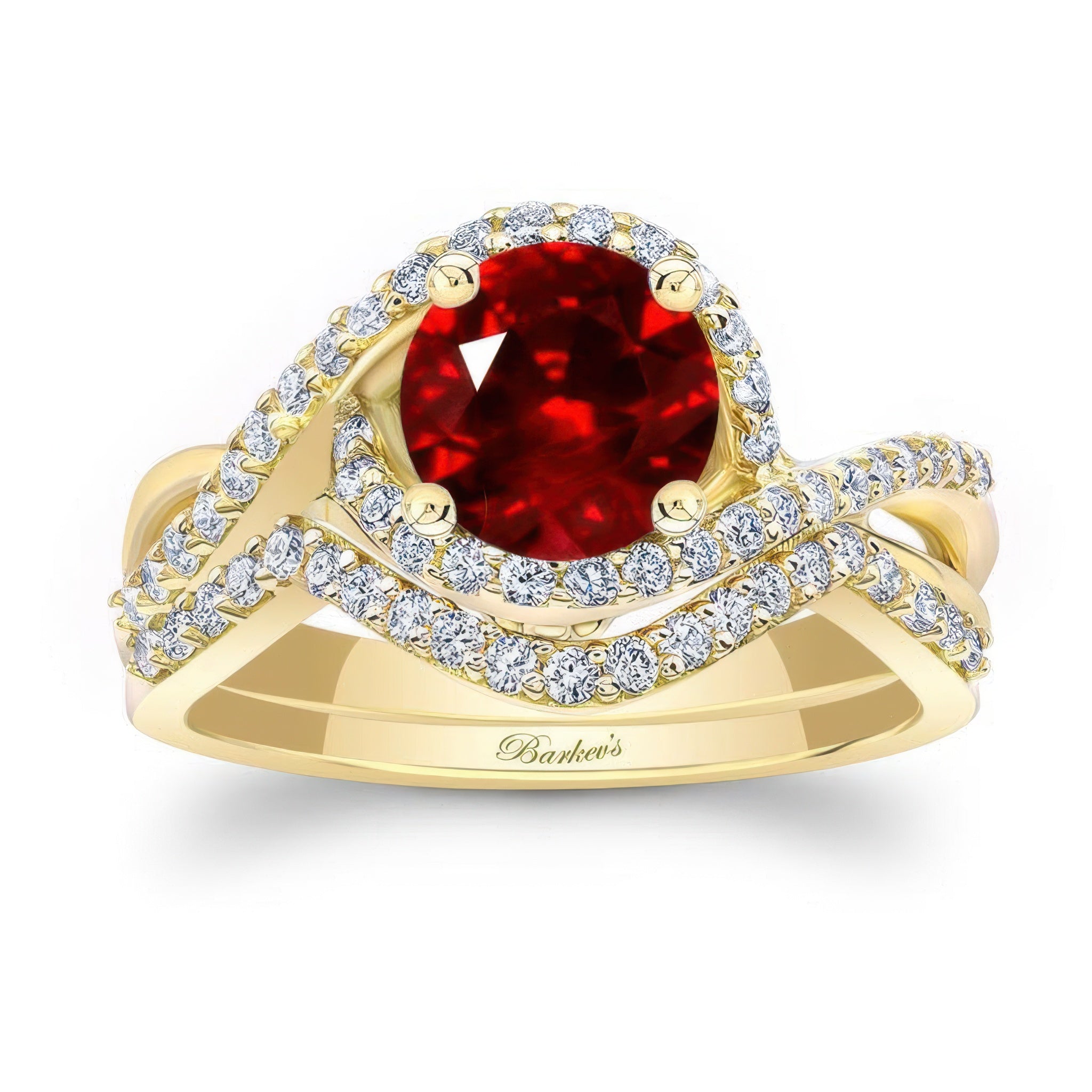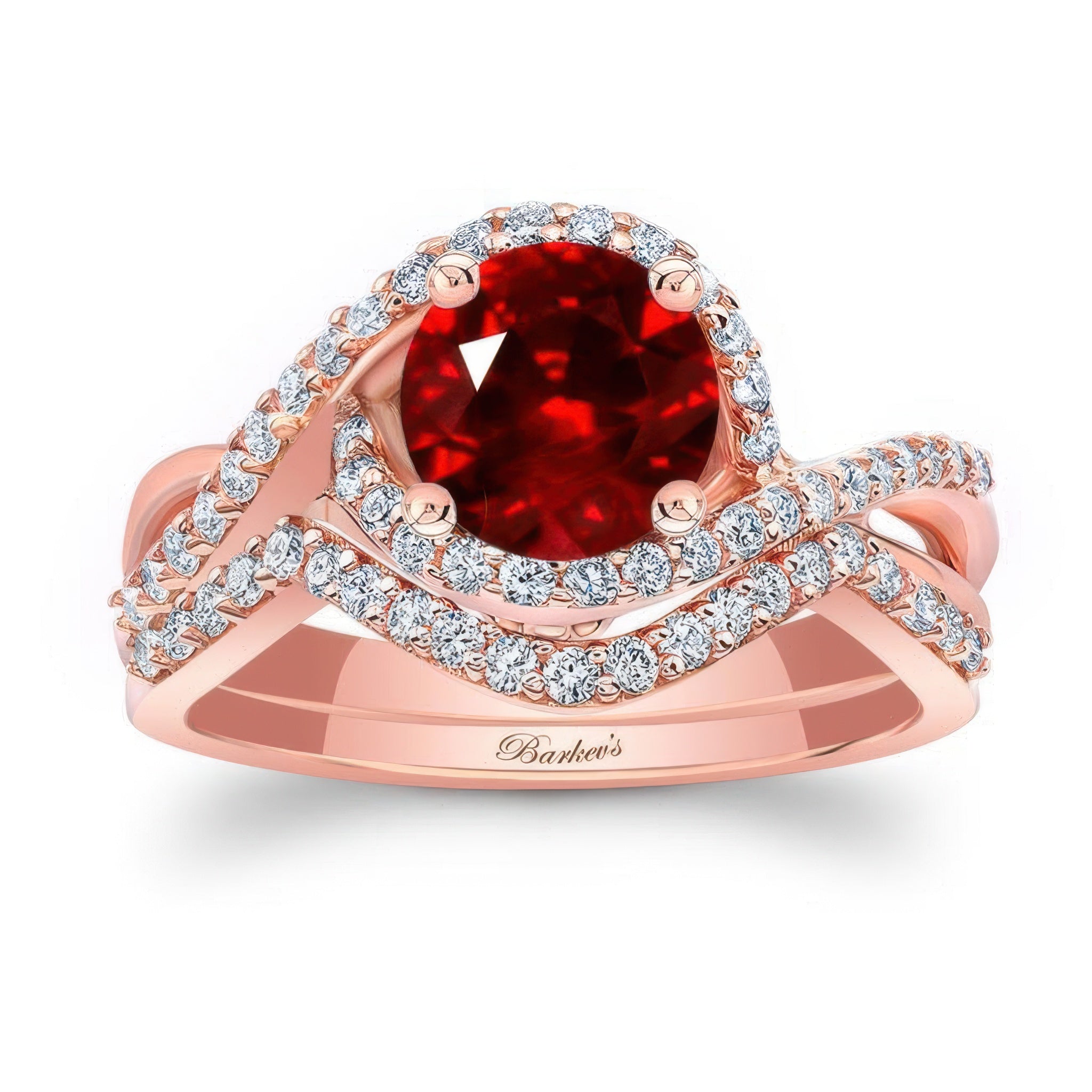 A stunning twisted halo ruby and diamond wedding set giving off a classic nature vibe with a round center that is encircled by diamonds that flow down the entwined shoulders and reveal a simple flower pattern on the profile view. A sparkling wedding band snuggly embraces the sides with an elegant curve.