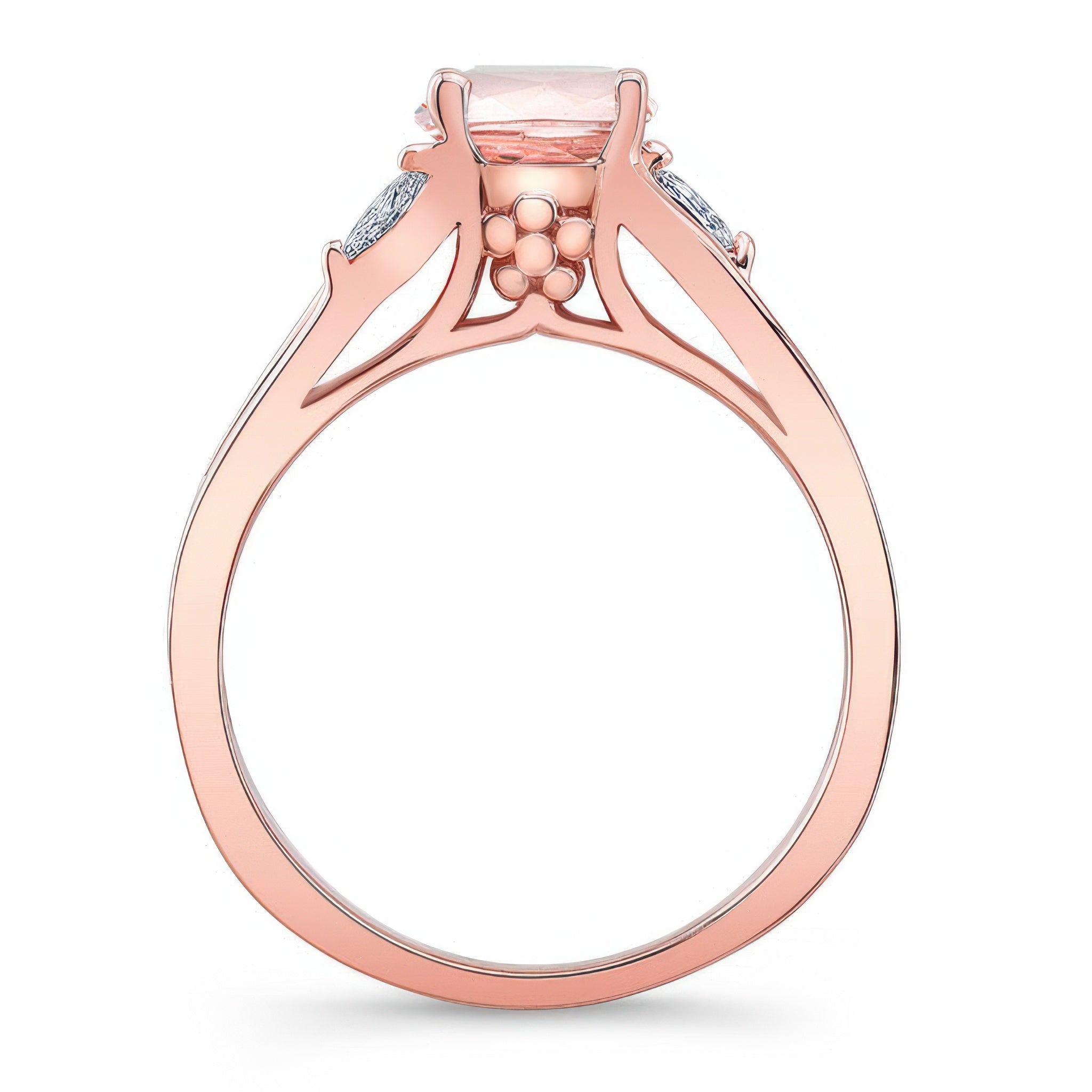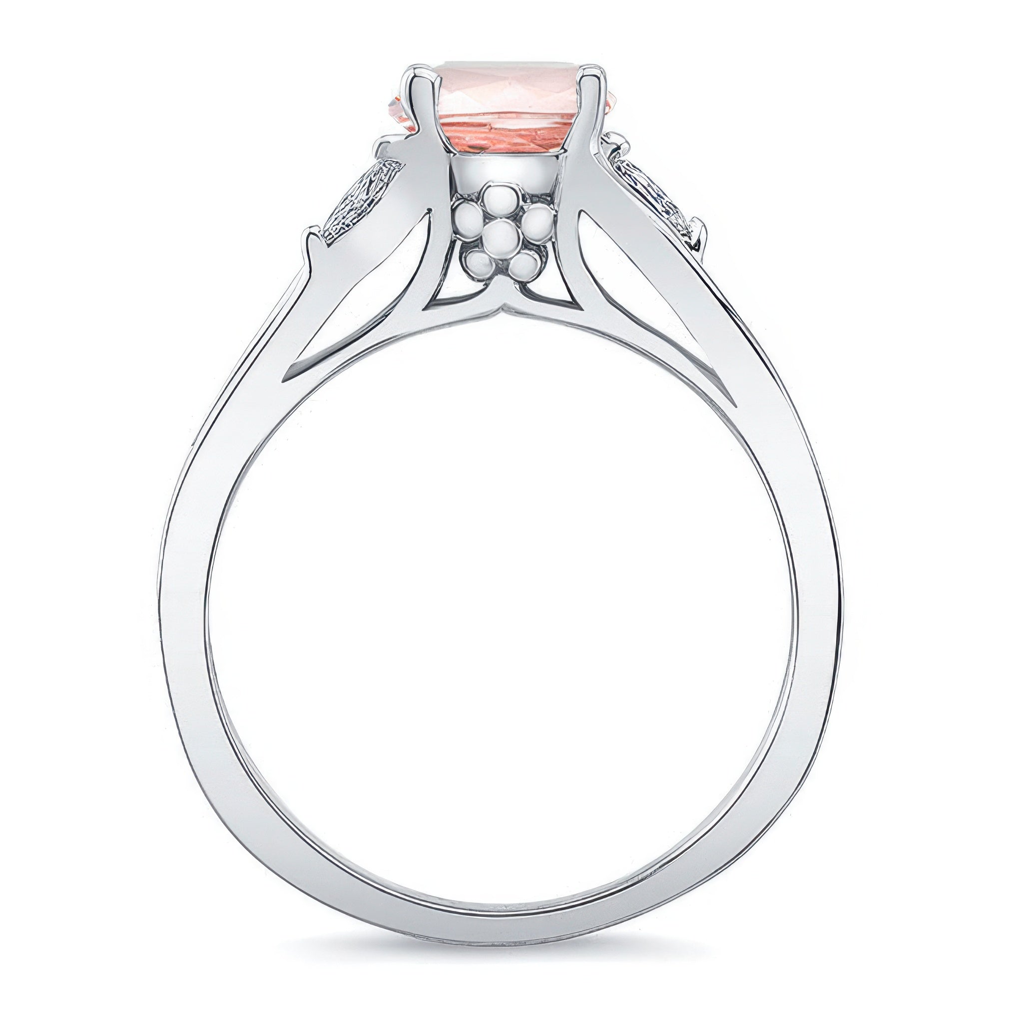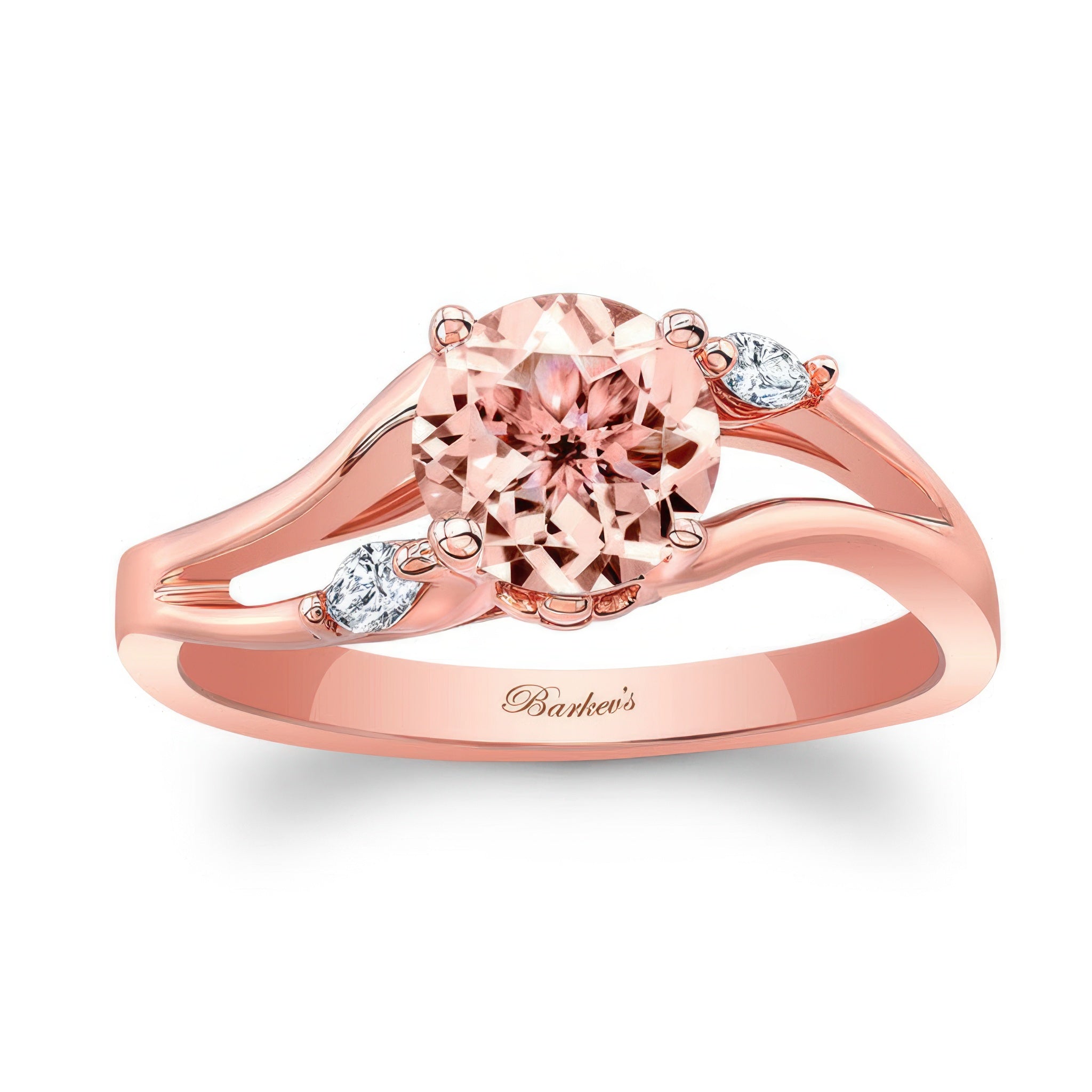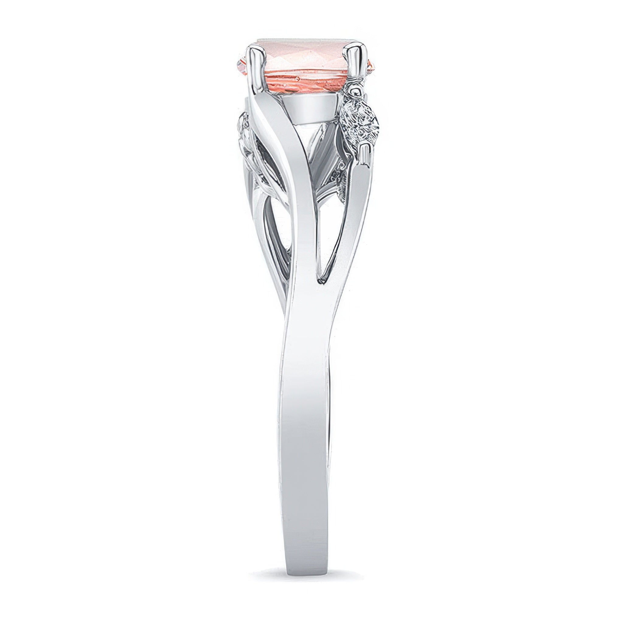 A beautiful v shaped morganite and diamond ring featuring a prong set round center accented with marquise cut diamonds adorning the opposing shoulders of the open split shank for a stylish flare.