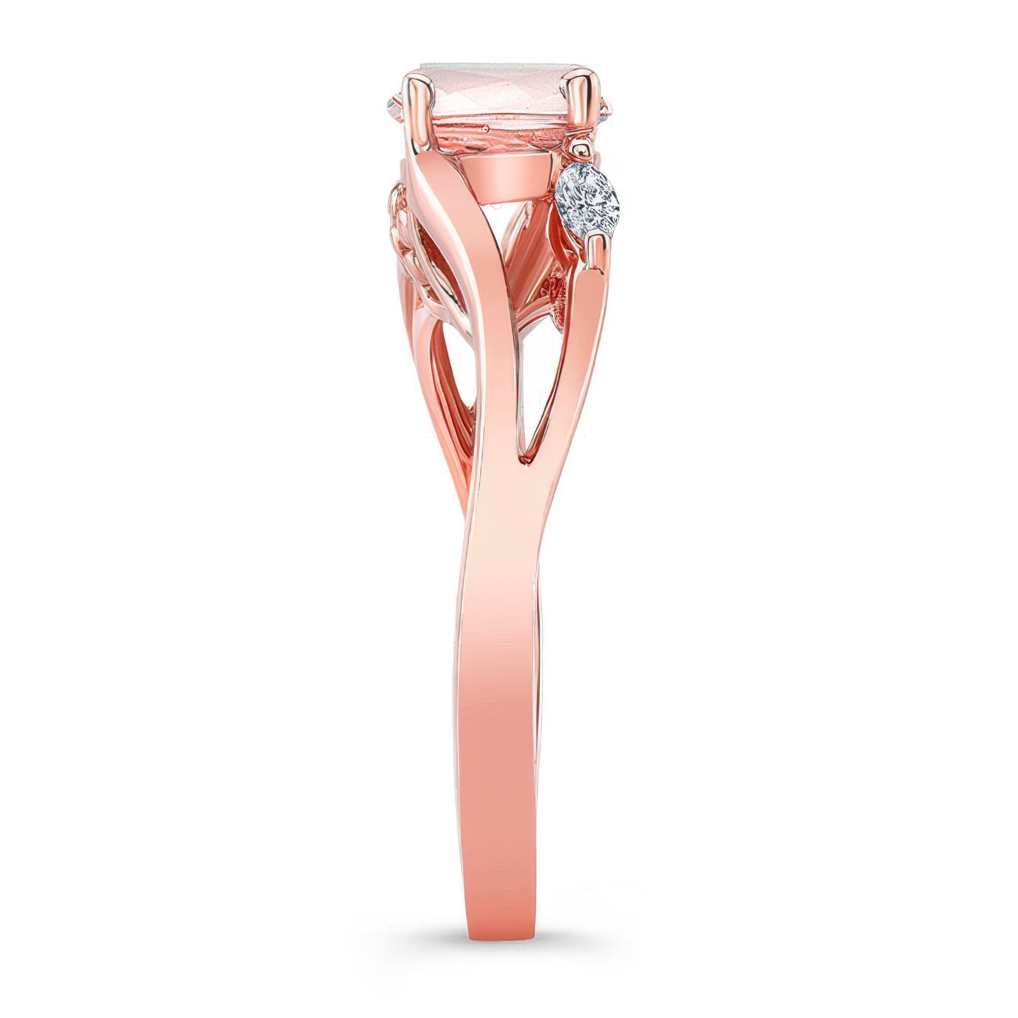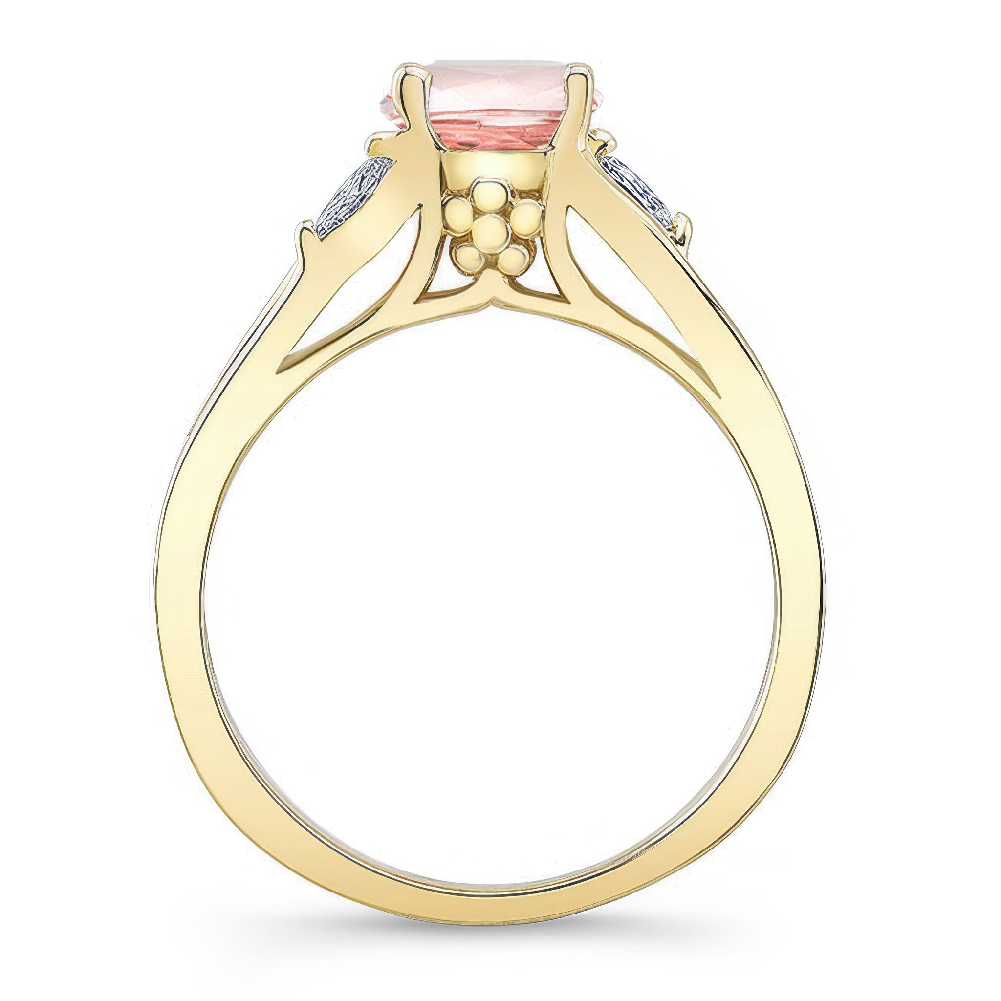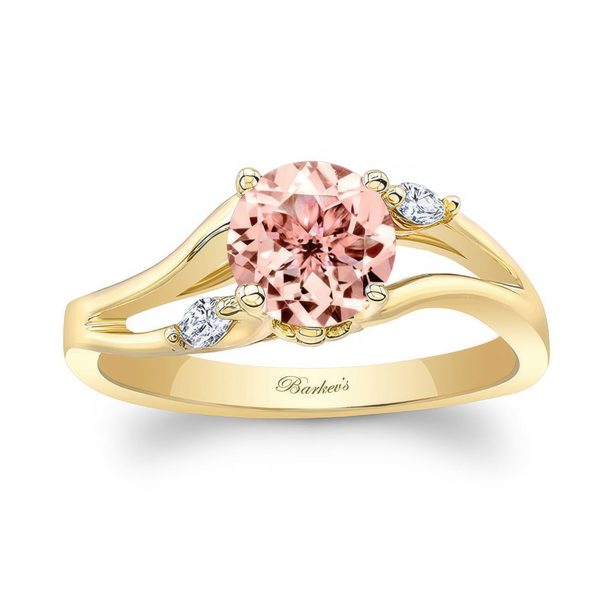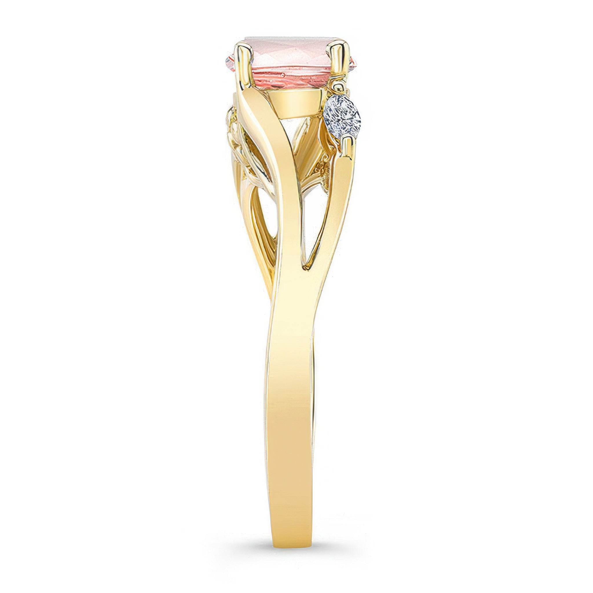 A beautiful v shaped morganite and diamond ring featuring a prong set round center accented with marquise cut diamonds adorning the opposing shoulders of the open split shank for a stylish flare.