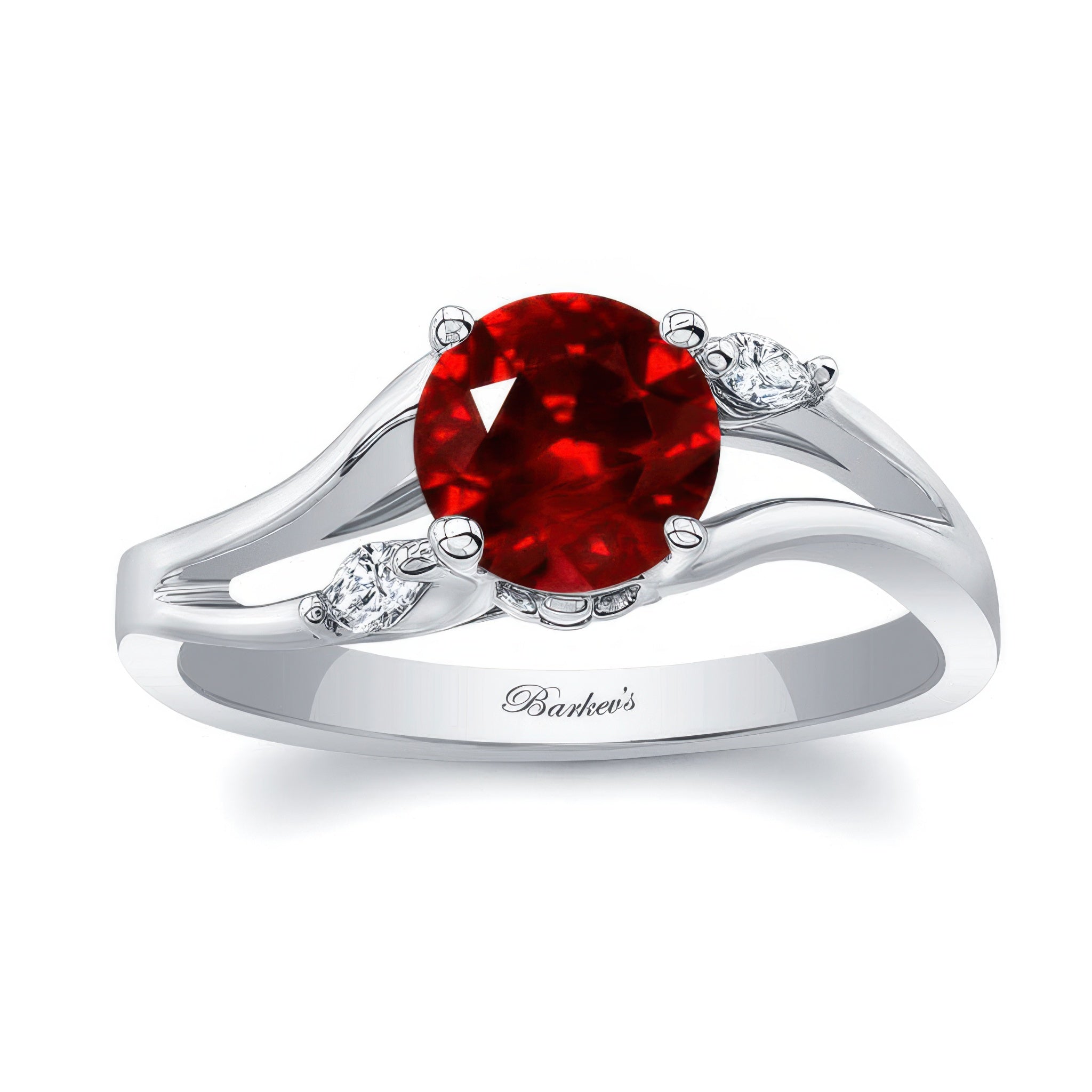 A beautiful v shaped ruby and diamond ring featuring a prong set round center accented with marquise cut diamonds adorning the opposing shoulders of the open split shank for a stylish flare.