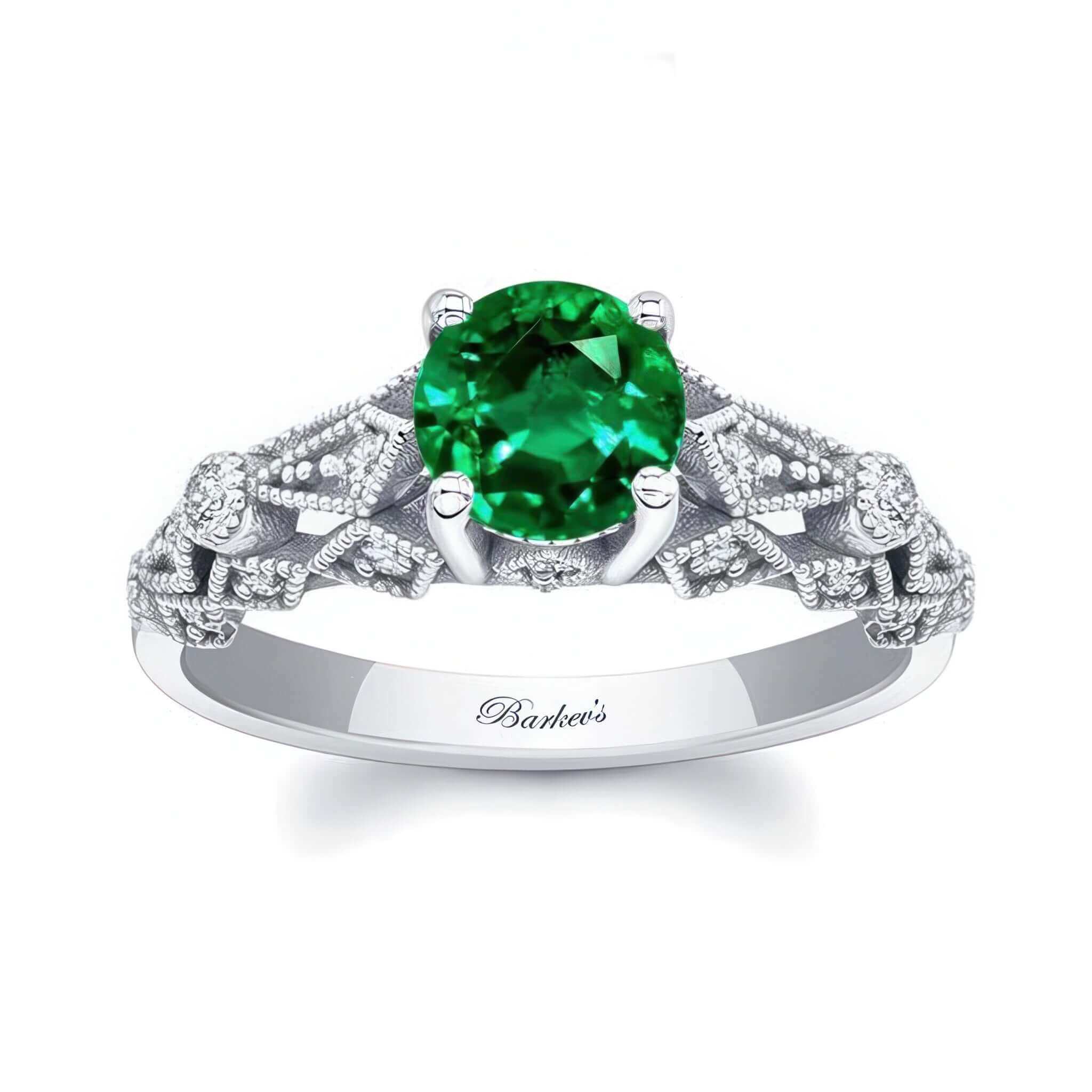 This vintage emerald and diamond ring features a prong set round center with a sprinkle of diamonds set on the intricately detailed shank for a look that's nothing short of stunning.
