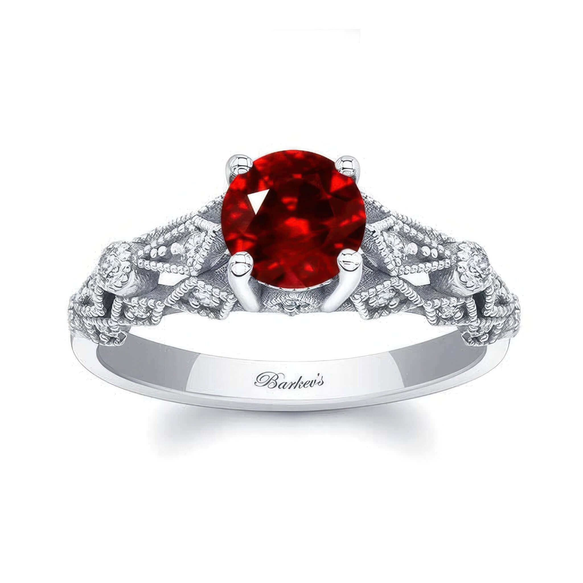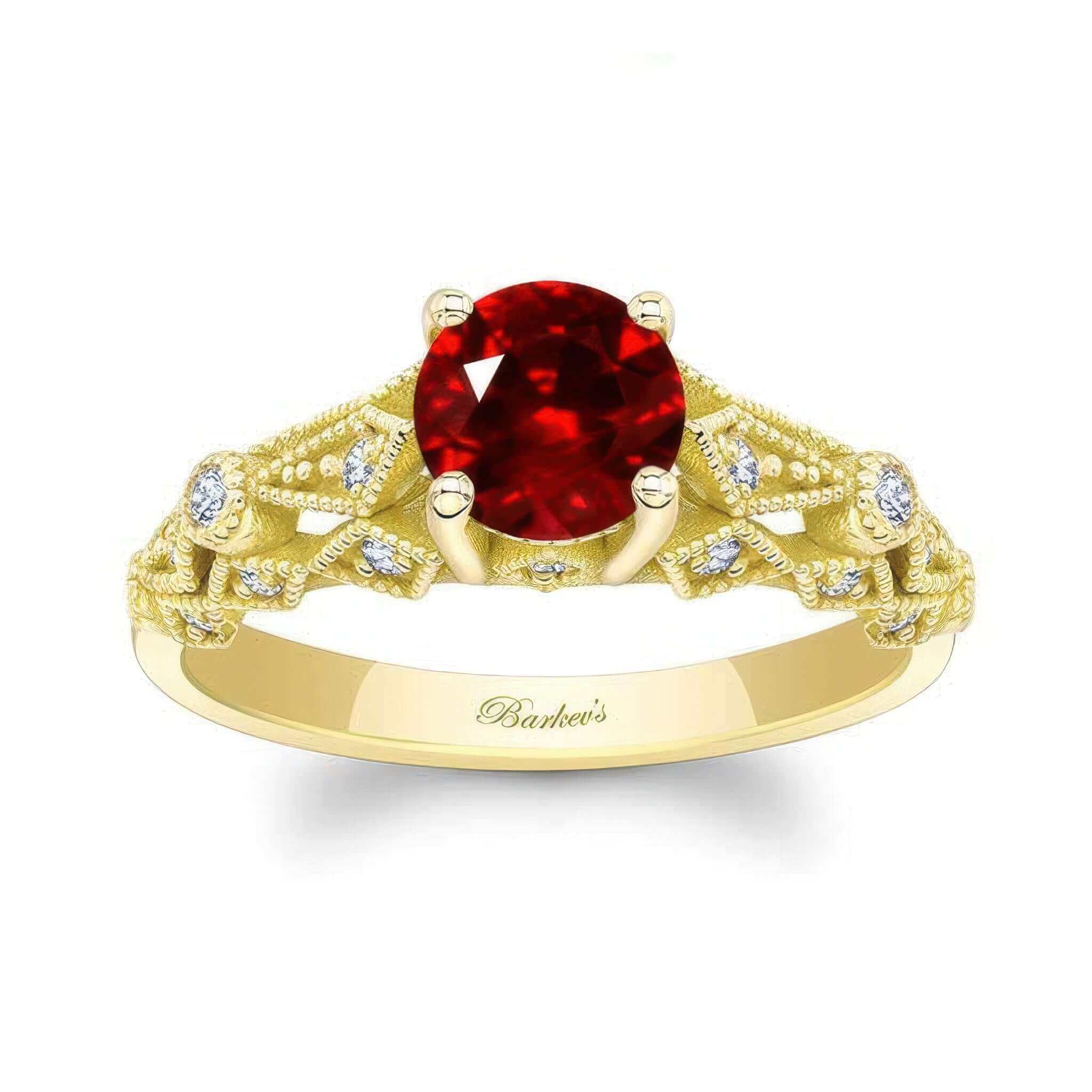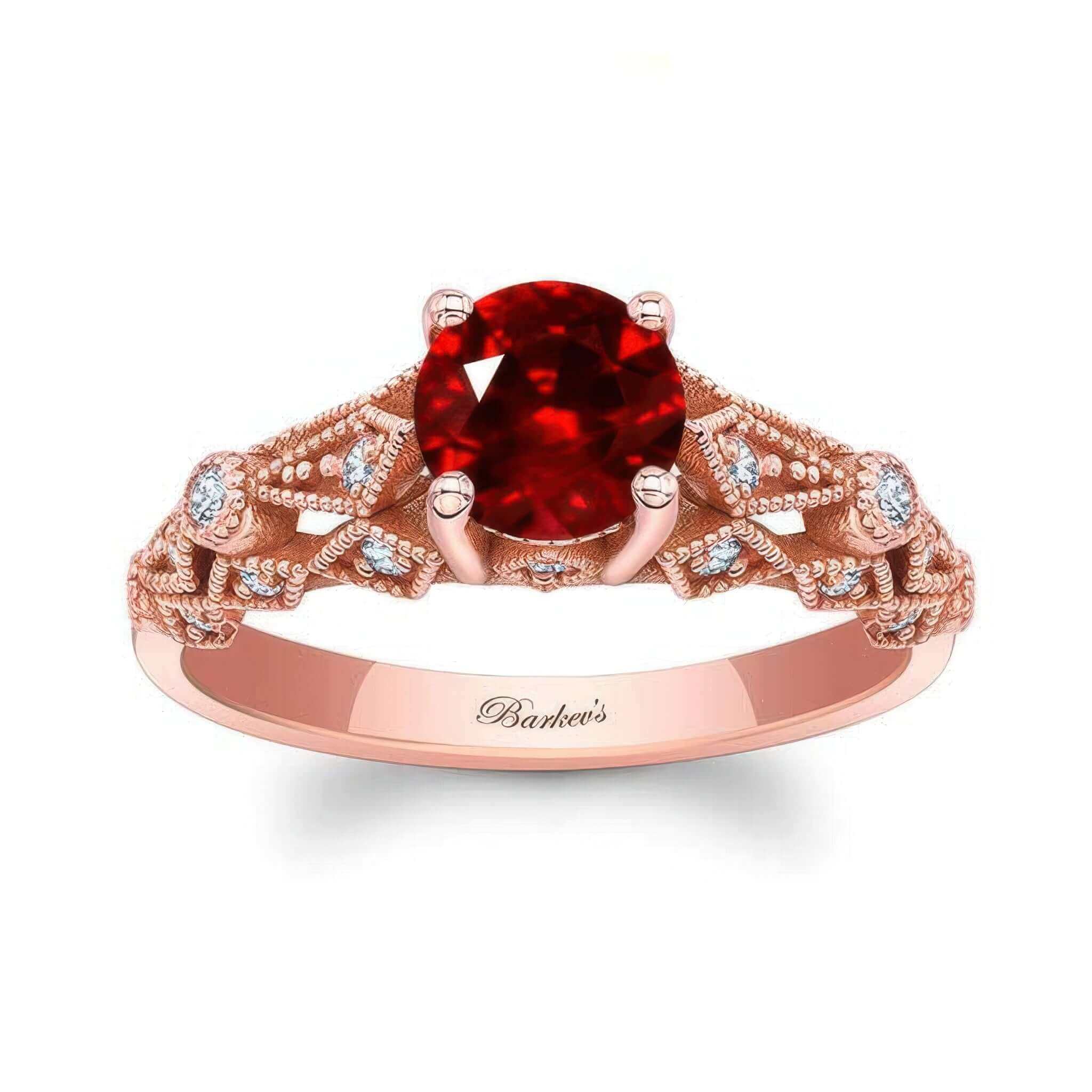 This vintage ruby and diamond ring features a prong set round center with a sprinkle of diamonds set on the intricately detailed shank for a look that's nothing short of stunning.