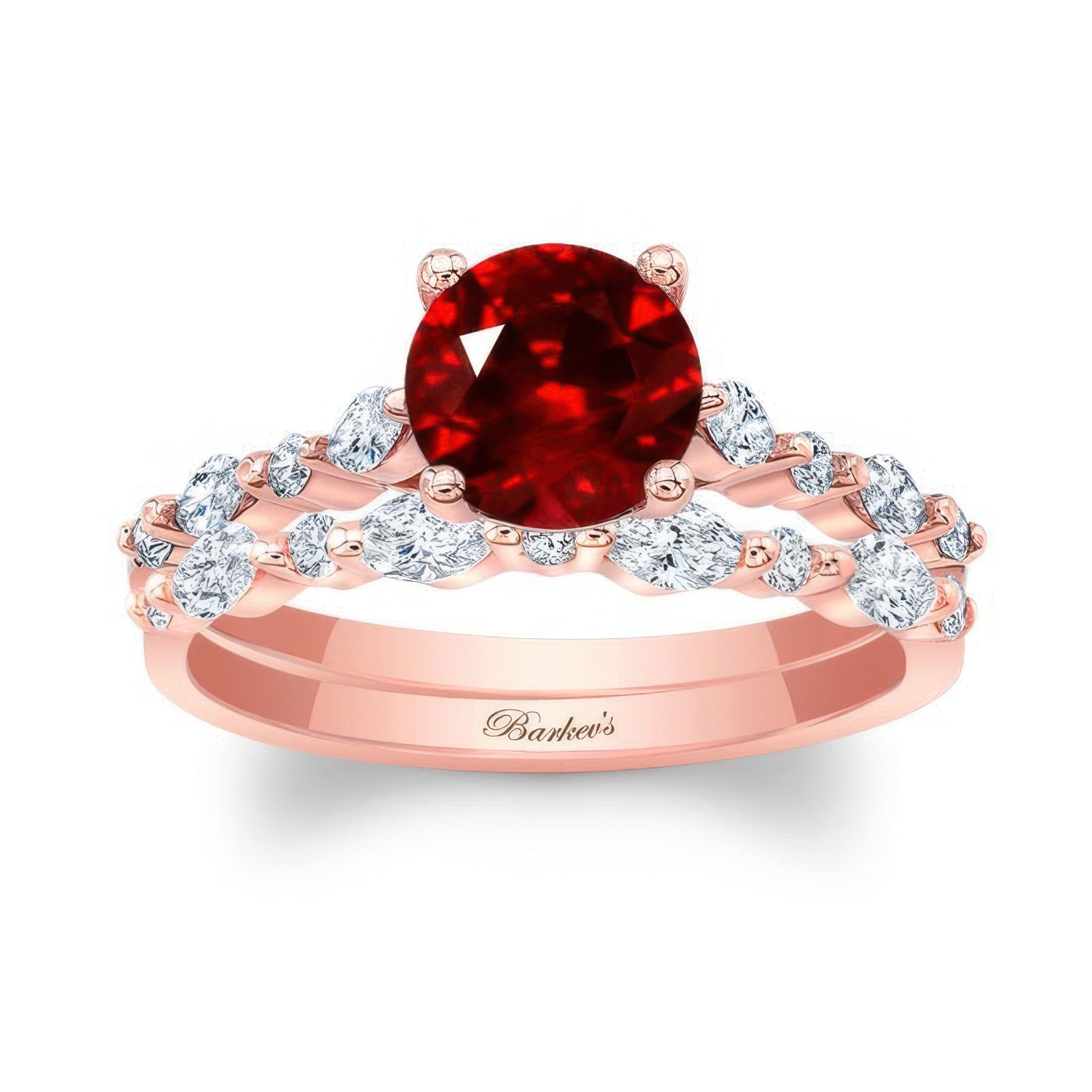 This delicate and chic vintage style ruby and diamond wedding ring set sports a round center adorned on each side by a gentle set of alternating round and marquise diamonds. Comes with a matching diamond wedding band for a stunning look.