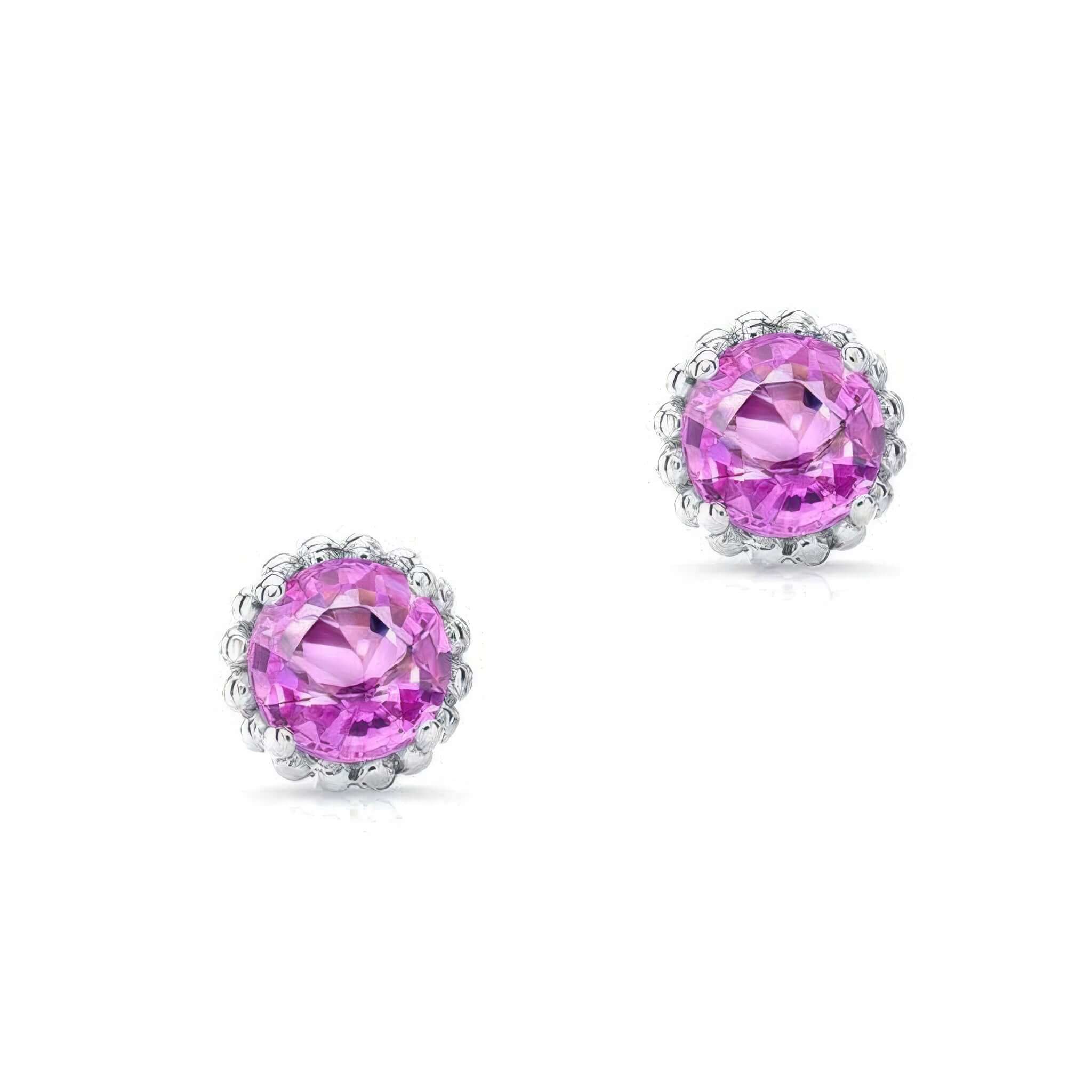 These 1.00ct. pink sapphire studs feature prong set round centers on each side with dainty scrollwork on the gallery and secured comfortably with friction backs.