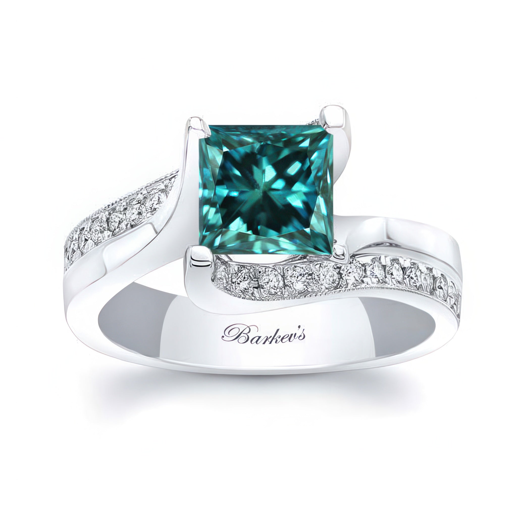 This 1.25 carat blue and white diamond ring features a princess cut center with two opposing shoulders pave set with diamonds and a bright luster finish adding a touch of sophistication.
