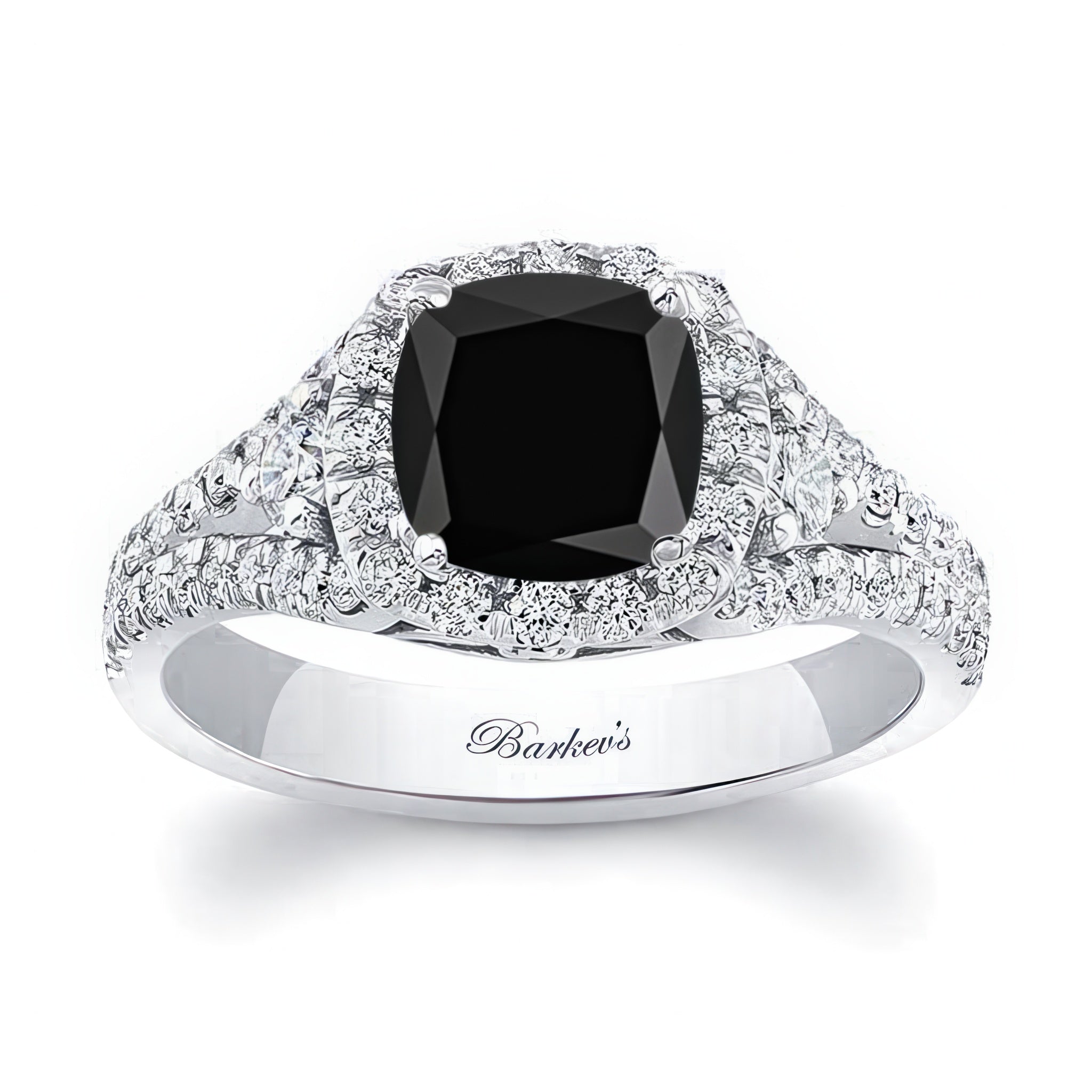 This romantic 1.5 carat cushion cut black and white diamond ring features a shank sporting a prong set cushion cut center with shared prong set diamonds adorning the top and shoulders for a glamorous presentation.