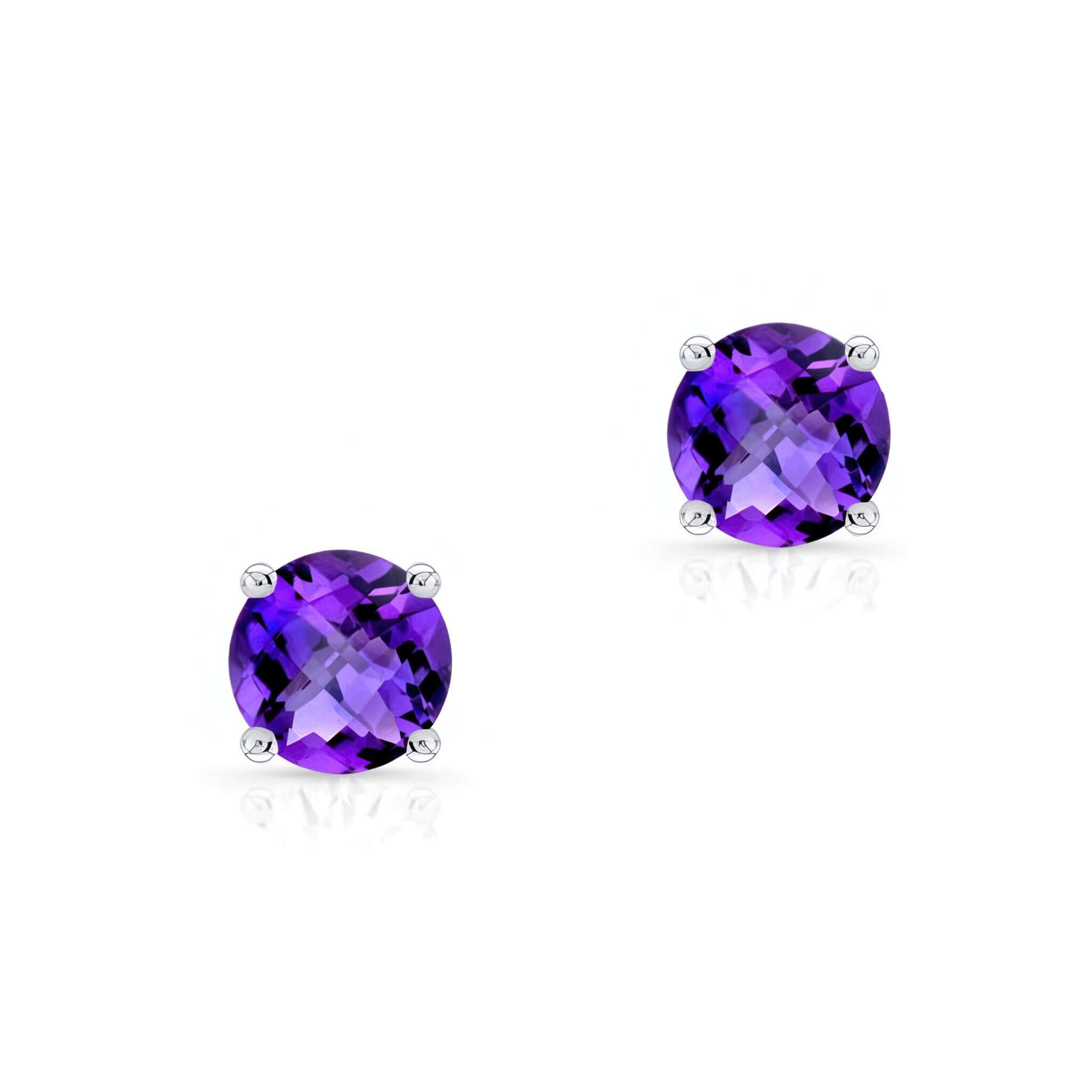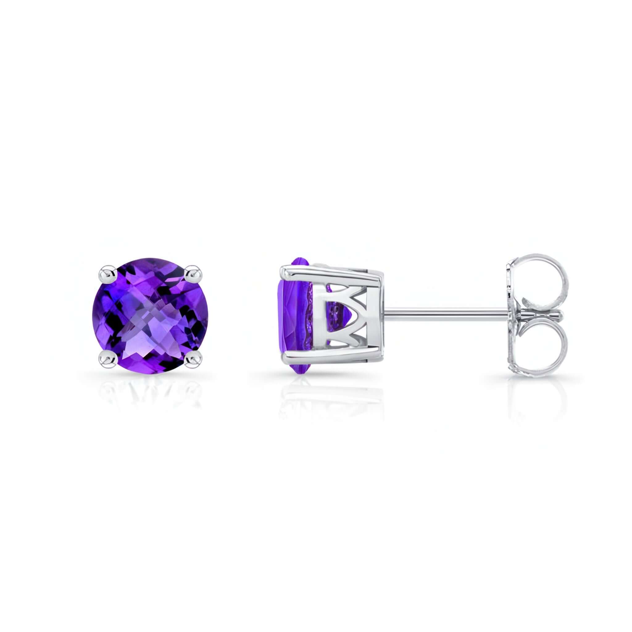 These 1 carat amethyst studs feature prong set round centers on each side with dainty scrollwork on the gallery and secured comfortably with friction backs.