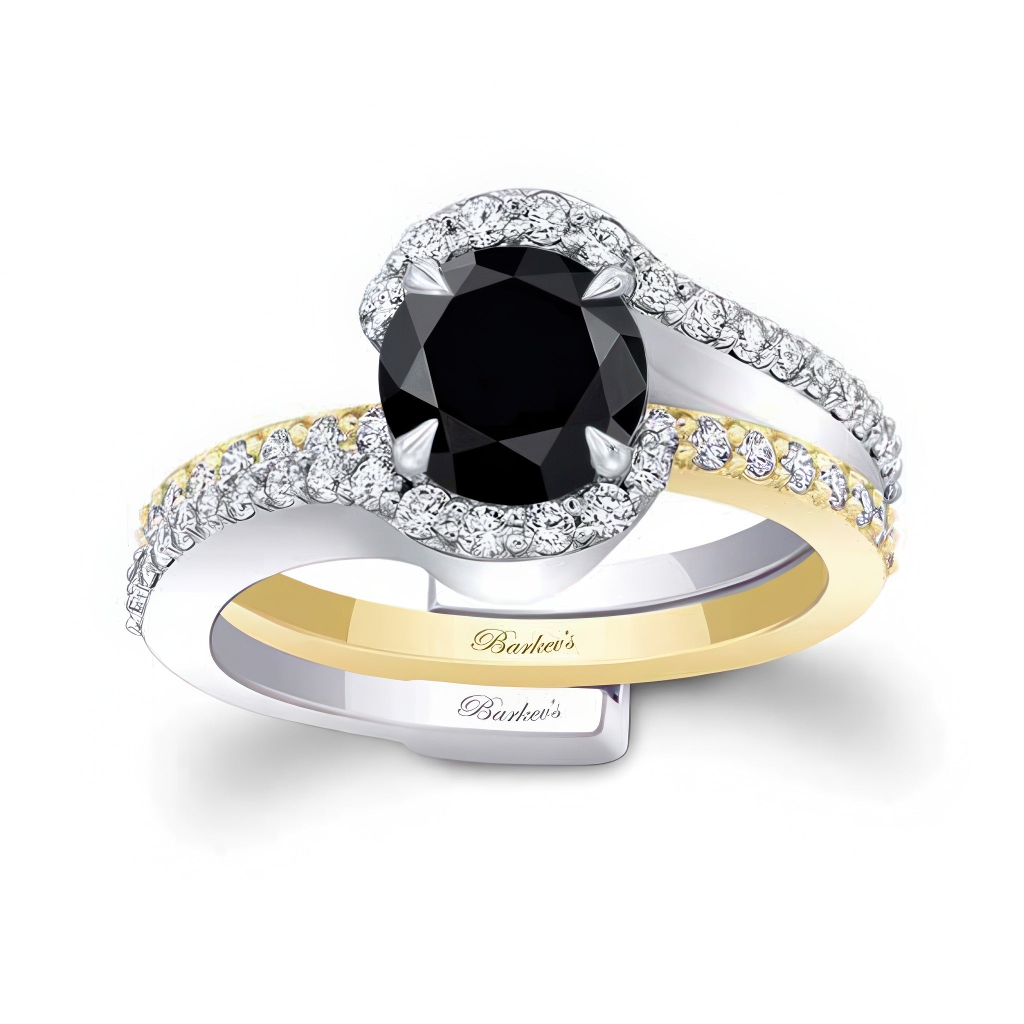 This 1 carat black and white diamond bridal set features a prong set round center with pave diamonds and a diamond wedding band that slips in between the split shank.