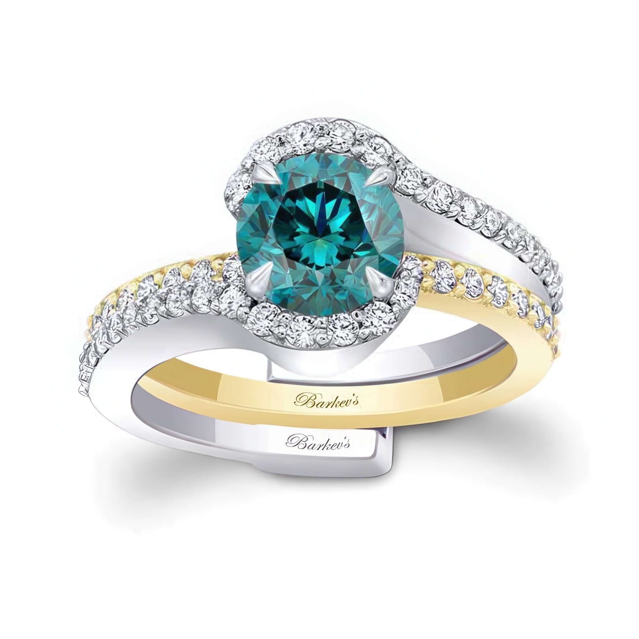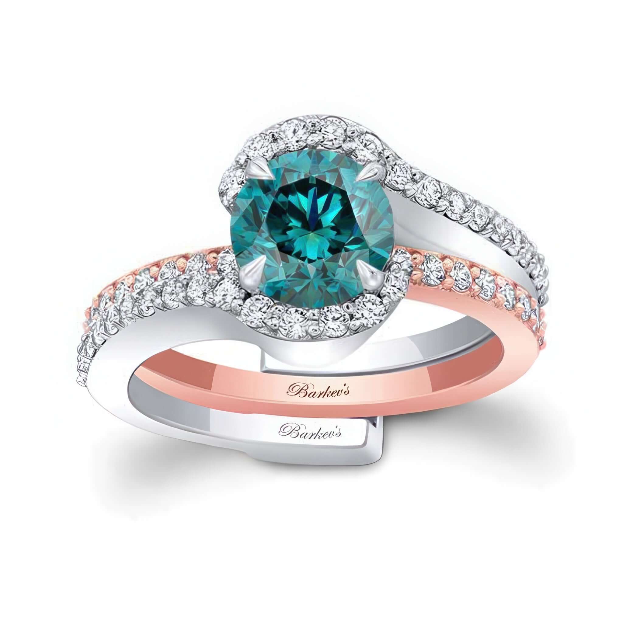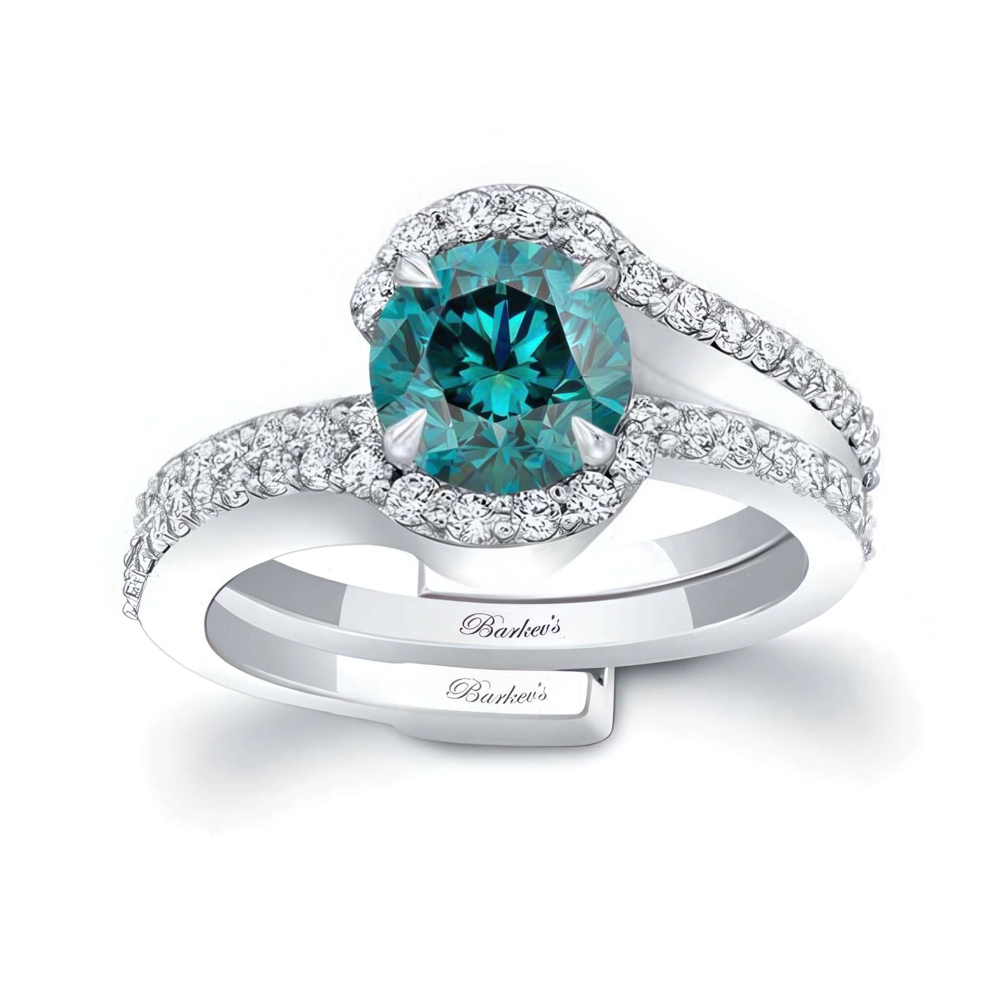 This 1 carat blue and white diamond bridal set features a prong set round center with pave diamonds and a diamond wedding band that slips in between the split shank.