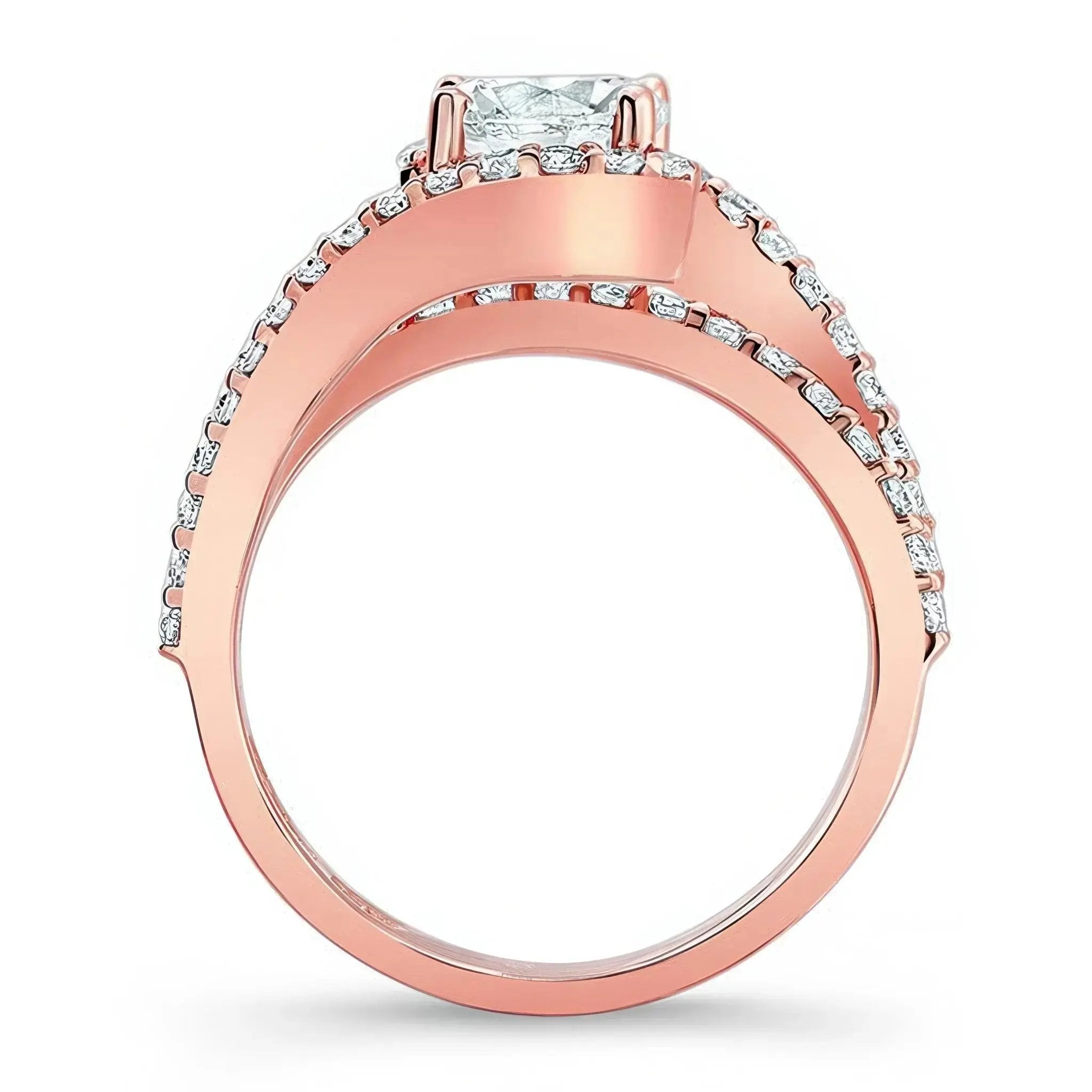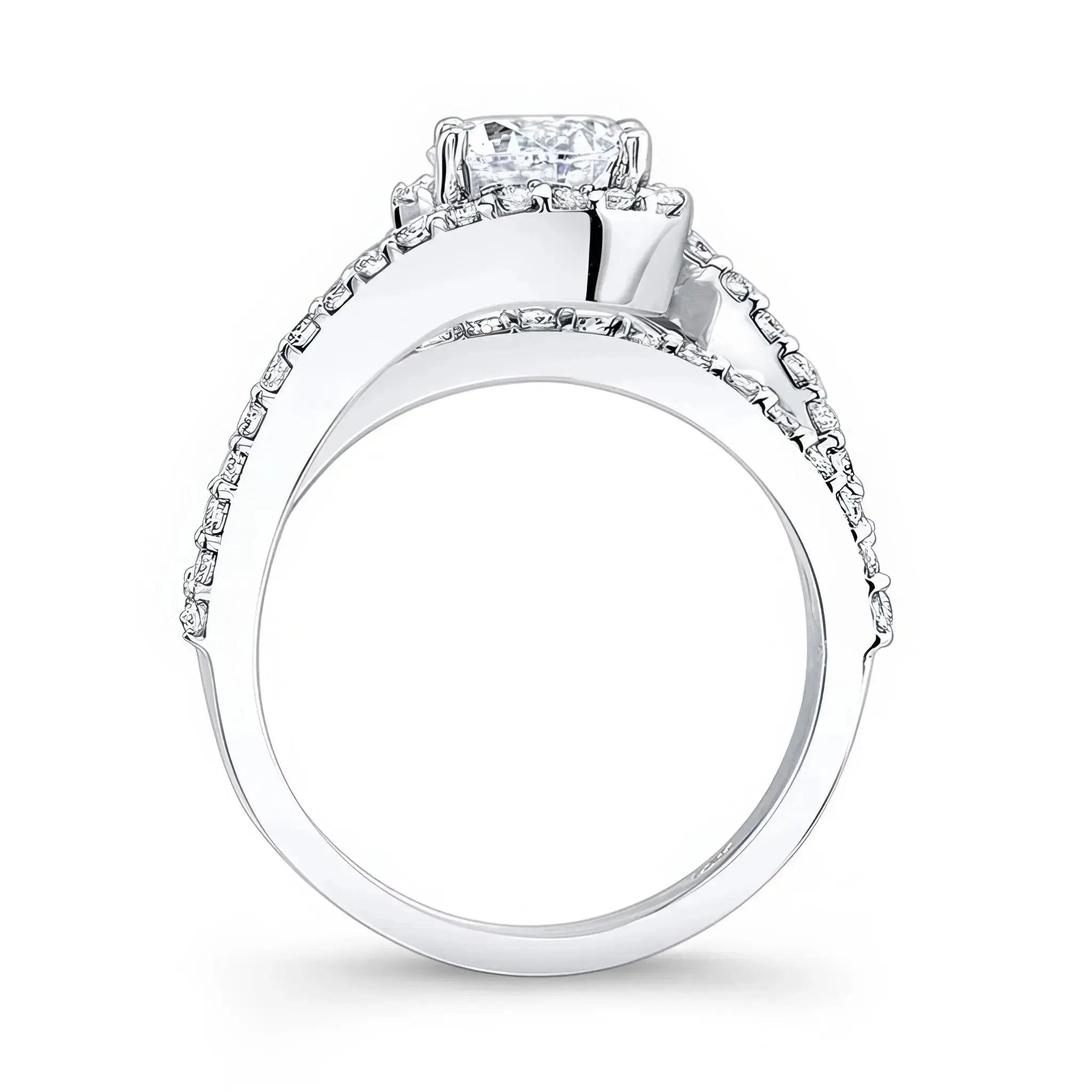This 1 carat lab diamond ring features a split shank that curves around the prong set round center and a bridge running underneath adorned with shared prong set diamonds for a classic yet brilliant look.