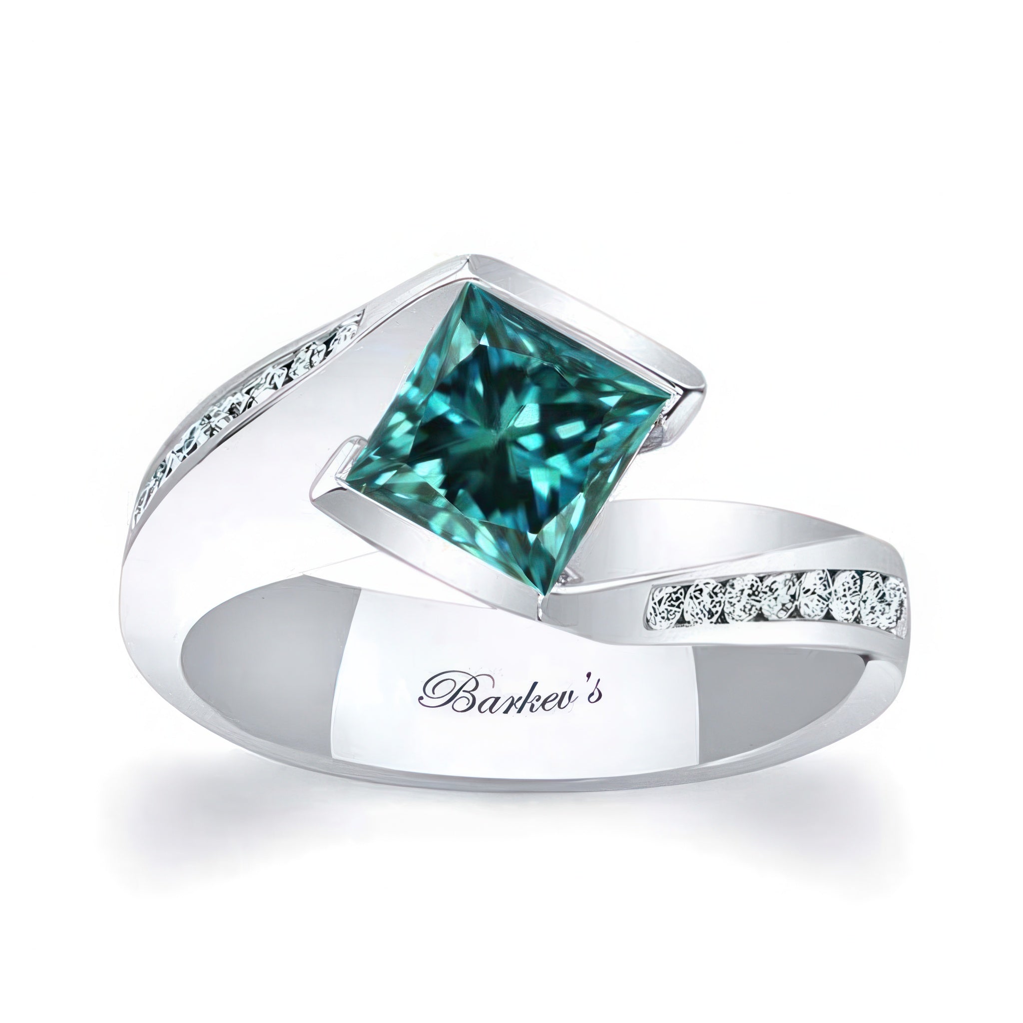 This 1 carat princess cut blue and white diamond bypass ring features a channel set princess cut center with pave diamonds cascading down the sides.