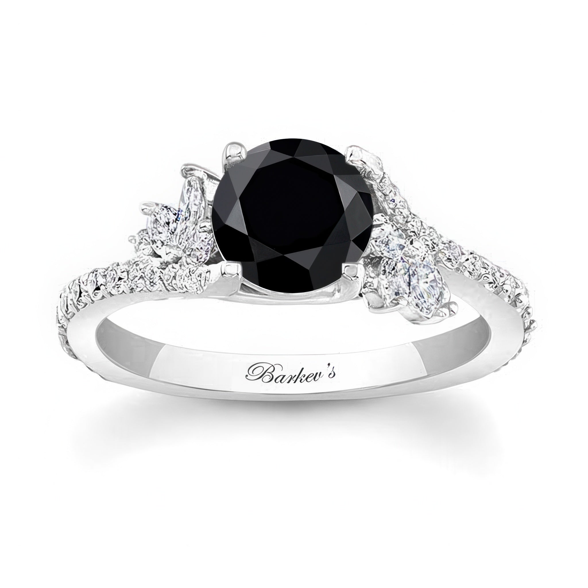 This elegant 1 carat round black and white diamond ring features a prong set center stone graced on each side with a flare of marquise and round diamonds cascading down the dainty shank.