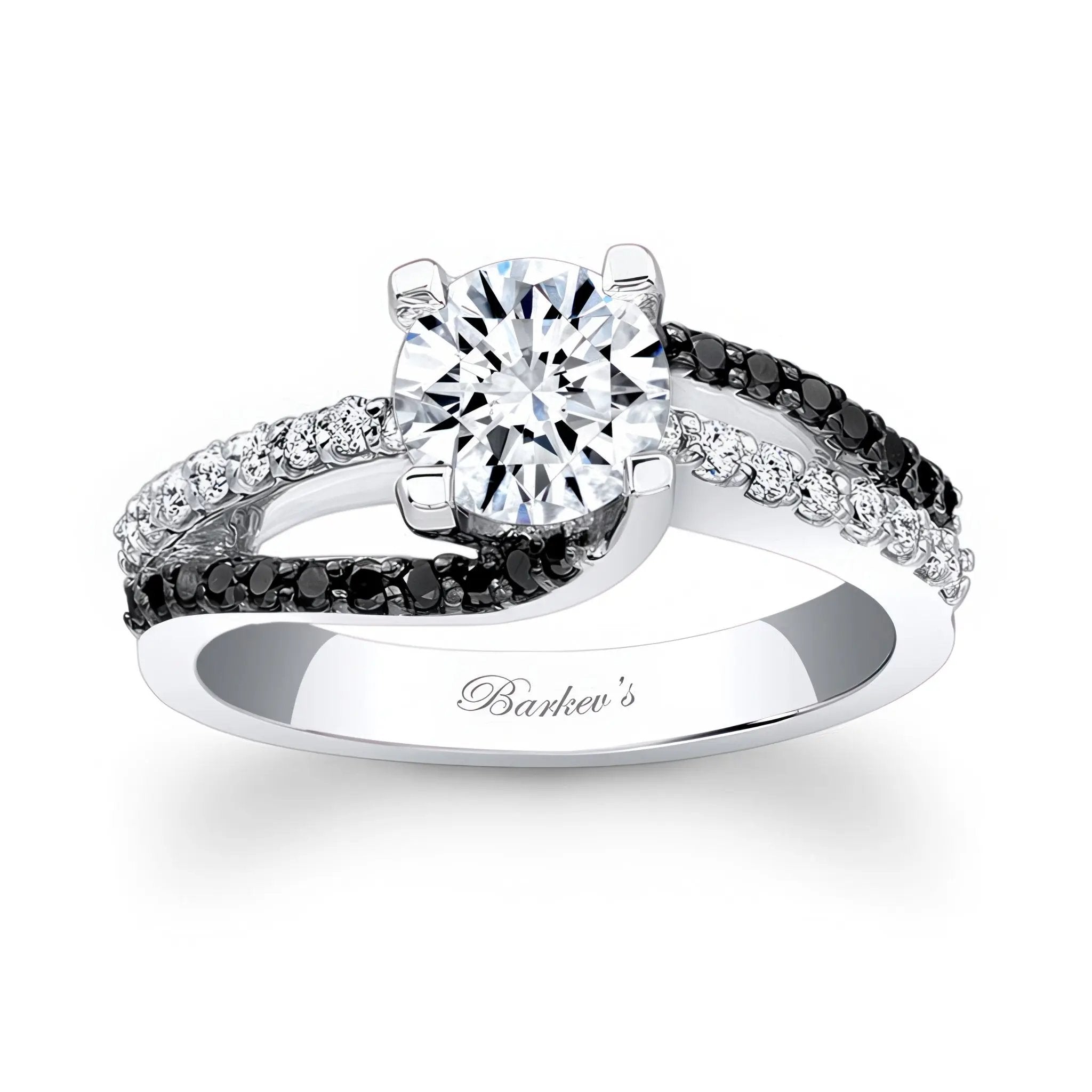 A classic 1 carat round cut moissanite black diamond accent ring featuring a prong set center with shared prong set black diamonds adorning the sides and white diamonds set on the bridge for an elegant touch of drama.