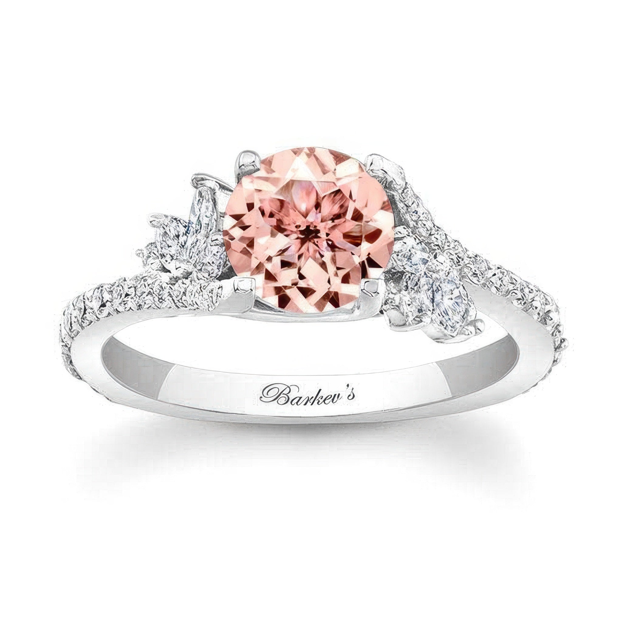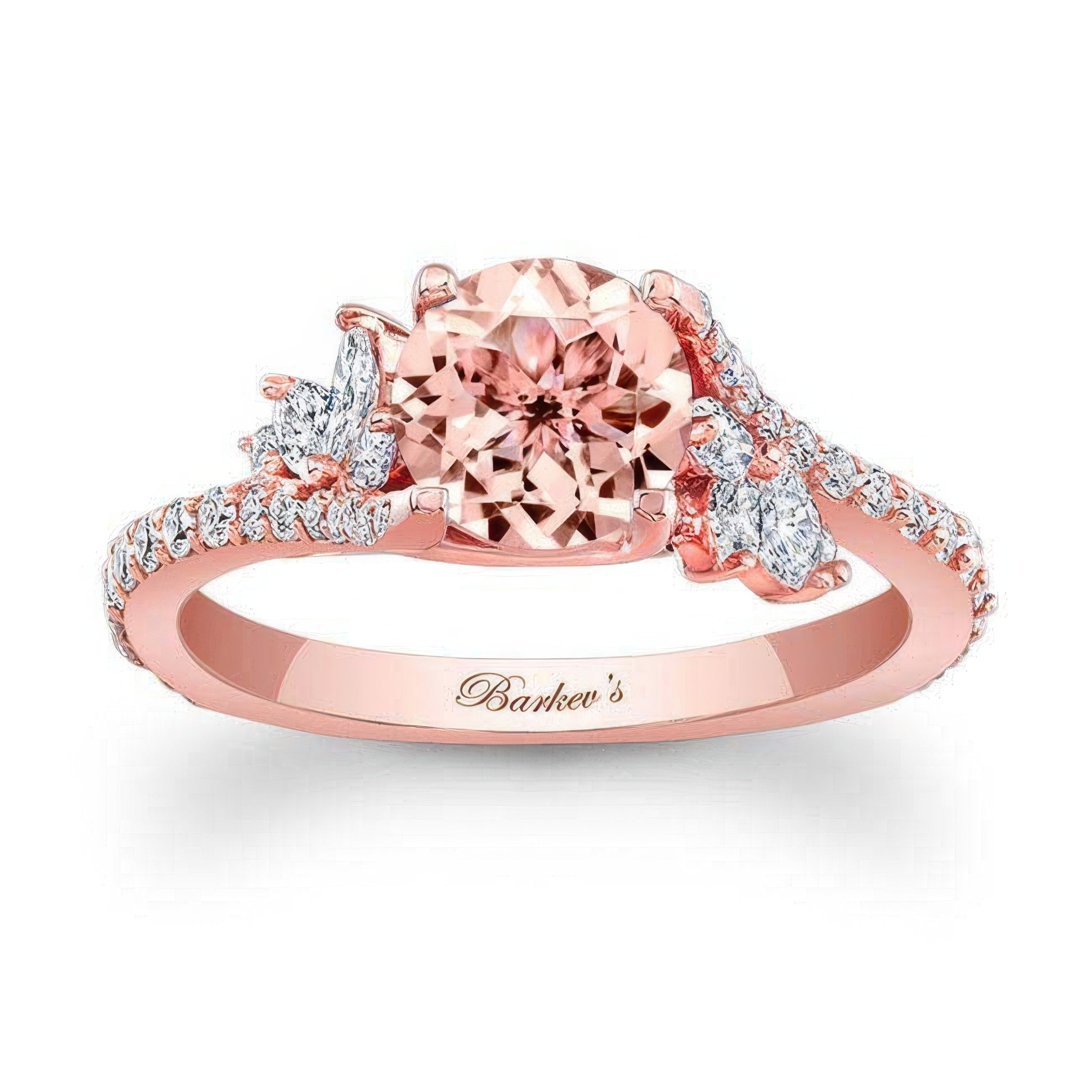 This elegant 1 carat round morganite ring features a prong set center stone graced on each side with a flare of marquise and round diamonds cascading down the dainty shank.