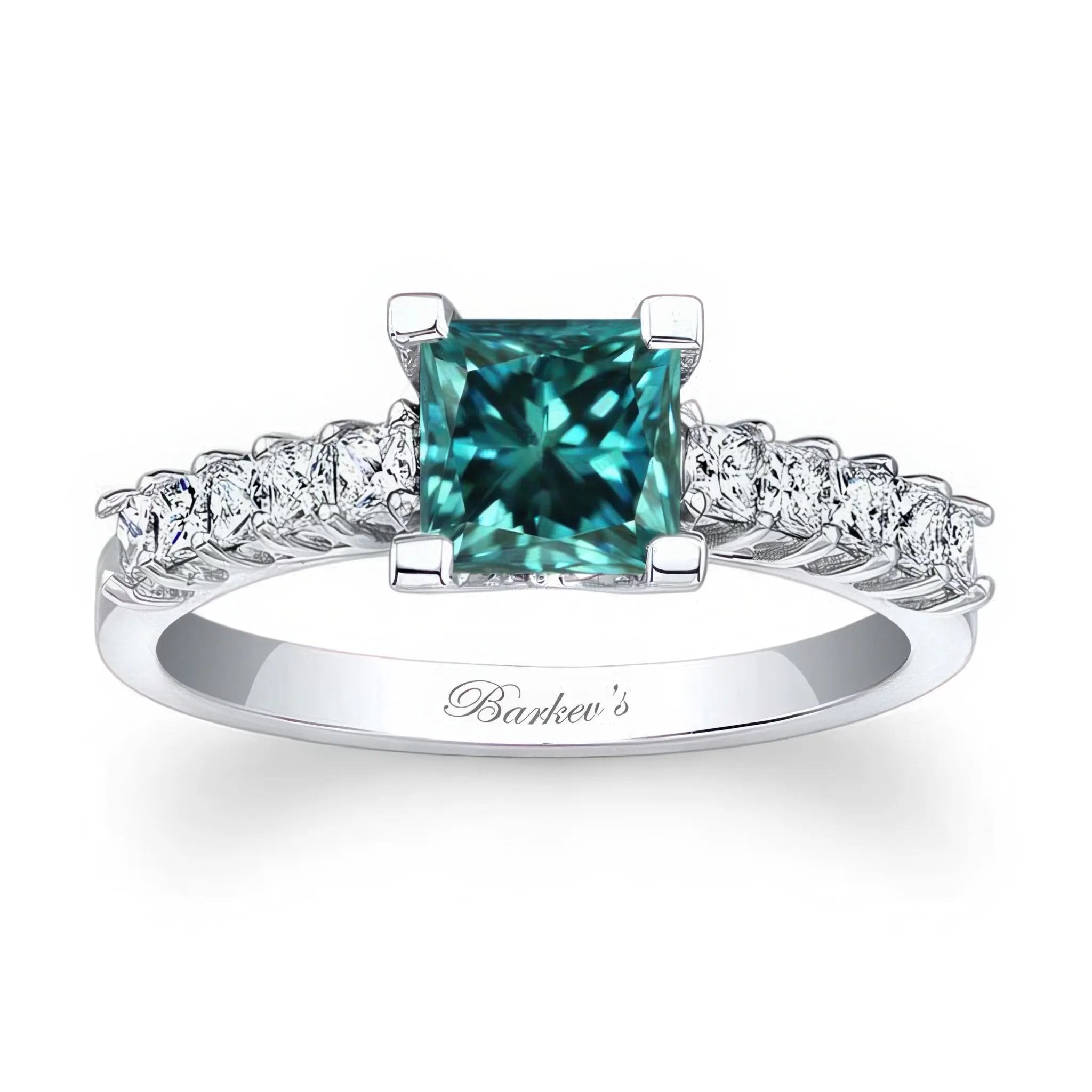 A classic 1 ct princess cut blue and white diamond ring featuring a prong set center and a row of princess cut diamonds set with shared prongs cascading down the shoulders for an added touch of bling.