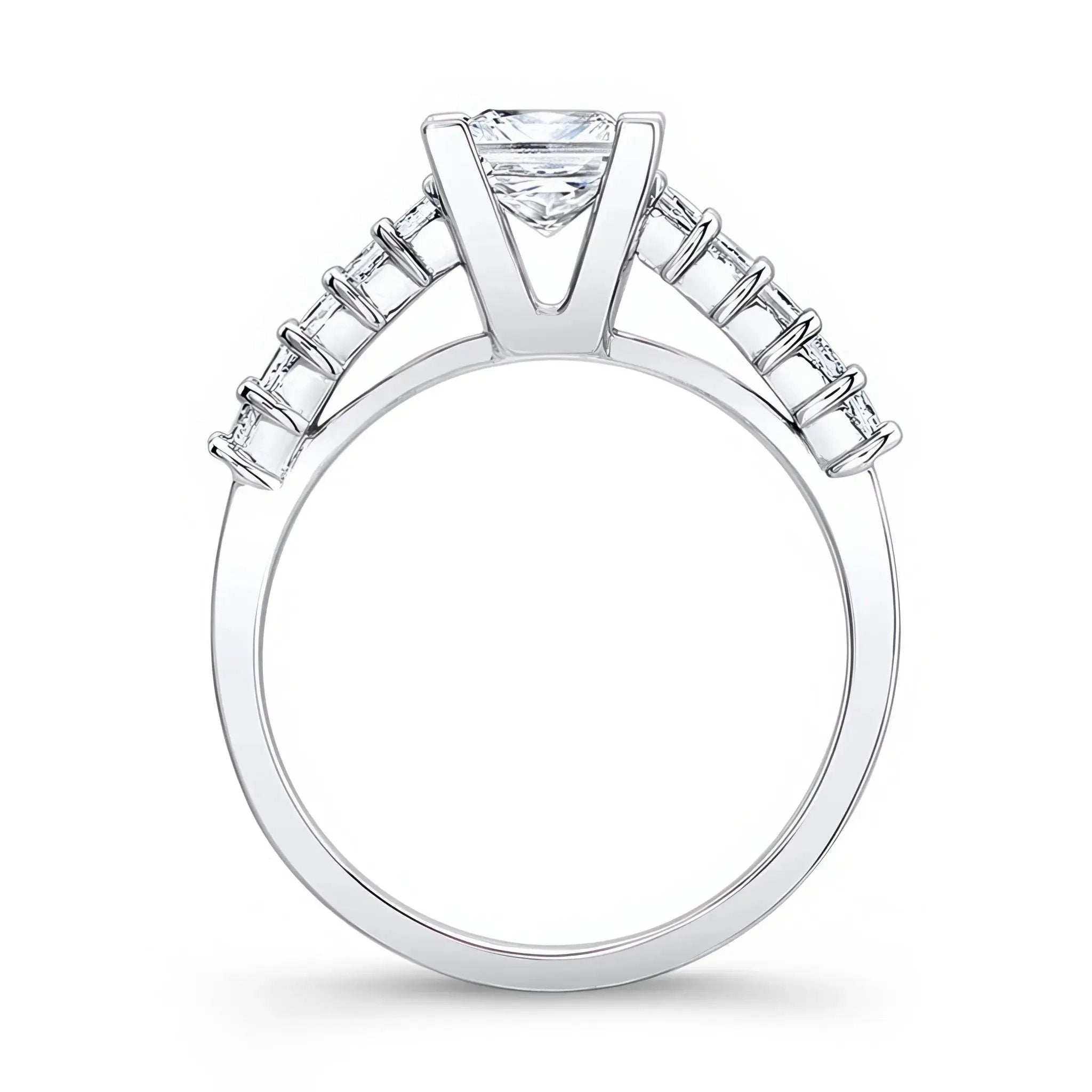 A classic 1 ct princess cut moissanite ring featuring a prong set center and a row of princess cut diamonds set with shared prongs cascading down the shoulders for an added touch of bling.