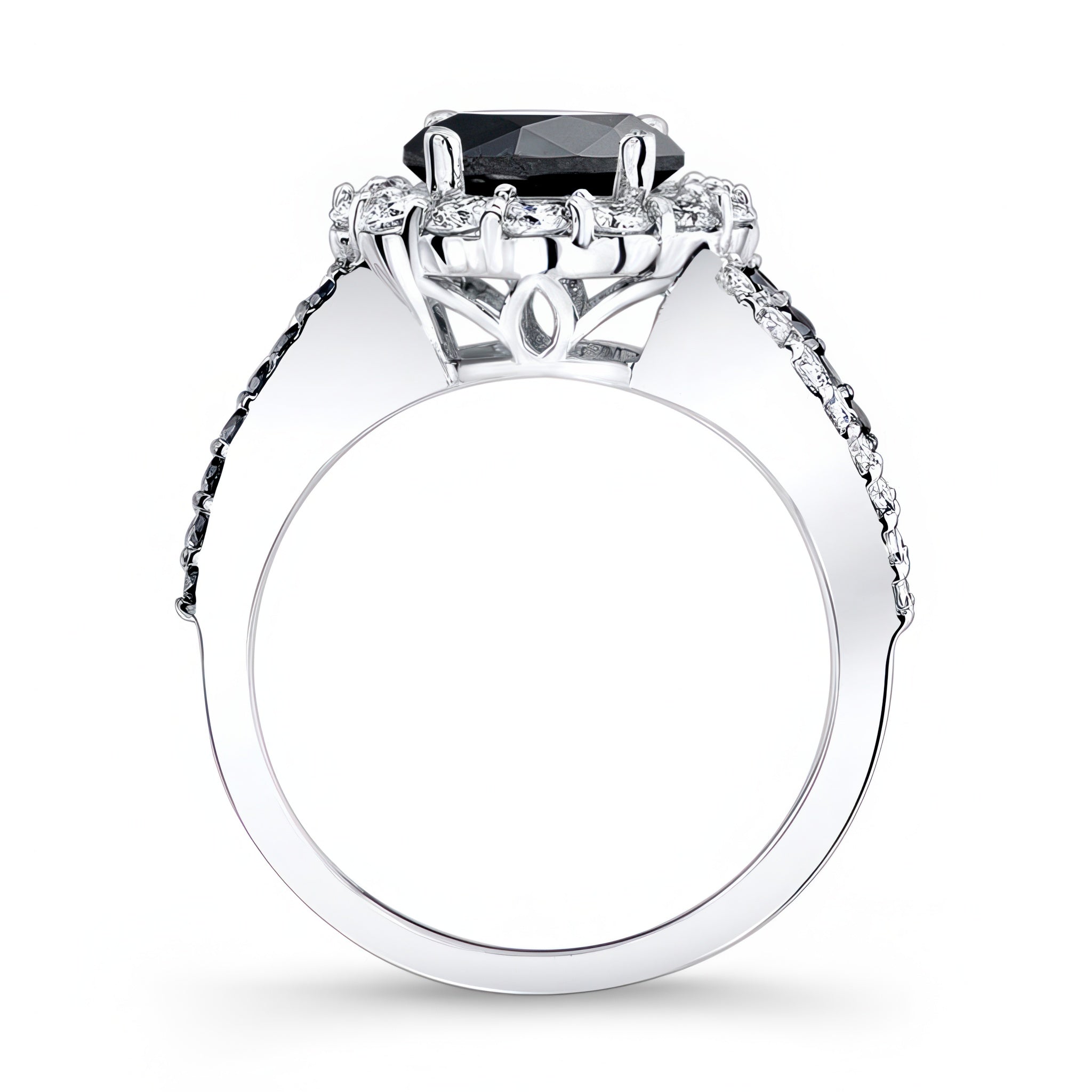 This 2 carat black diamond ring features a prong set round center with a diamond halo and shared prong set black and white diamonds on the curving ridges for an added touch of intrigue.