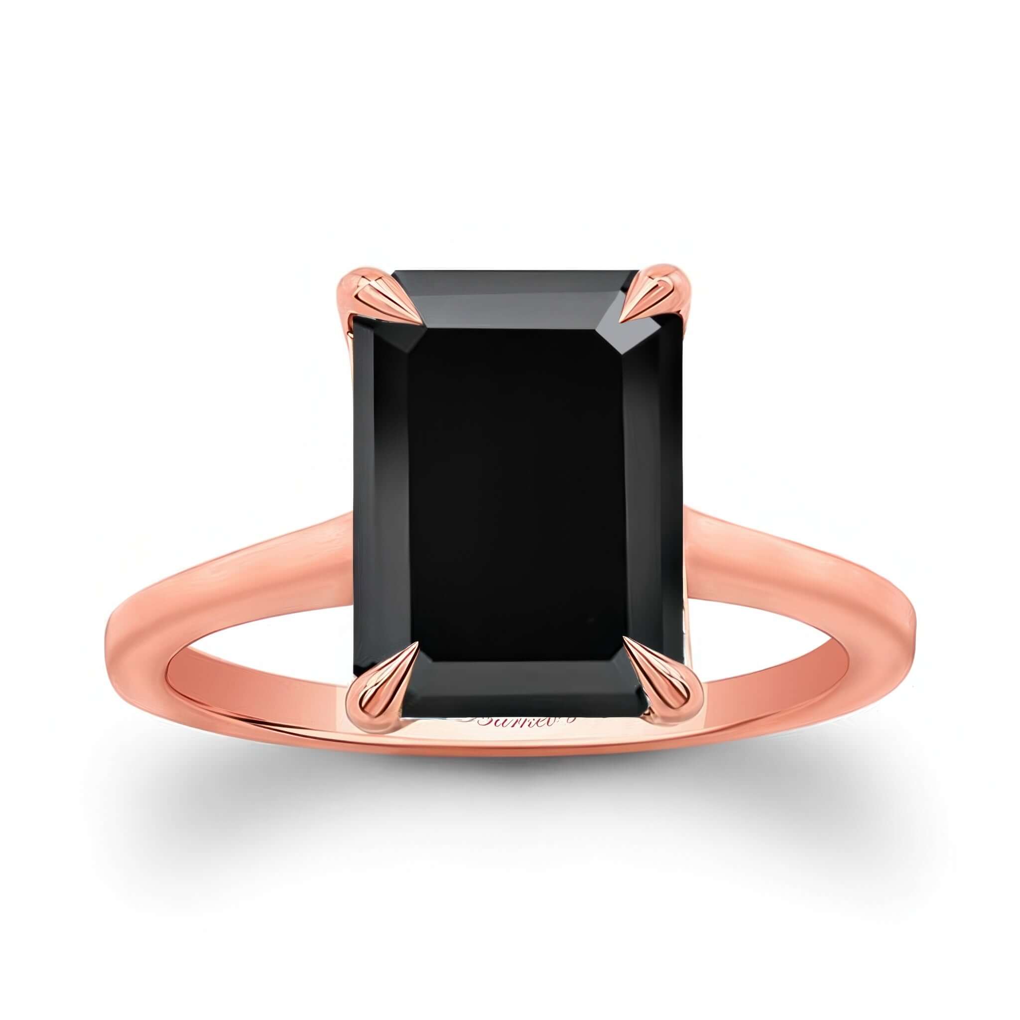 A beautiful 2 carat emerald cut black diamond solitaire engagement ring featuring a simple shank design that diverts all the attention to the sparkling centerpiece.