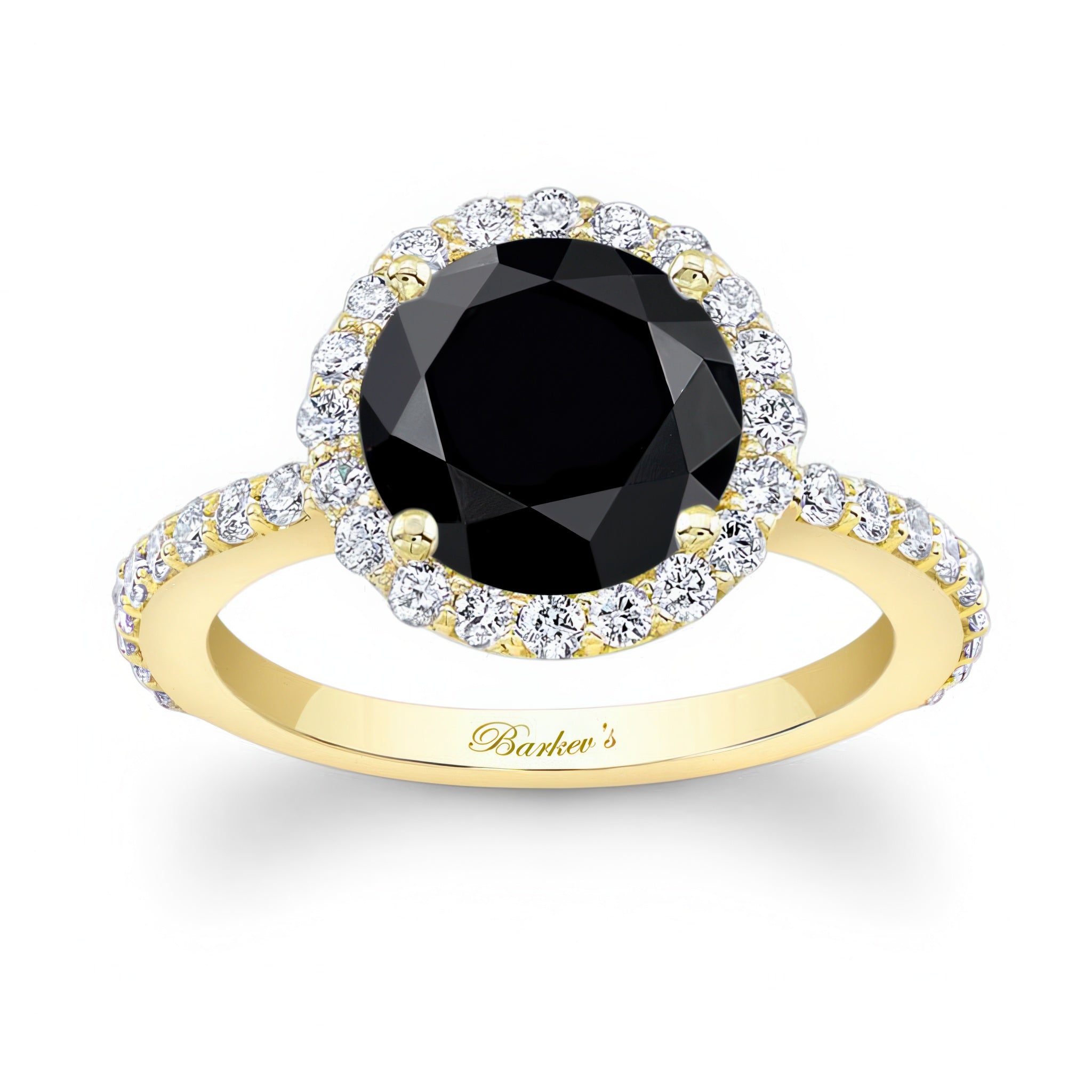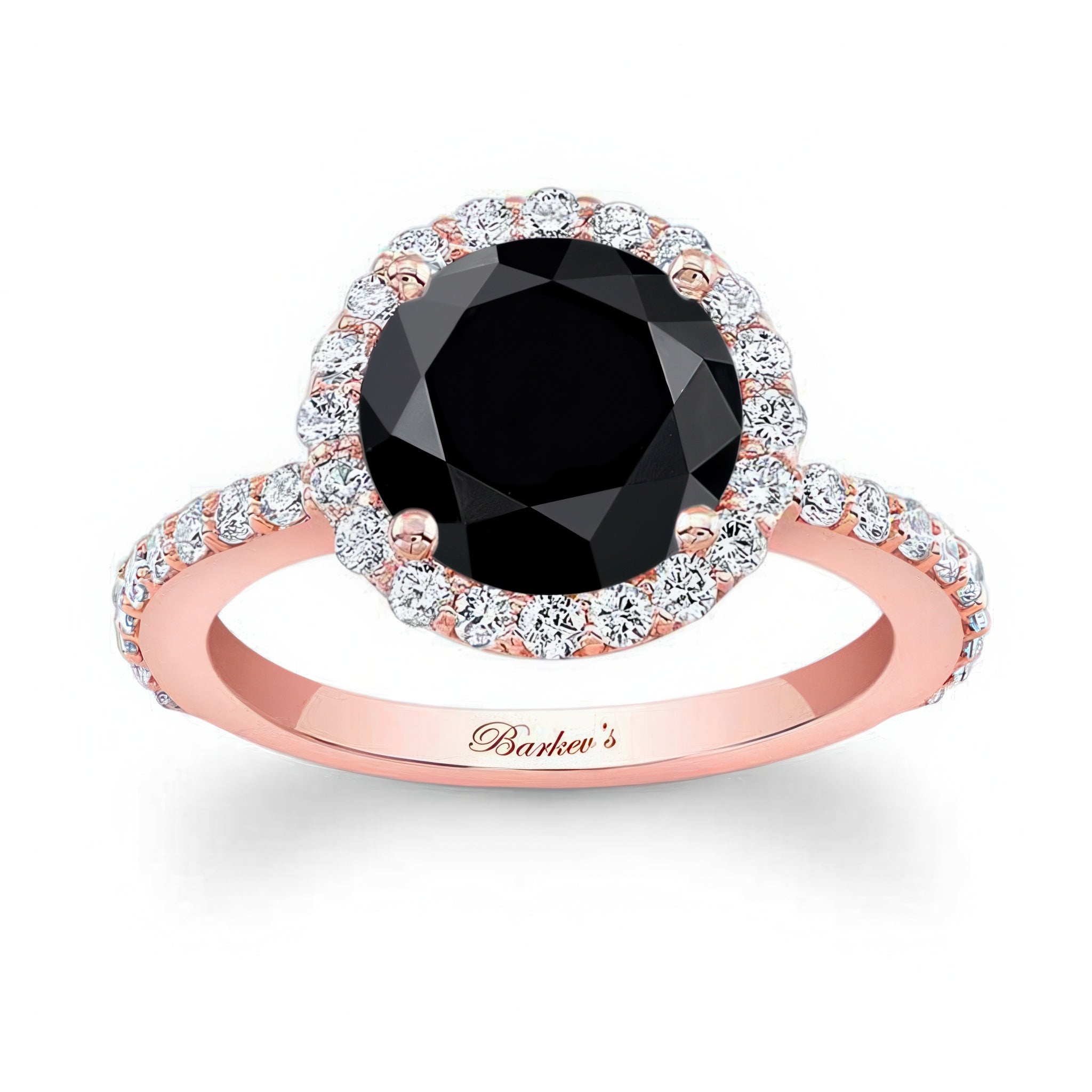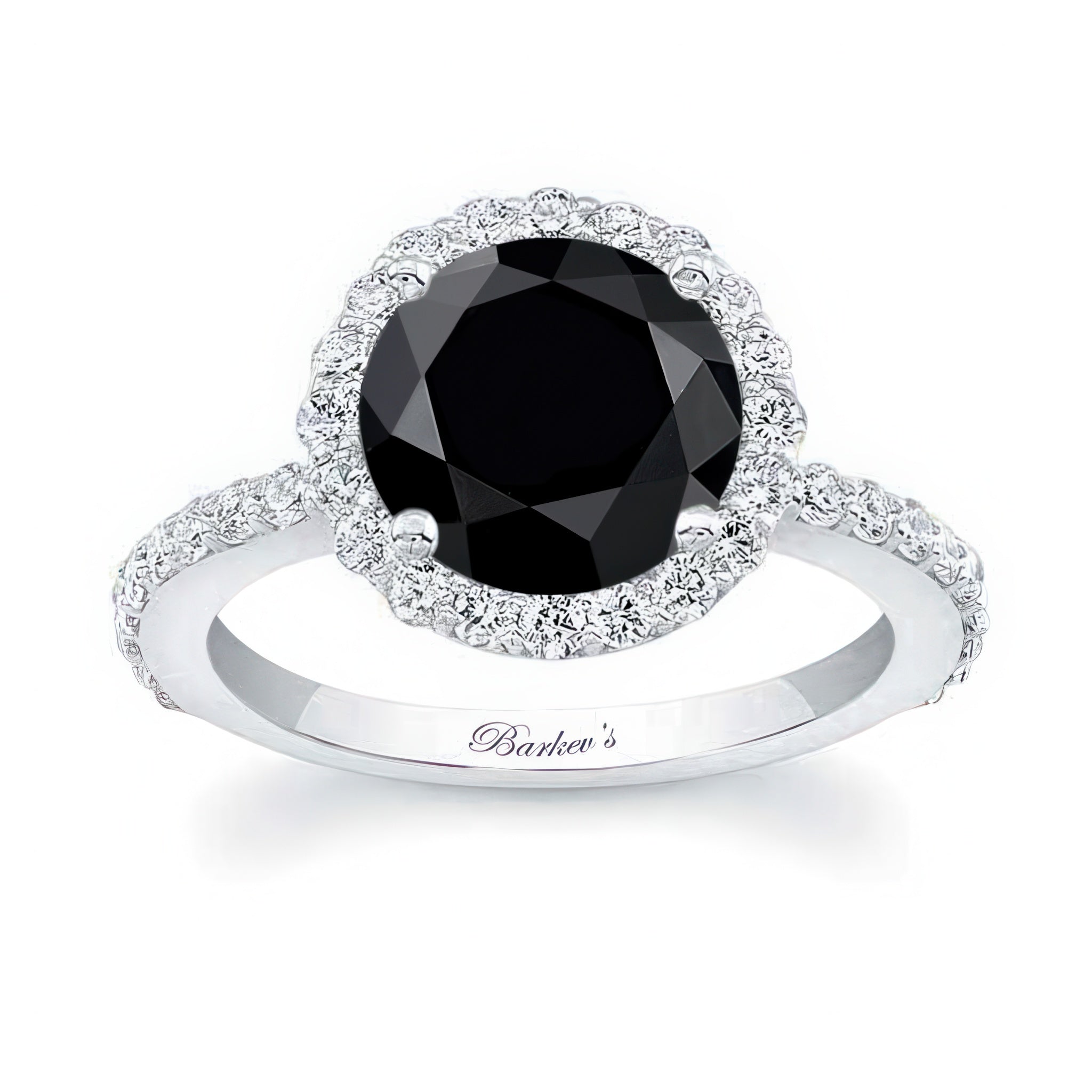 This 2 carat halo black and white diamond engagement ring features shared prong set diamonds around the center and more cascading down the shank for a look of sheer elegance.