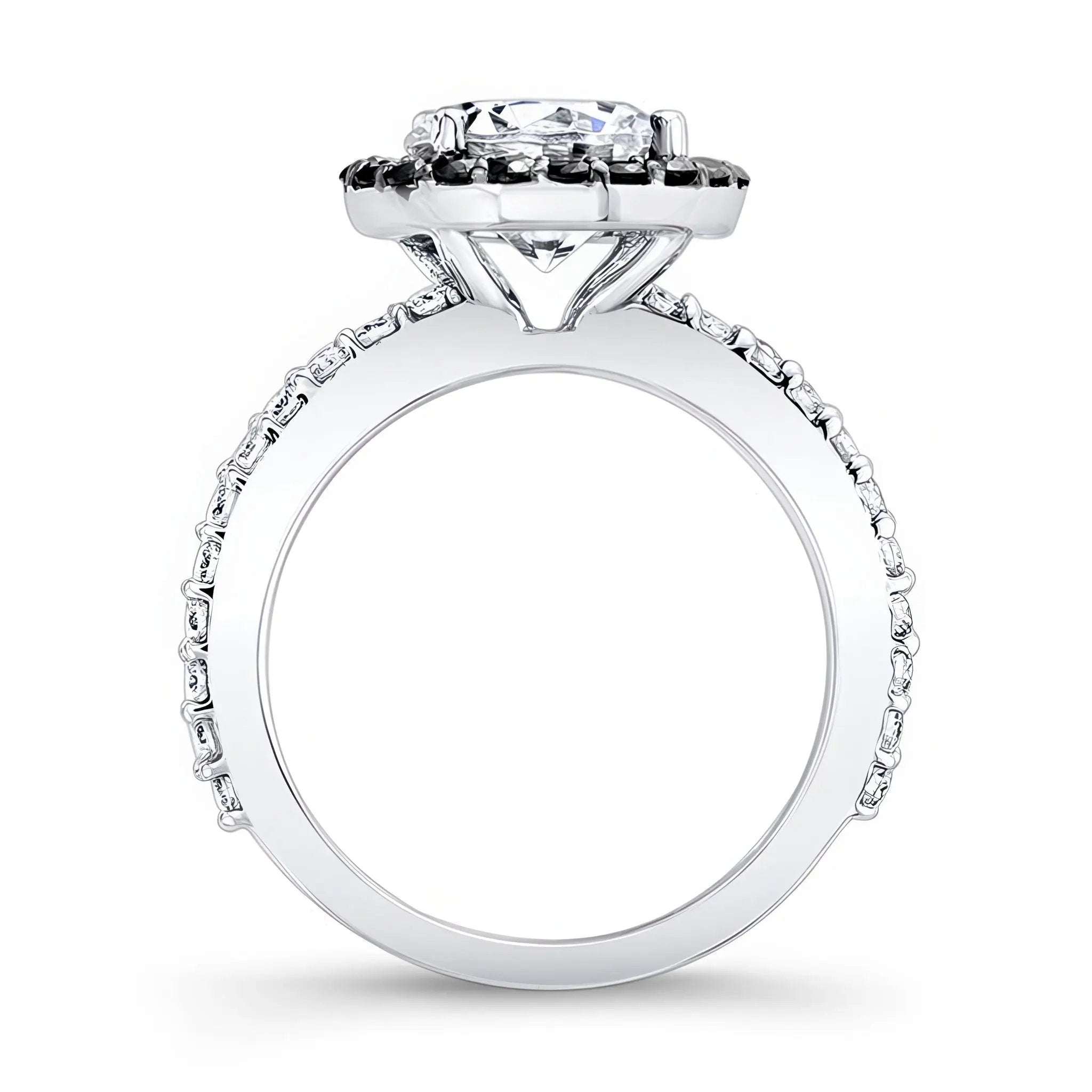 This 2 carat lab grown diamond halo engagement ring with black diamonds features shared prong set black diamonds around the center and white diamonds cascading down the shank for a look of sheer elegance.