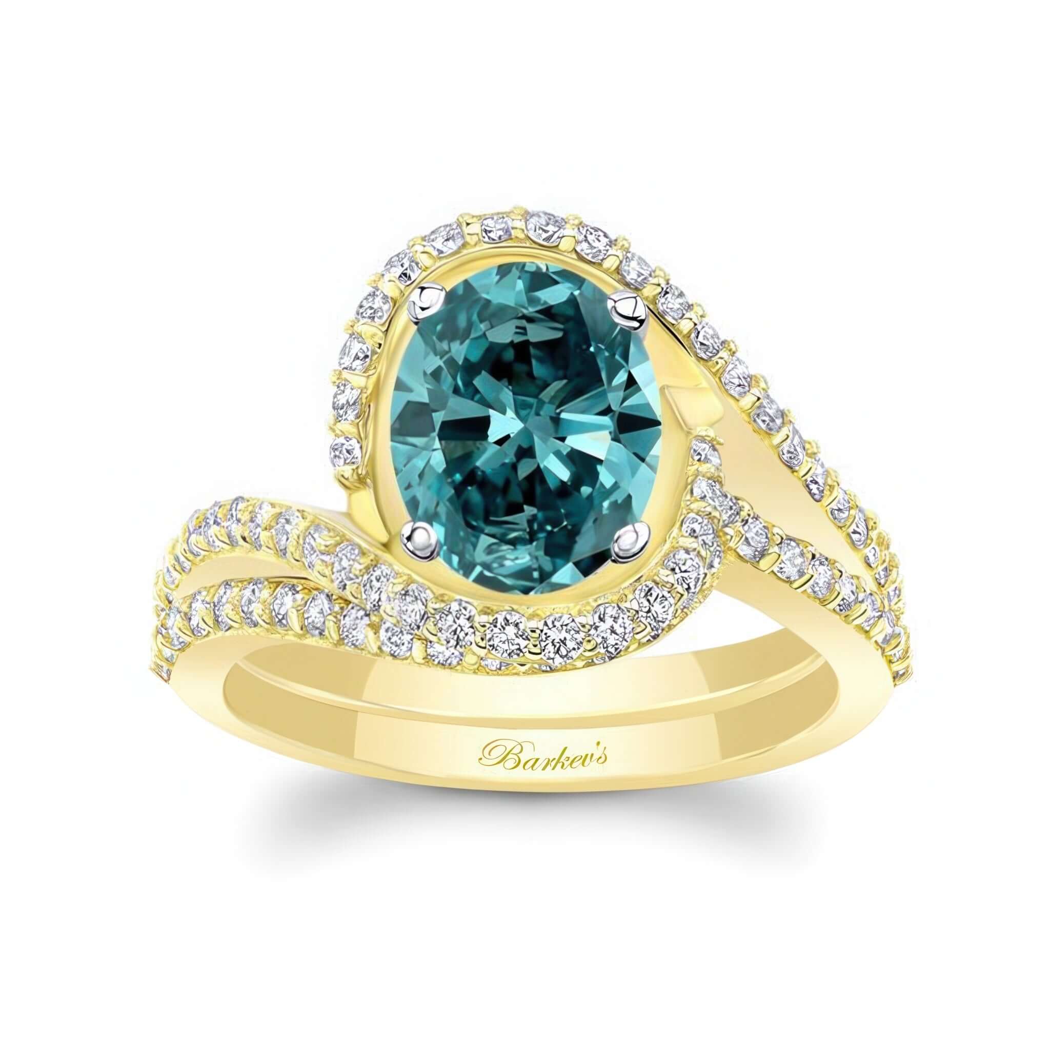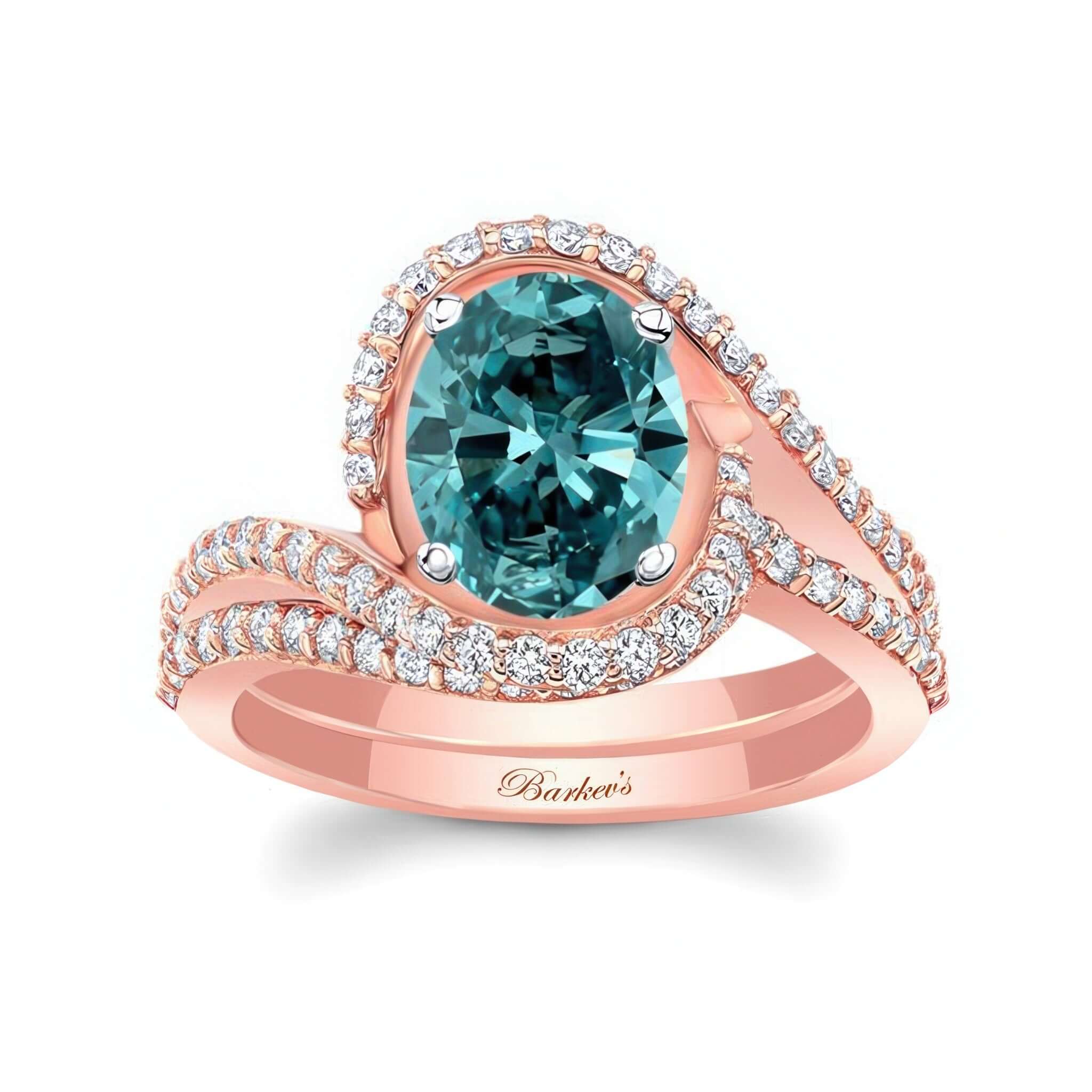 This 2 carat oval blue and white diamond wedding ring set features a split shank that curves around the center stone, which is presented in a floating semi halo by pave diamonds that cascade down the shoulders in a swirl.