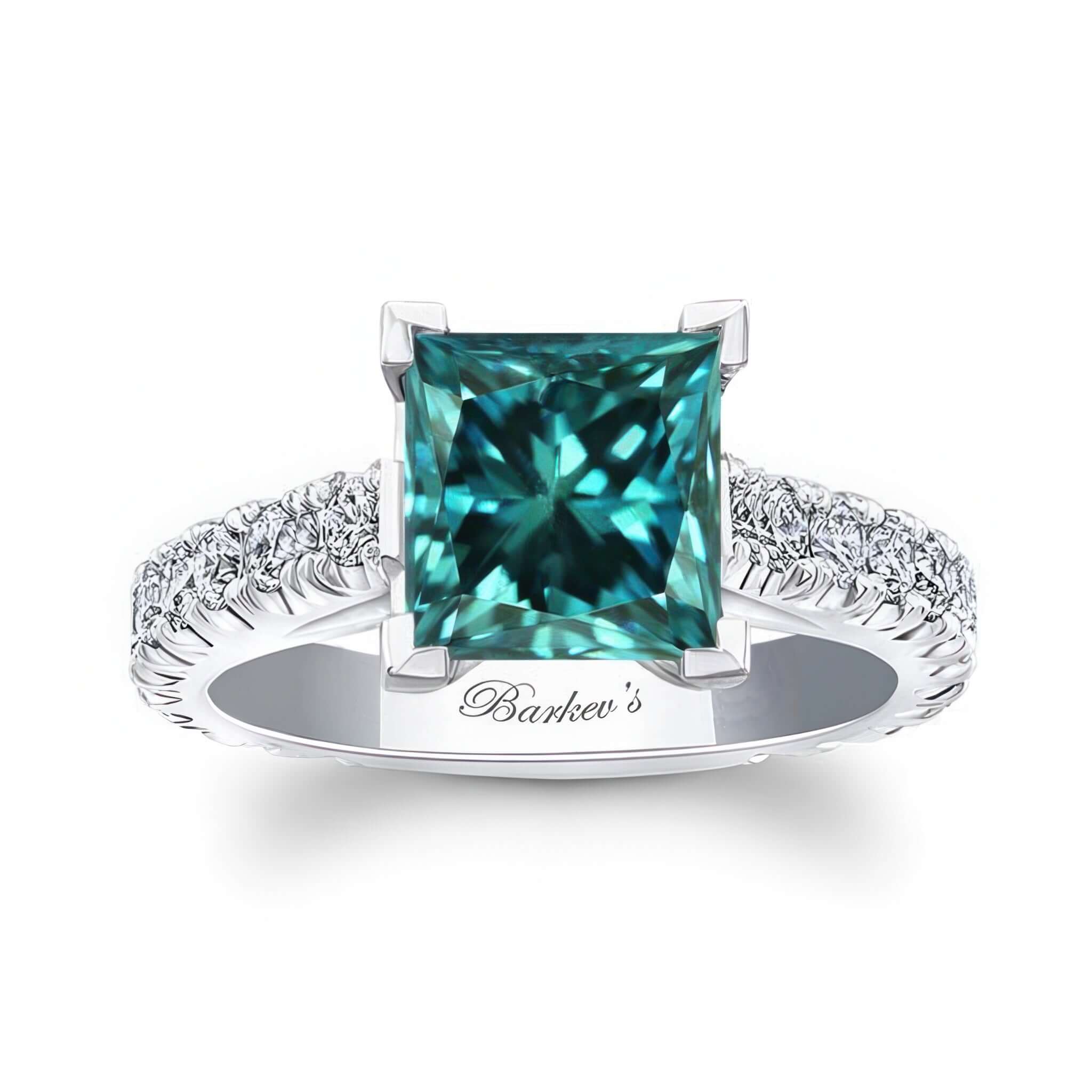 A Glamorous 2 carat princess cut blue diamond ring featuring a stunning large center with a river of side diamonds flowing on the shank for a show stopping look.