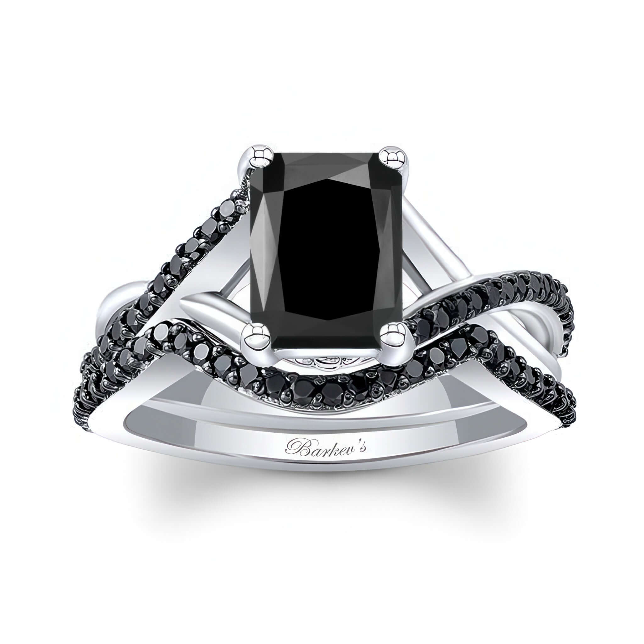 This 2 carat radiant cut black diamond ring set will turn heads with it's overlapping black diamond shank, large center stone and flower motif. Comes with a black diamond wedding band.