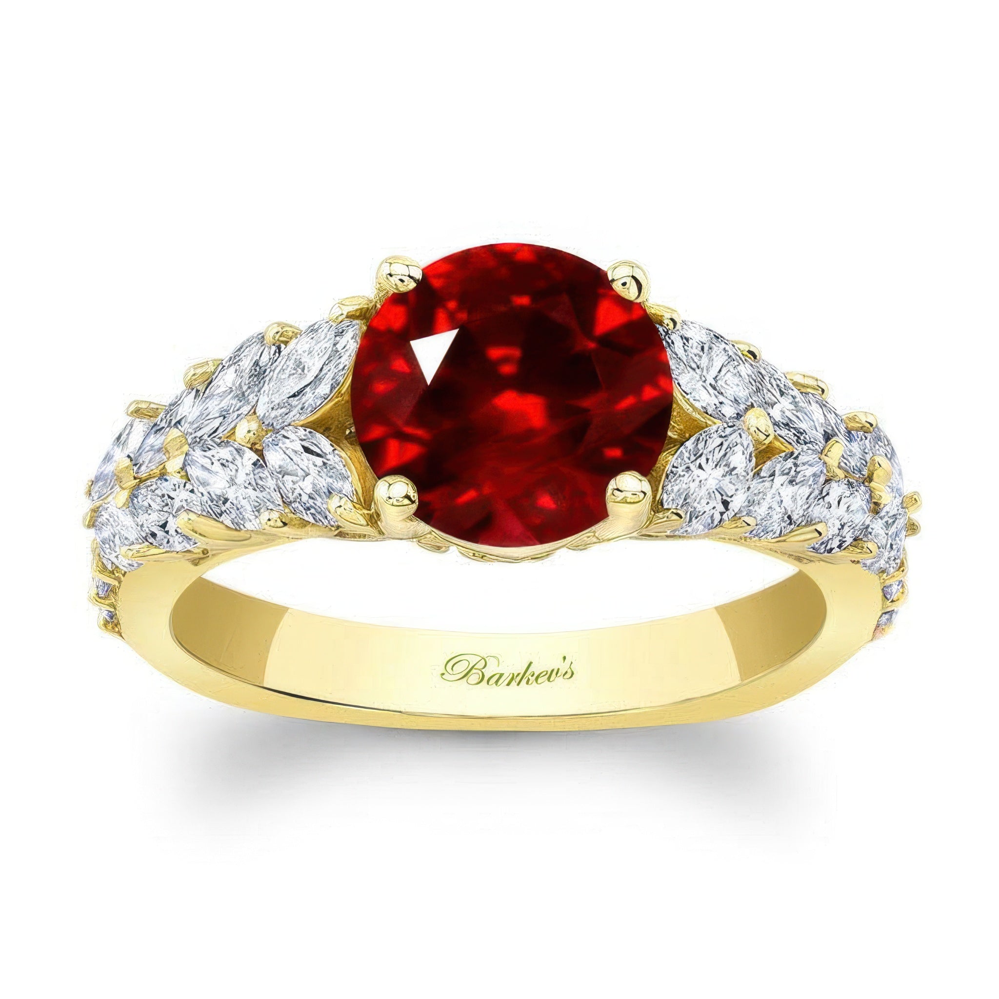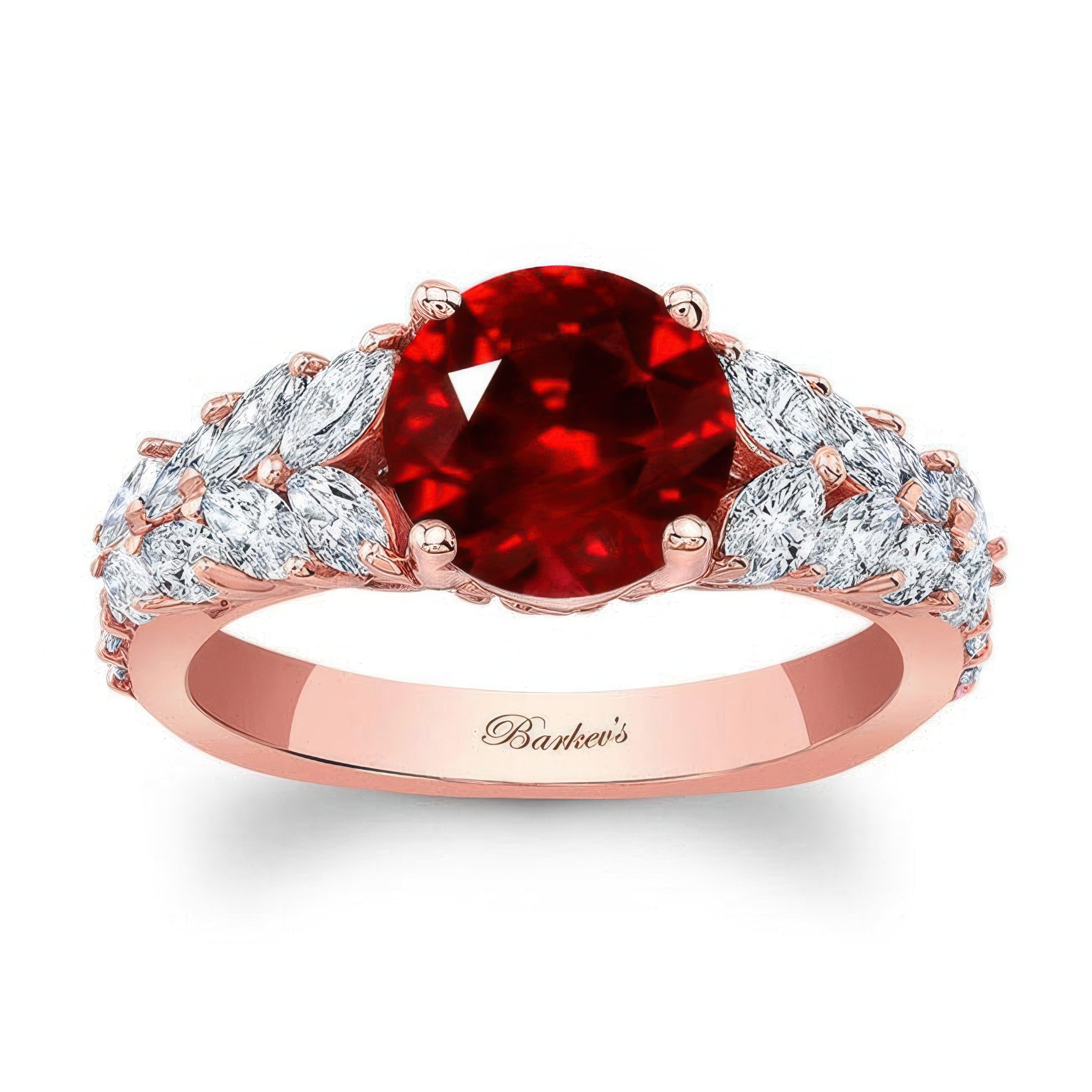 This 2 carat round ruby and diamond engagement ring features a prong set center with graduating marquise cut diamonds set on the shank in a chevron pattern and round diamonds right underneath for an elegant eye catching piece.