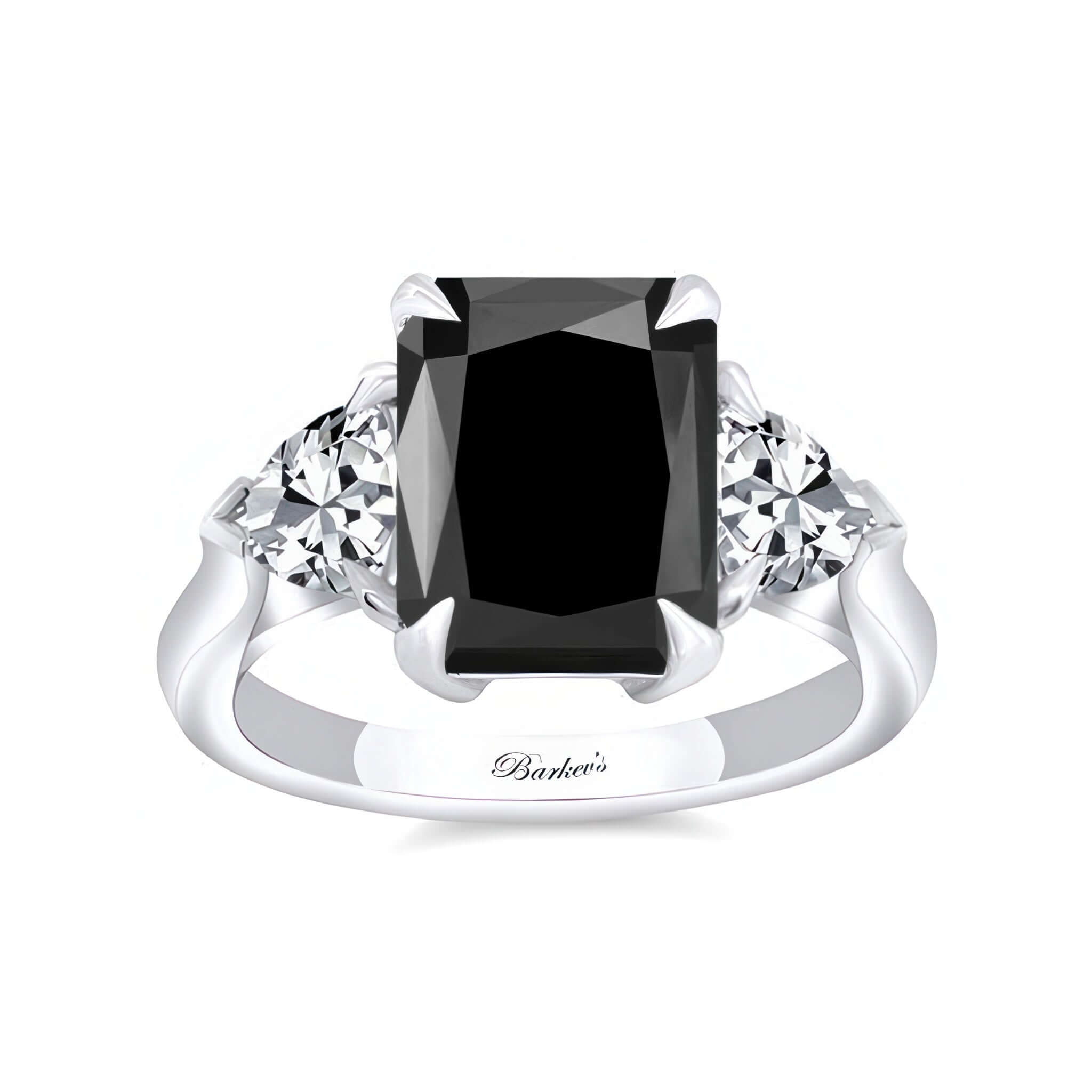 A beautiful 3.5 carat radiant cut black diamond ring featuring a three stone design and trillion cut diamonds on each side of the center for a unique look.